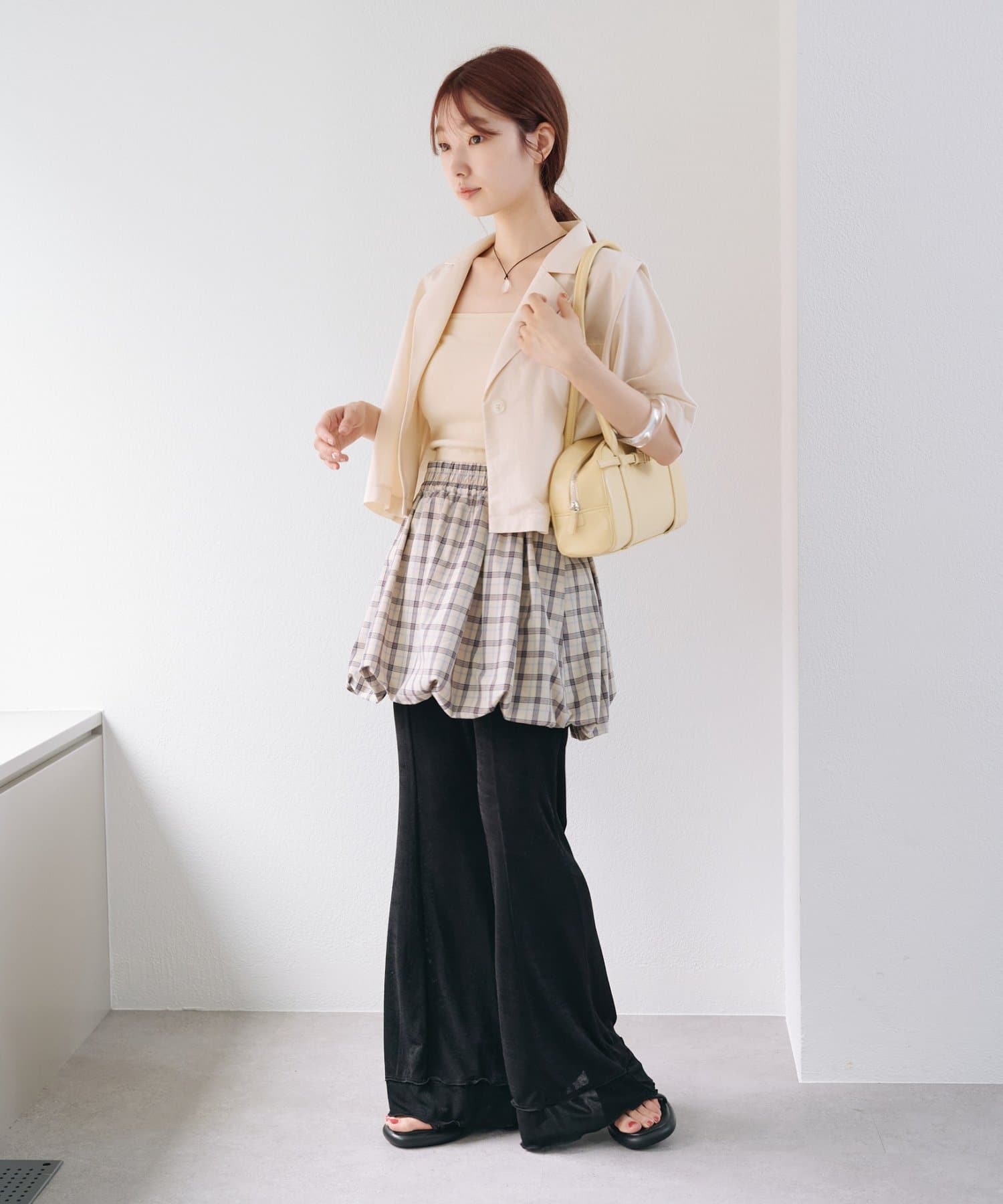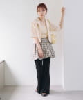 上半身にボリュームのあるトップスを着た時に合わせると、すっきりとした印象に。