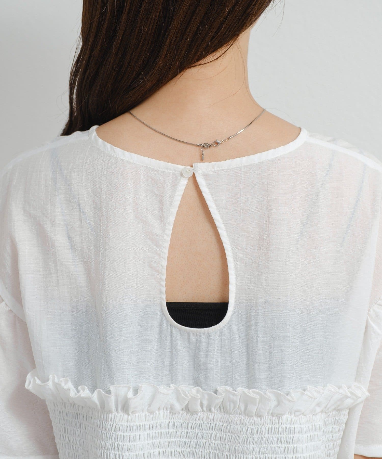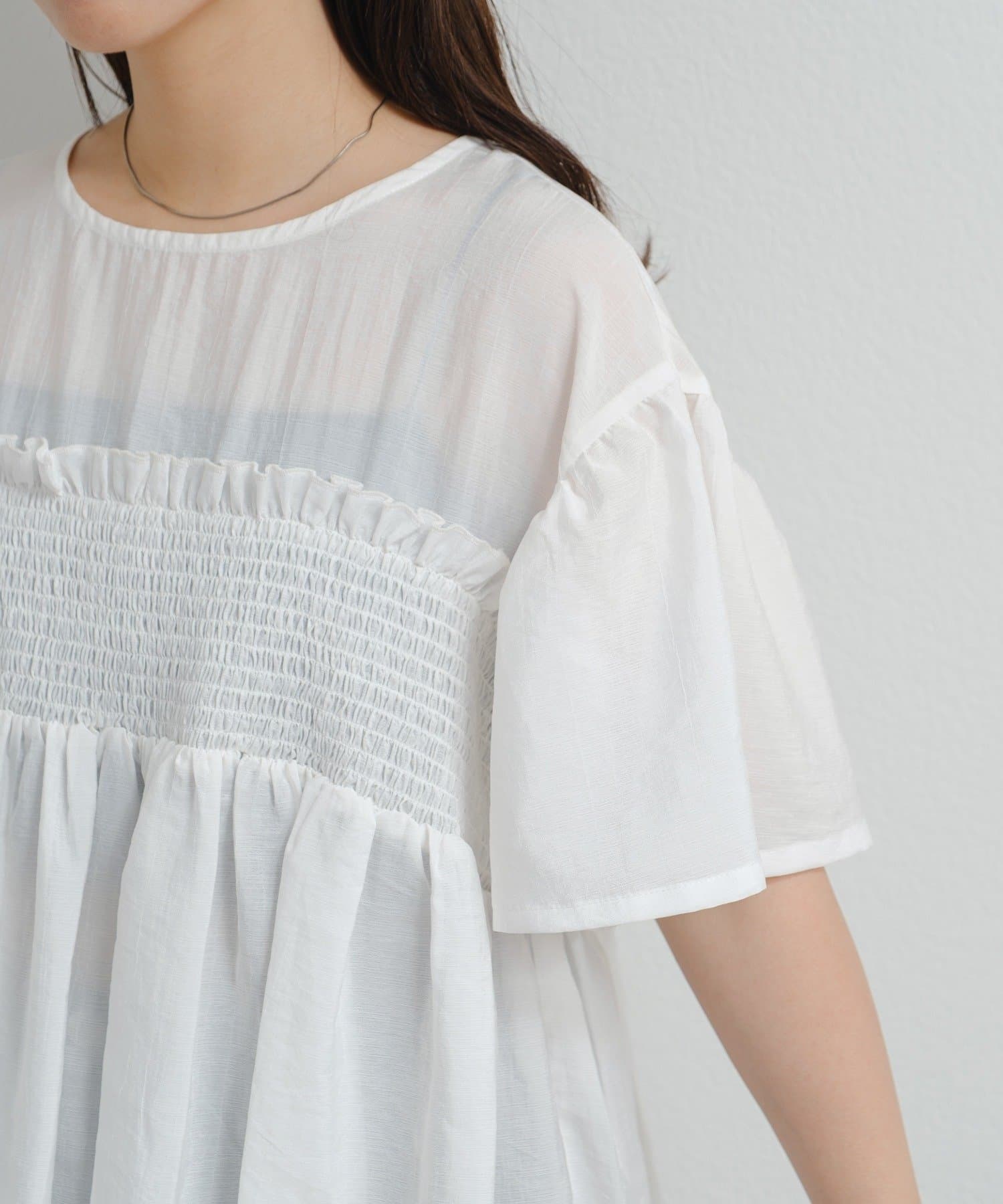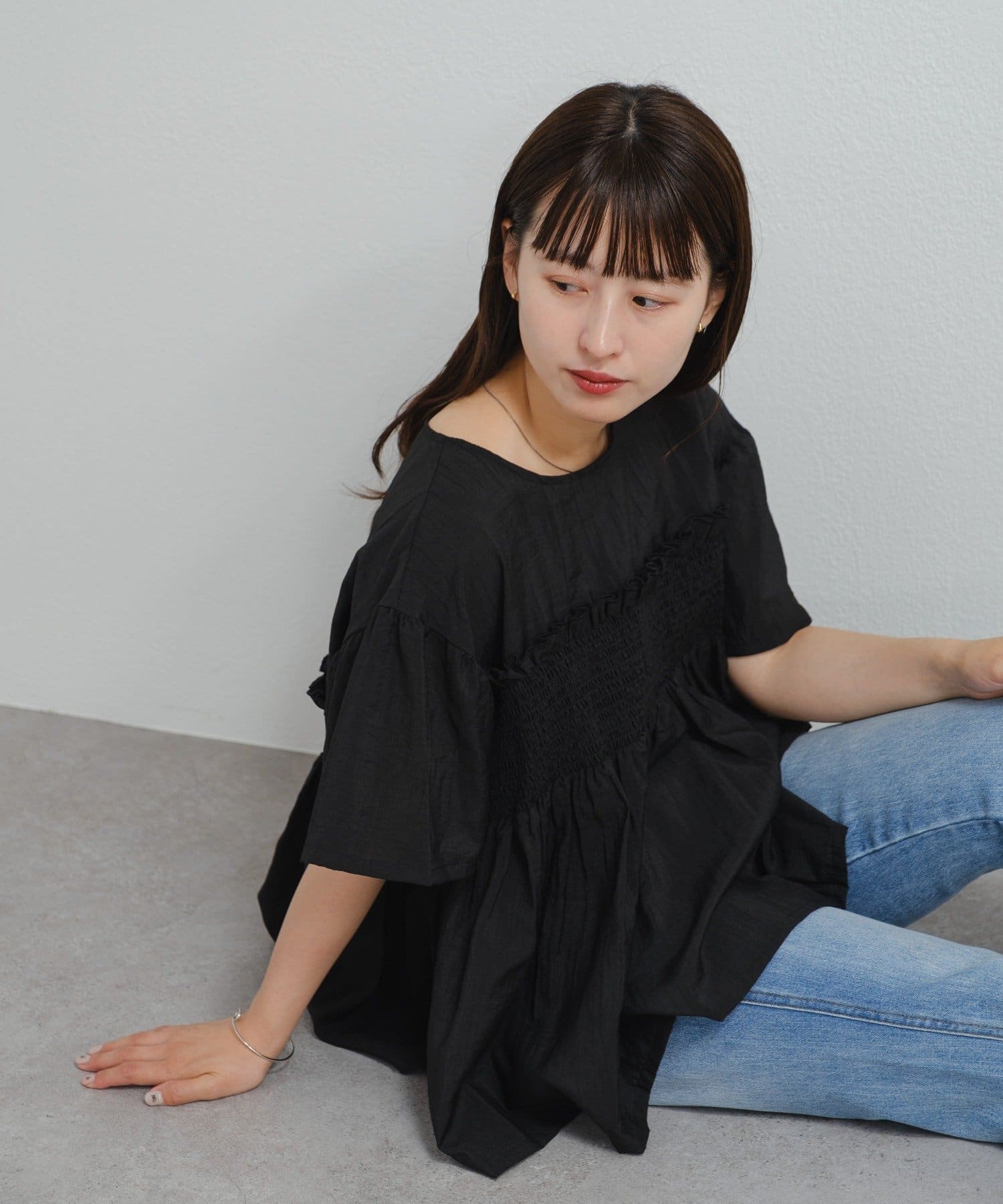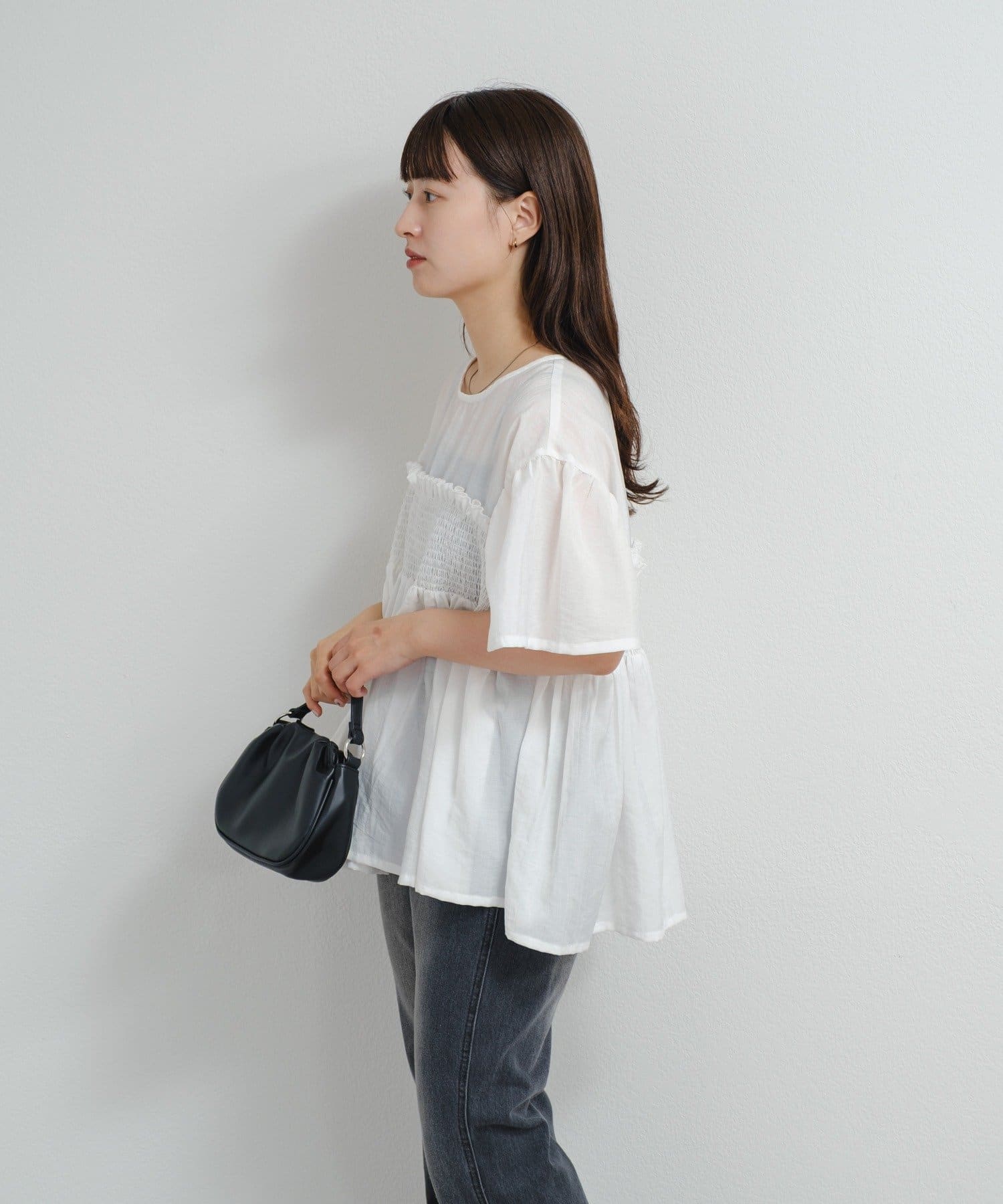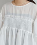 胸元のシャーリングデザインですっきりとした印象も与えられます。