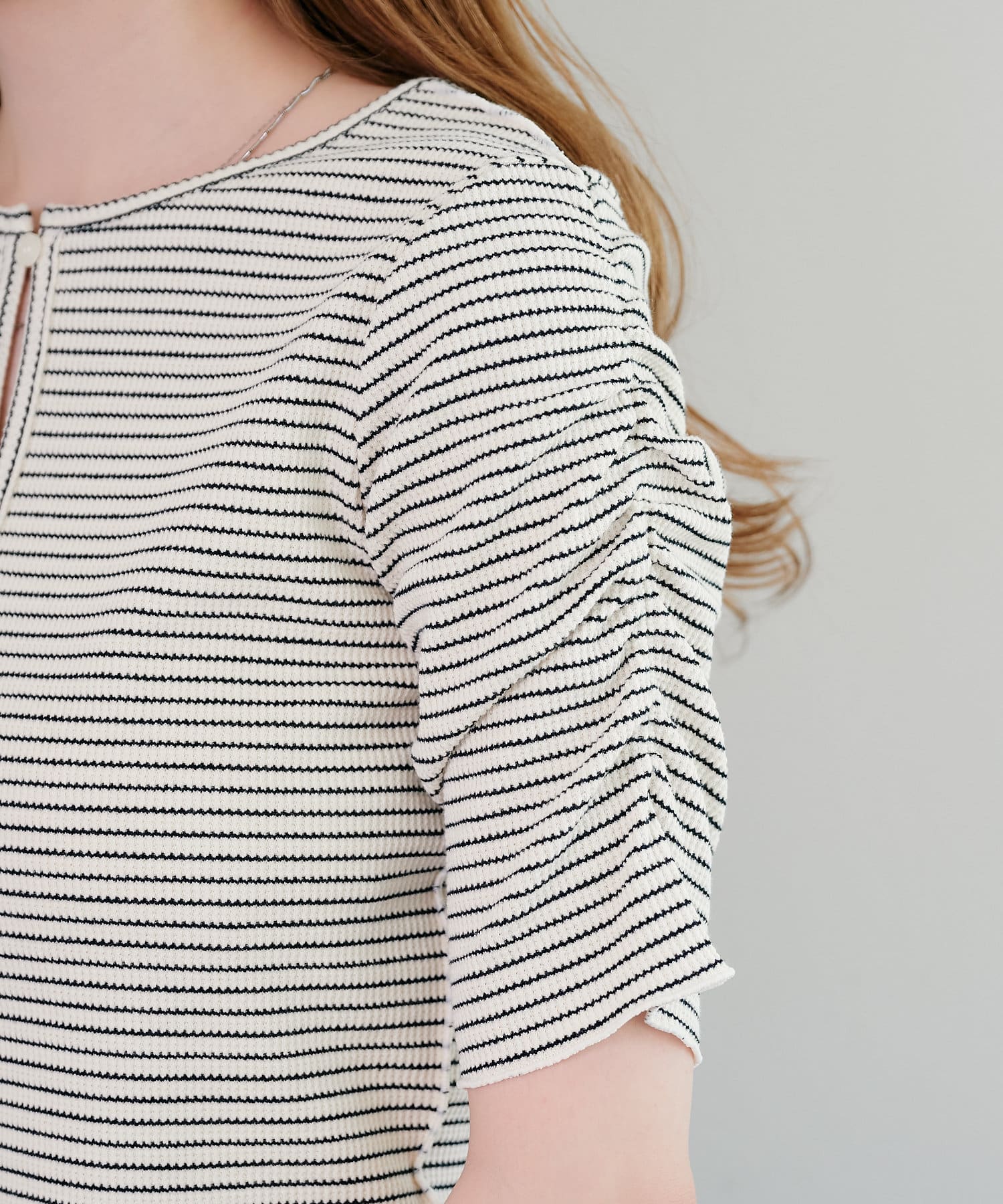 シャーリングの部分が二の腕をカバーしてくれるので、着痩せ効果が嬉しいポイント。