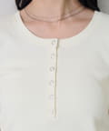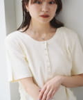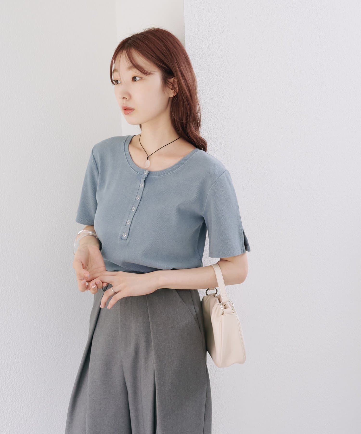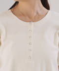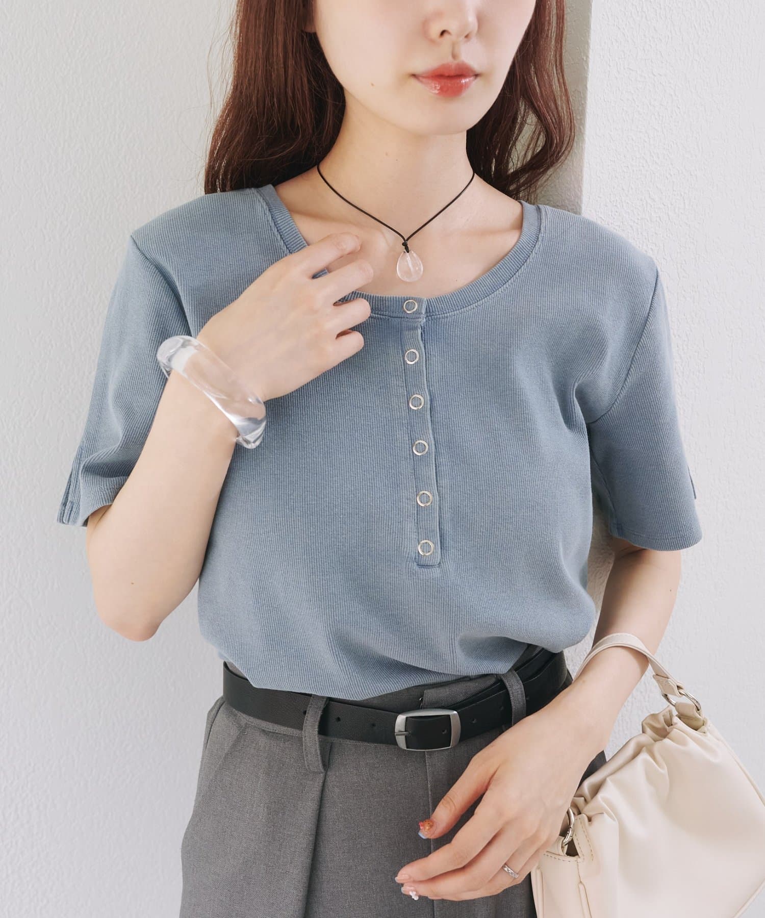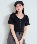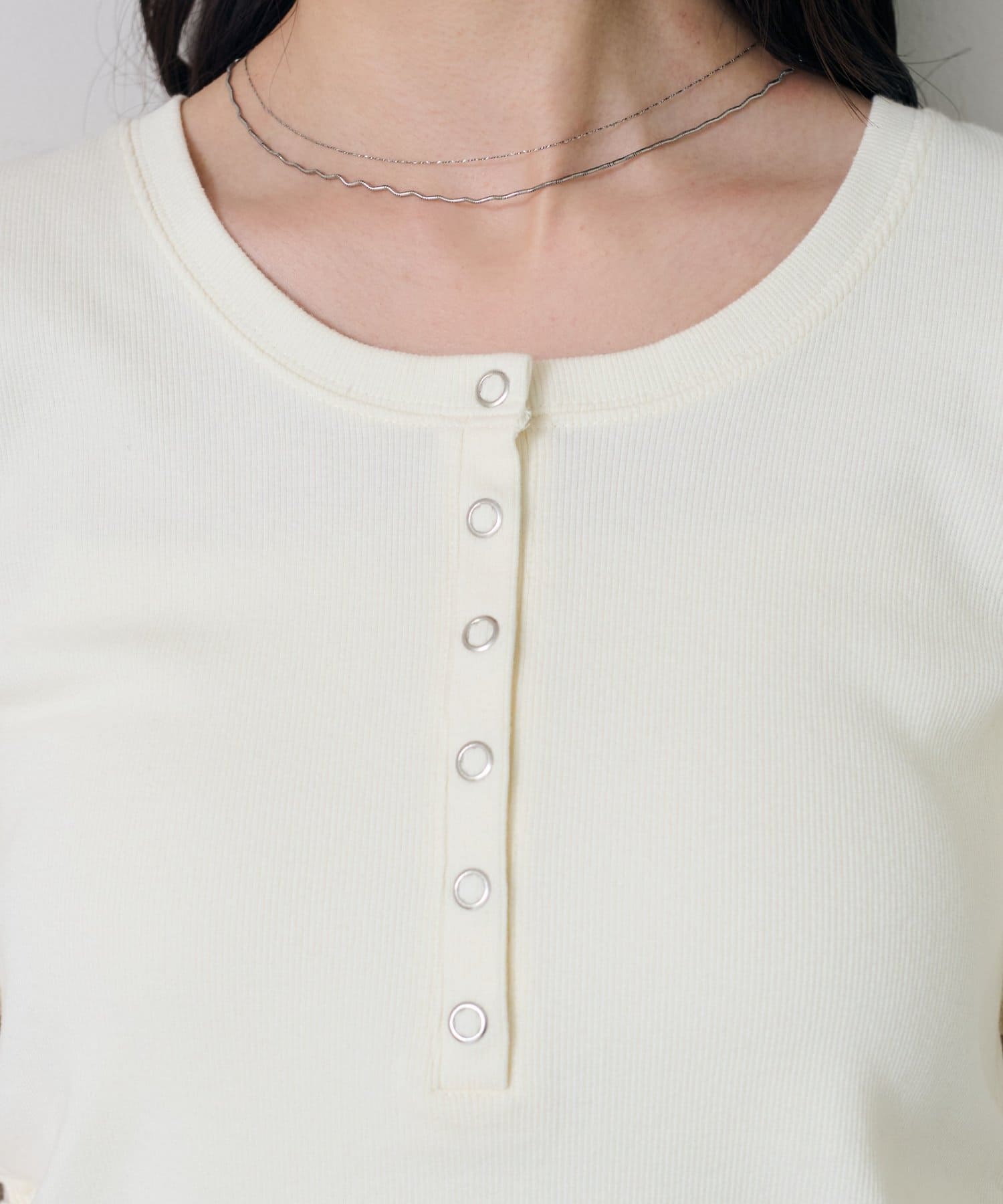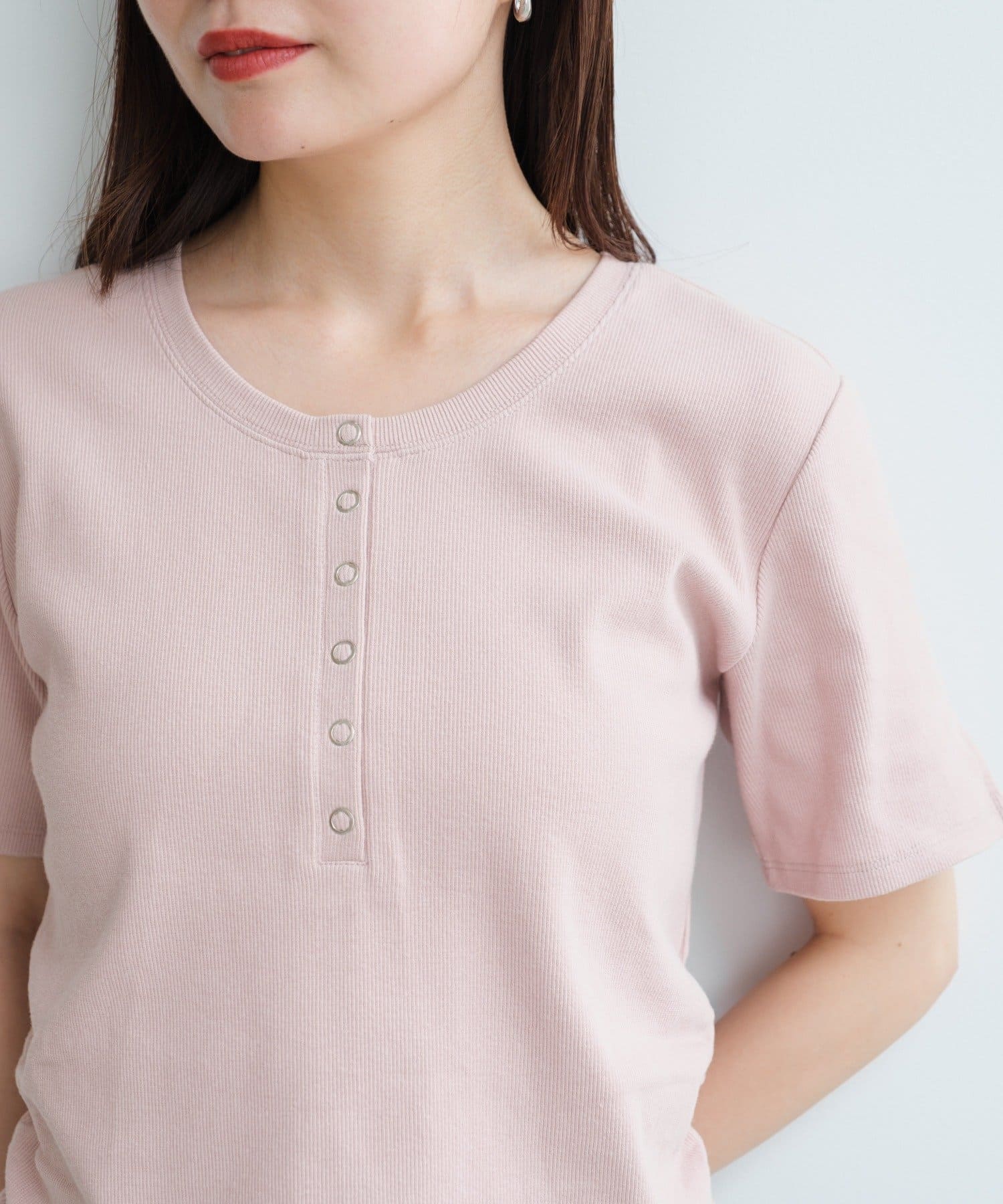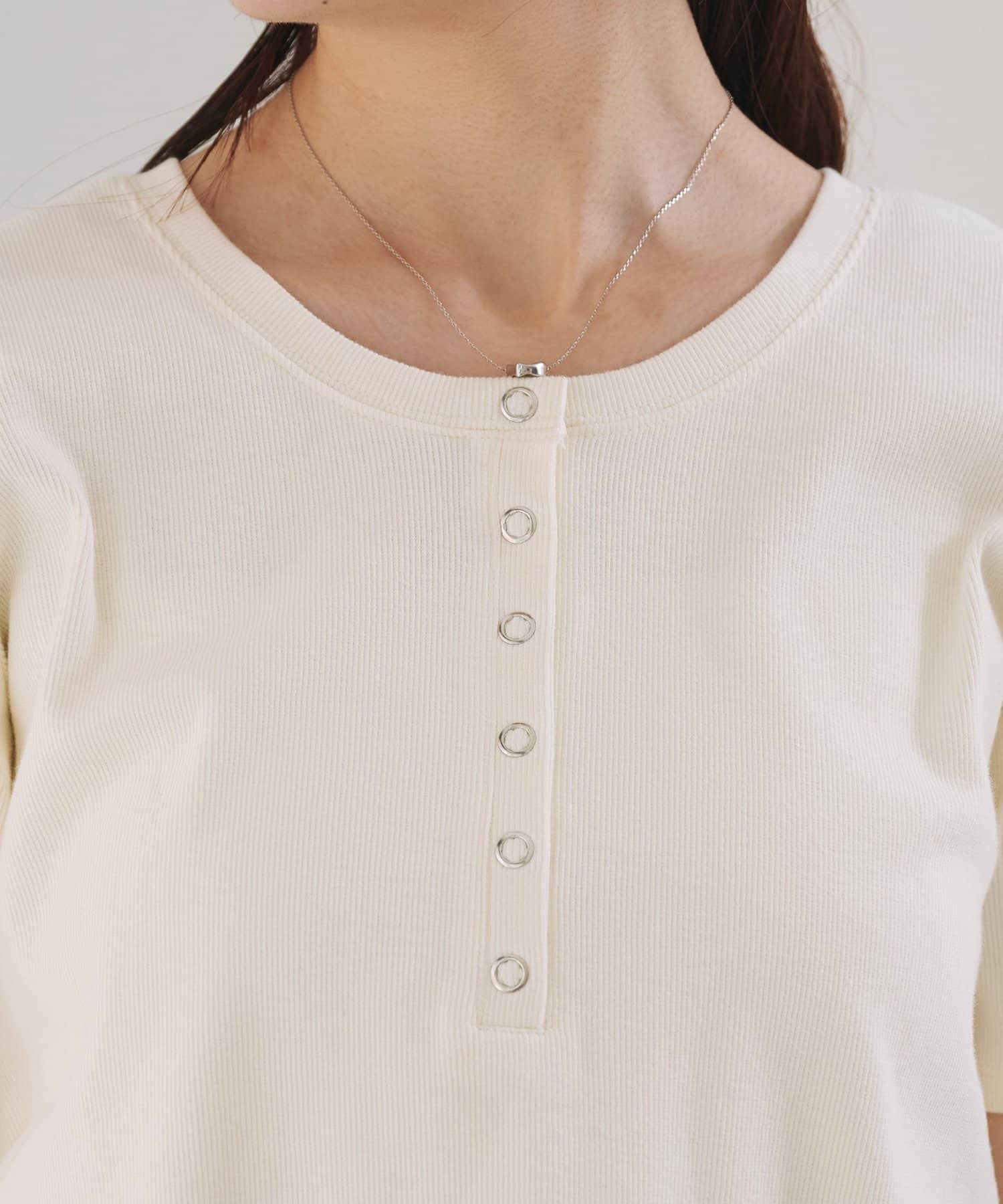首元のスナップボタンがシンプルな中にアクセントを加え、どんなボトムスとも相性抜群です。