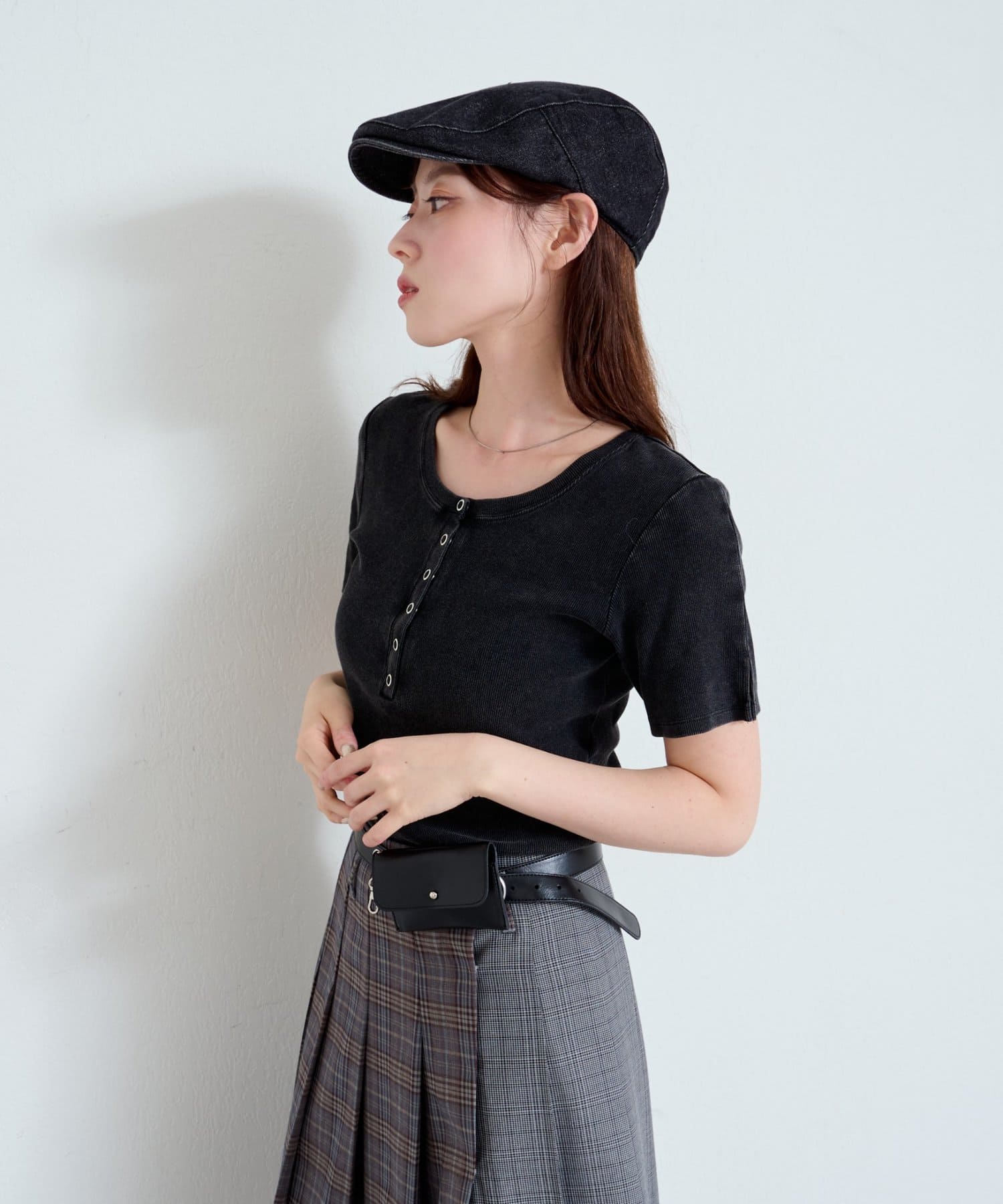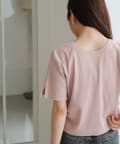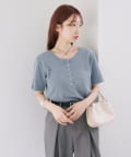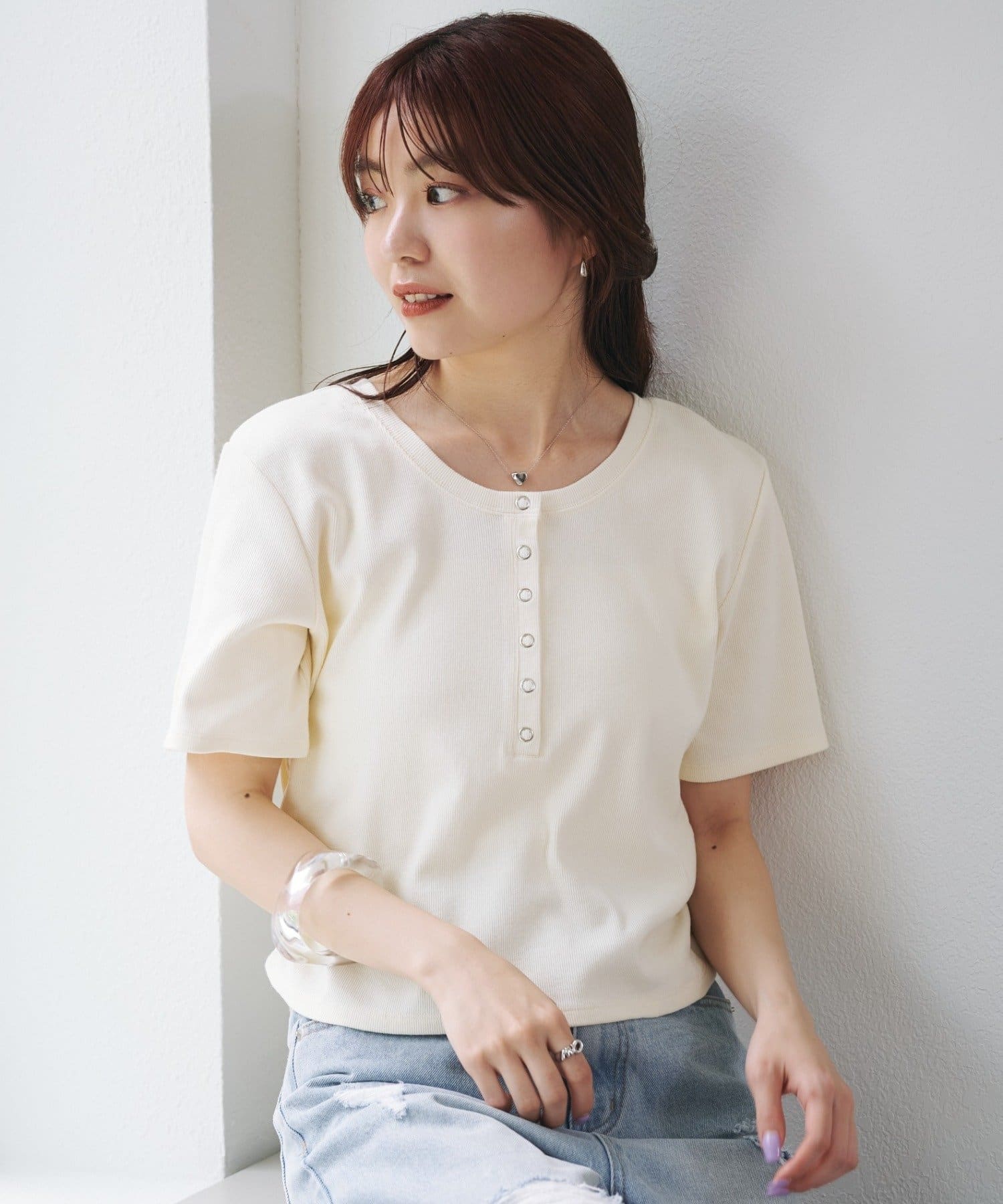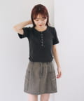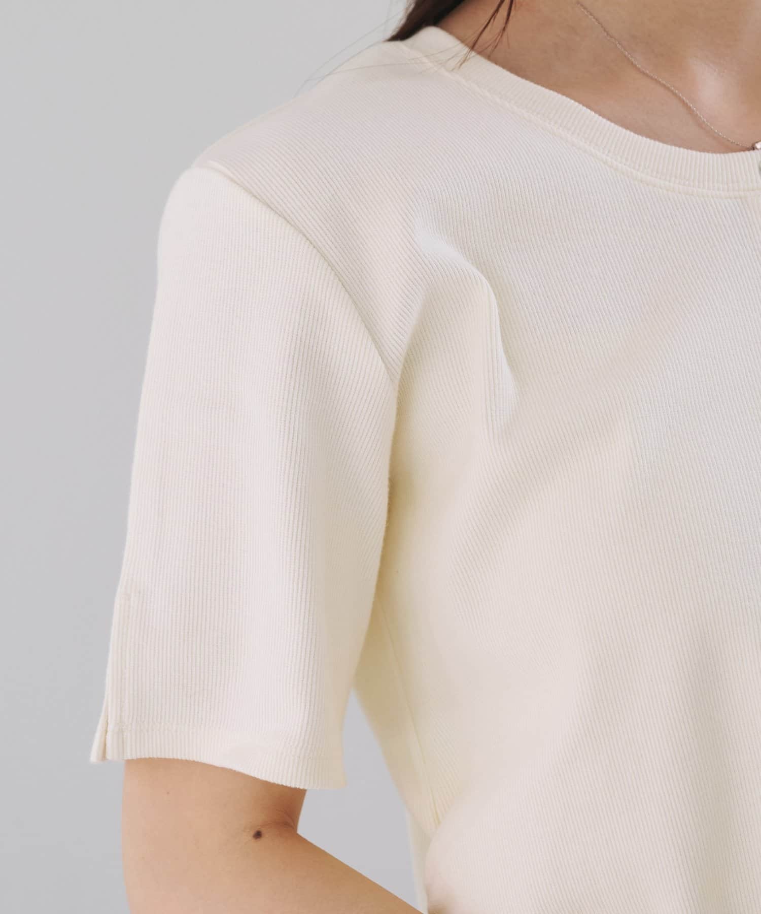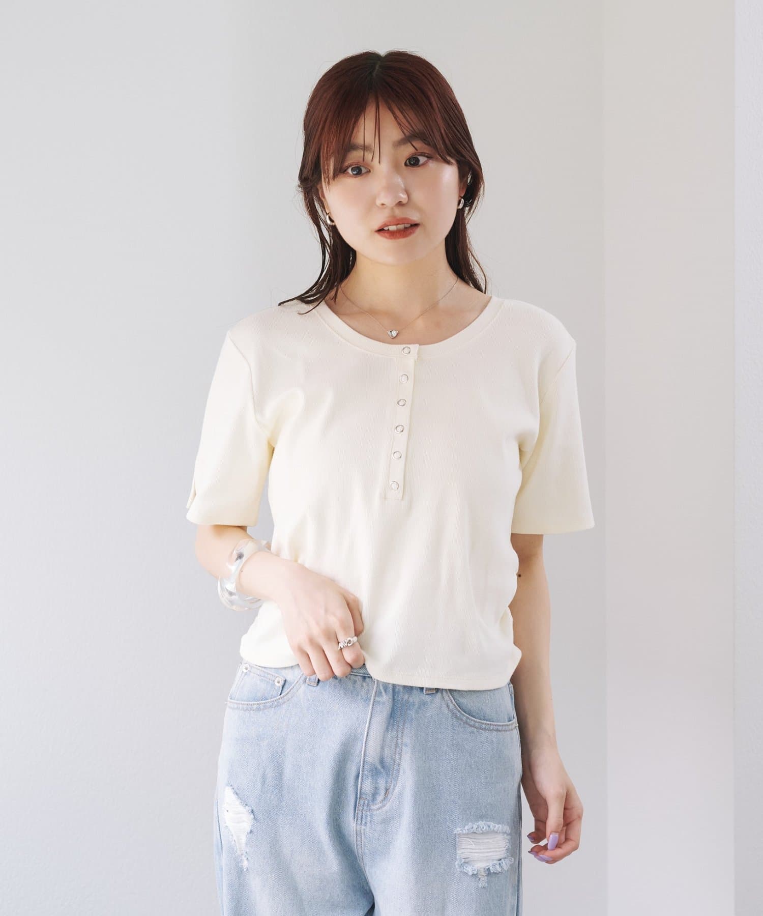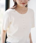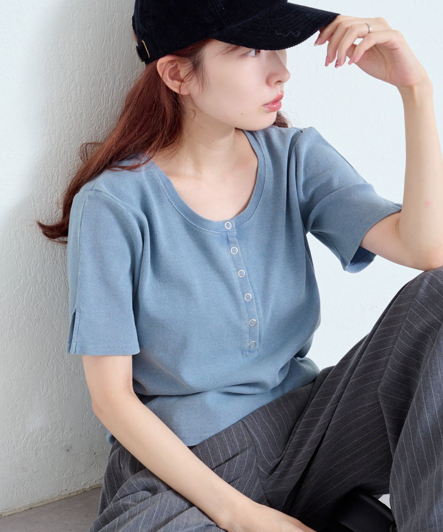 首元のスナップボタンがシンプルな中にアクセントを加え、どんなボトムスとも相性抜群です。