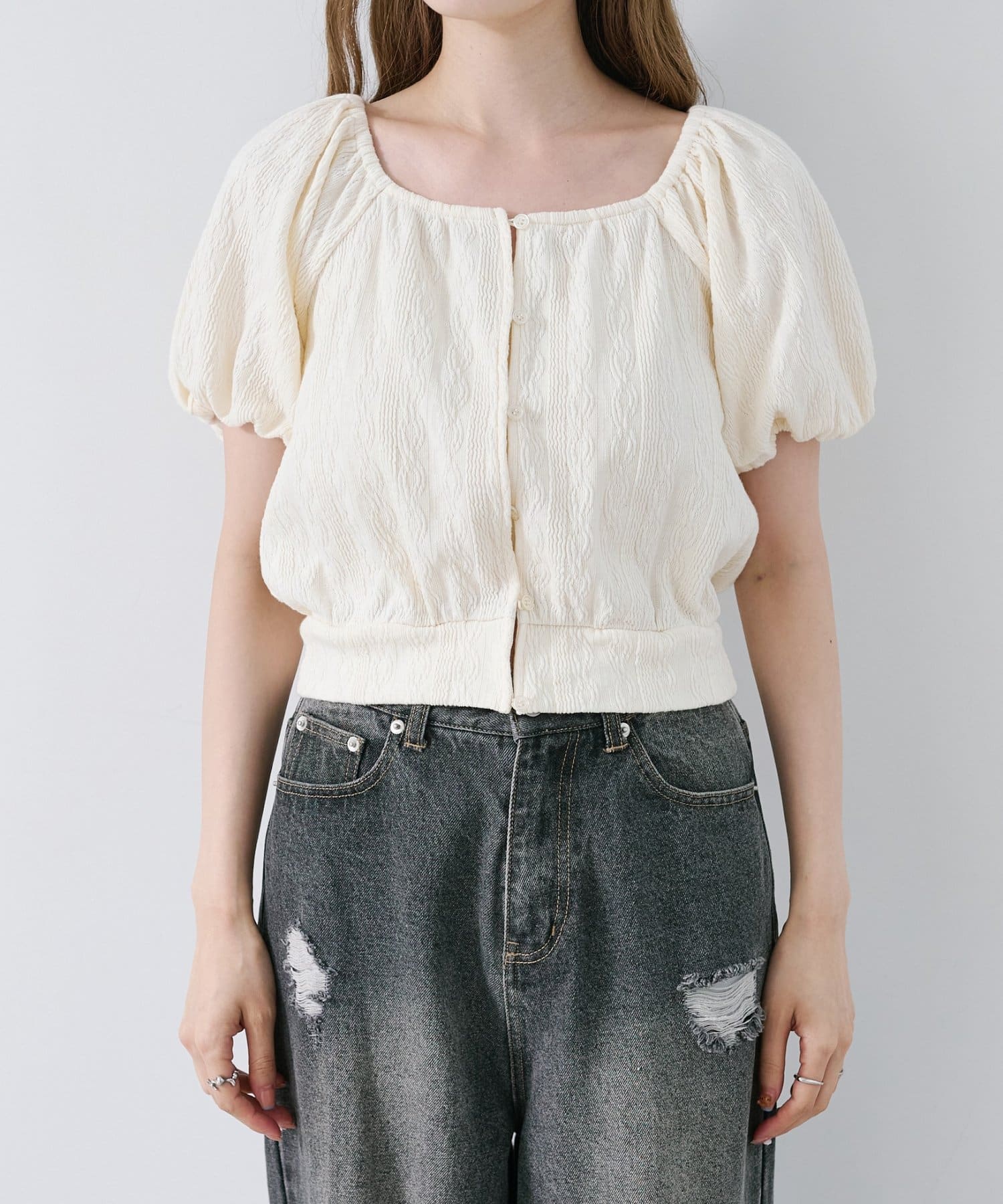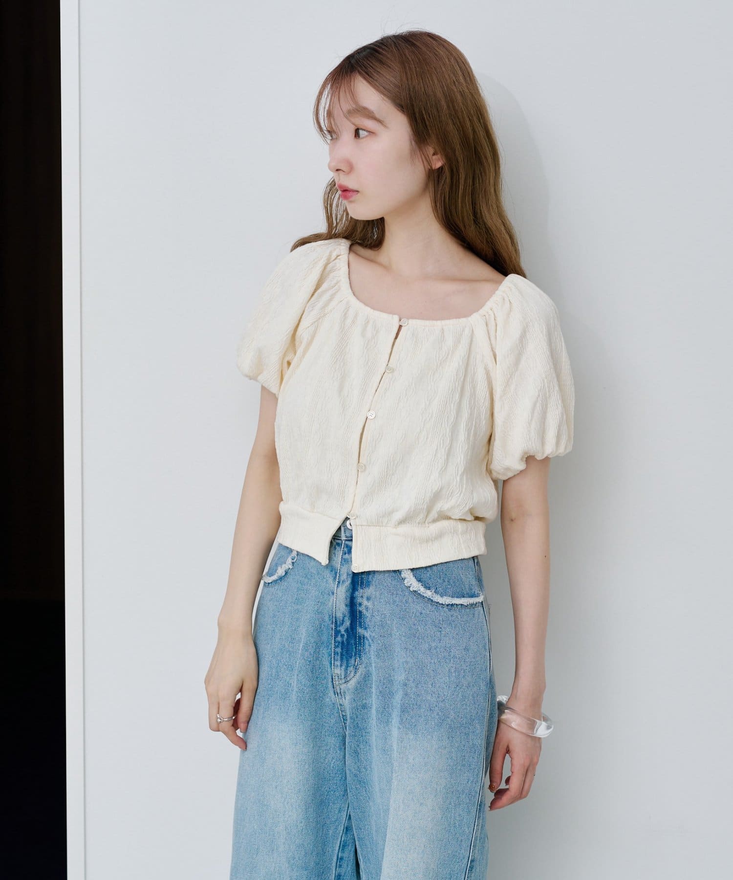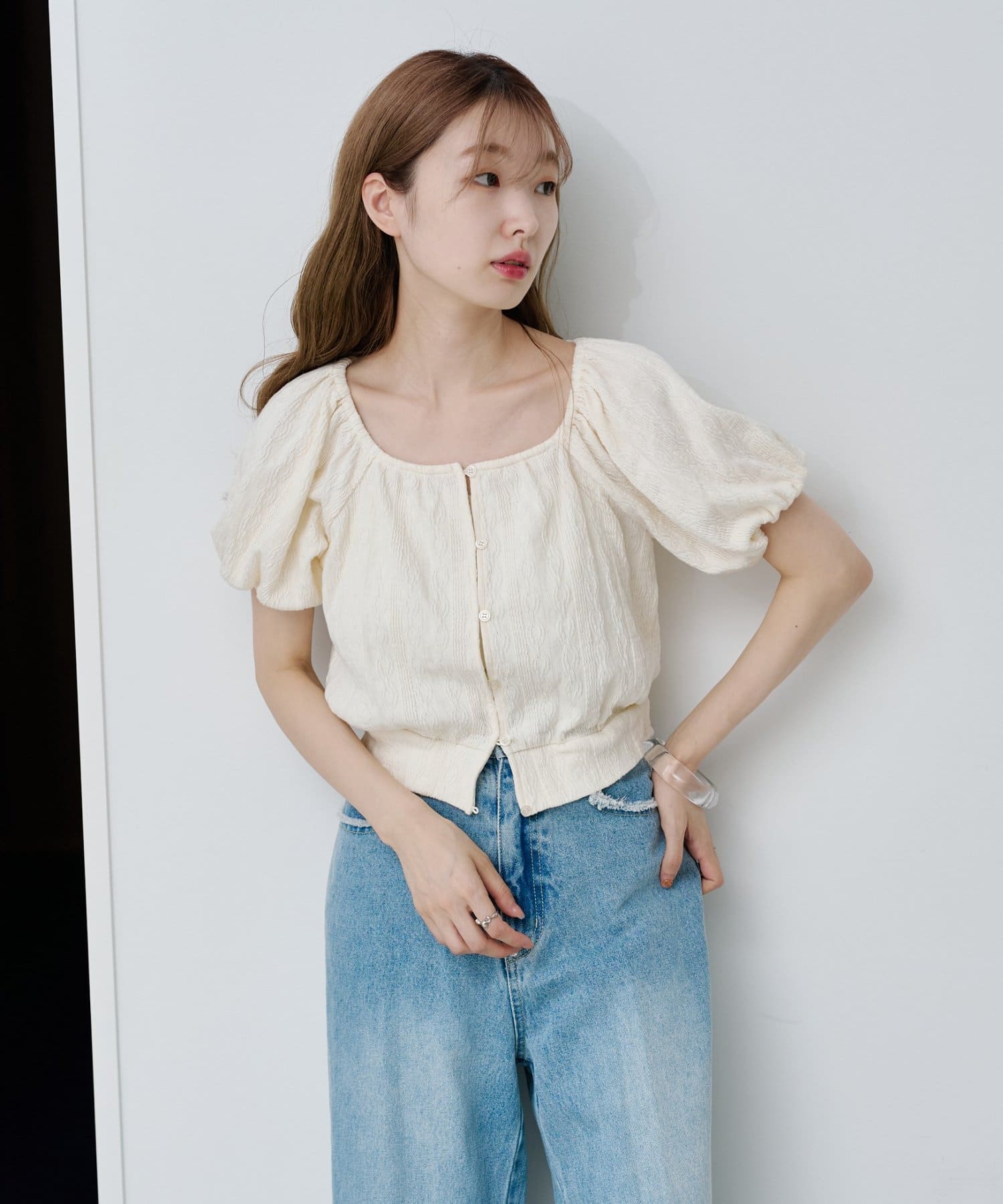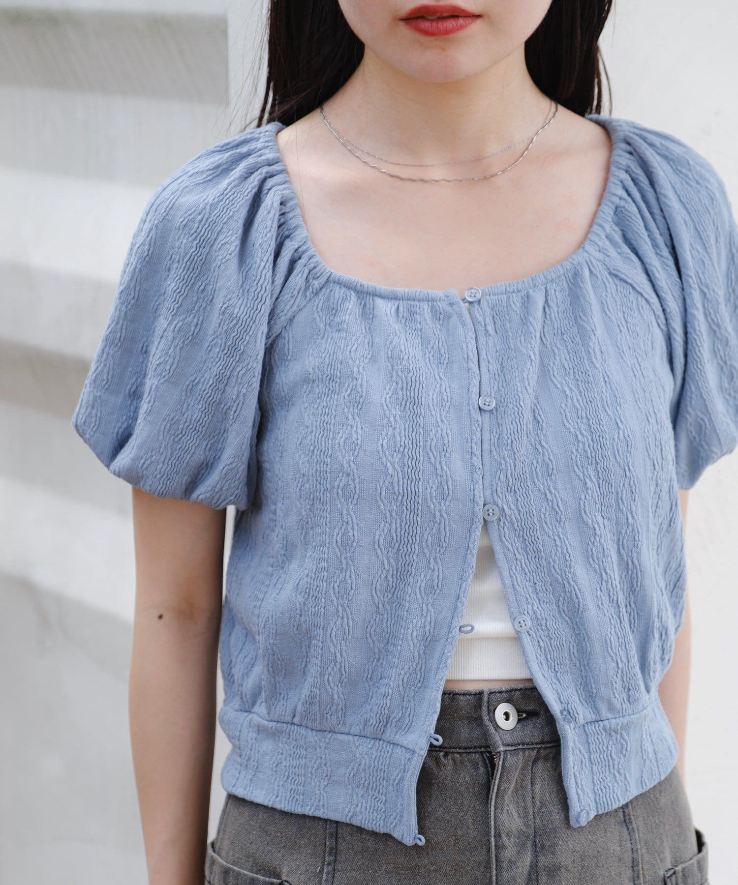 ボリューム感のあるパフスリーブで腕周りを華奢見えします。