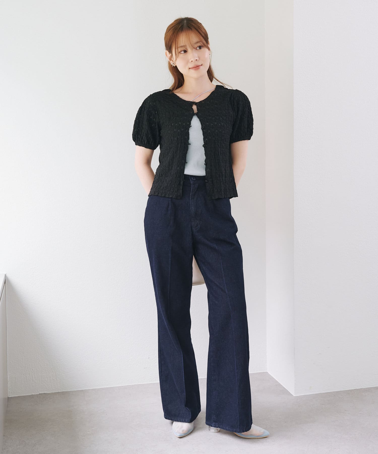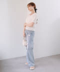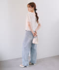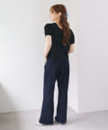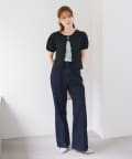 すっきりと着やせするトップスなので、ボリュームのあるボトムとの相性◎