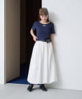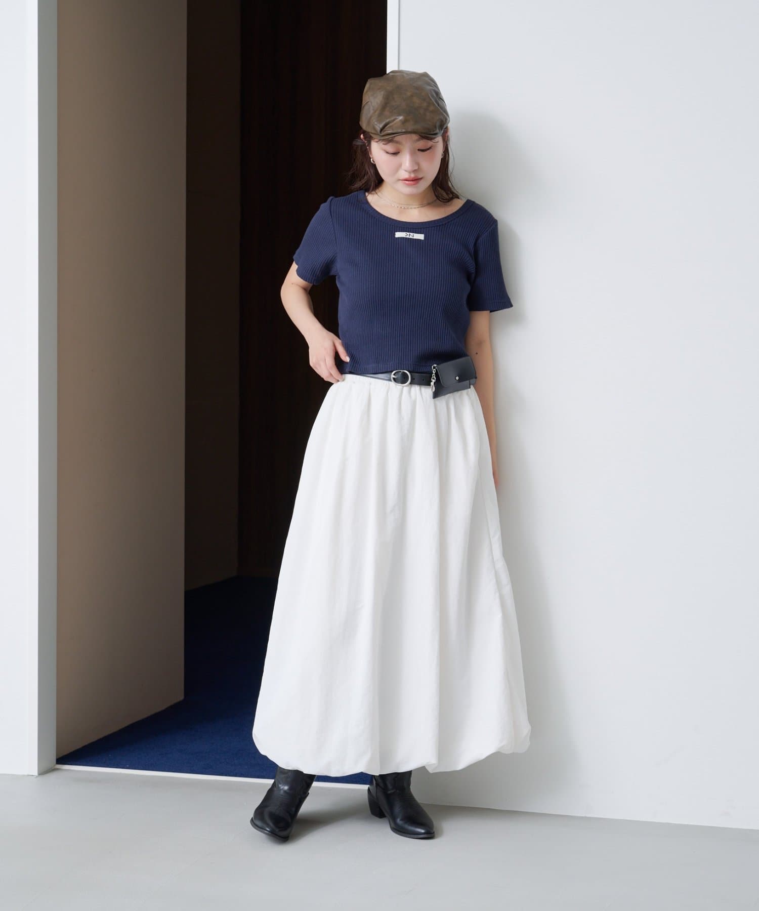 ふんわりとした白のバルーンスカートに、タイトなリブカットソーを合わせてメリハリのあるシルエットに。足元はスニーカーで軽やかさをプラスし、キャップやトートバッグでラフな雰囲気を演出。