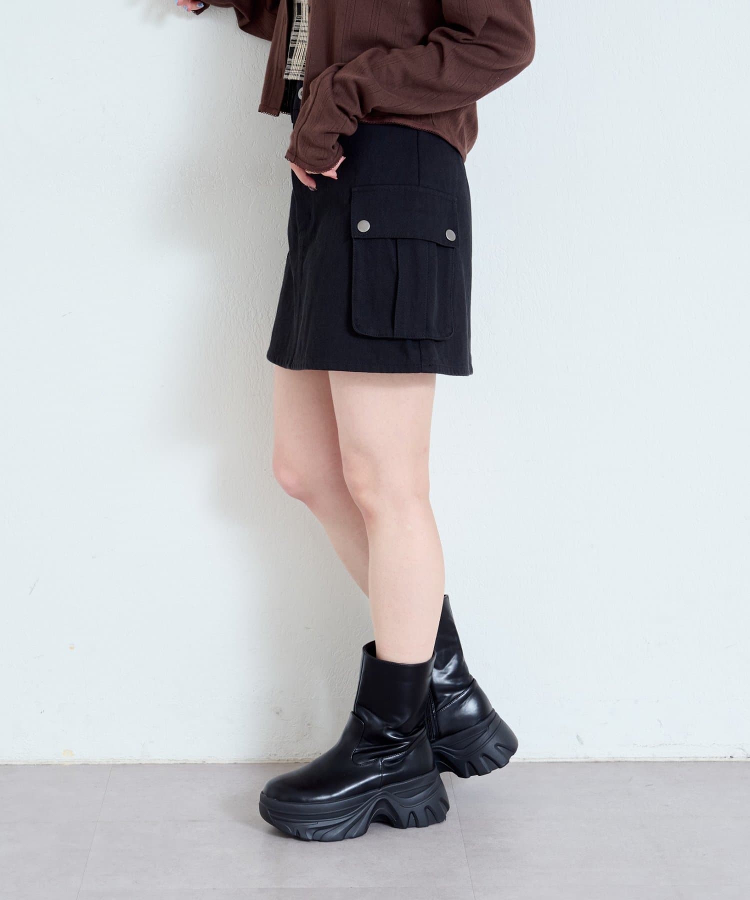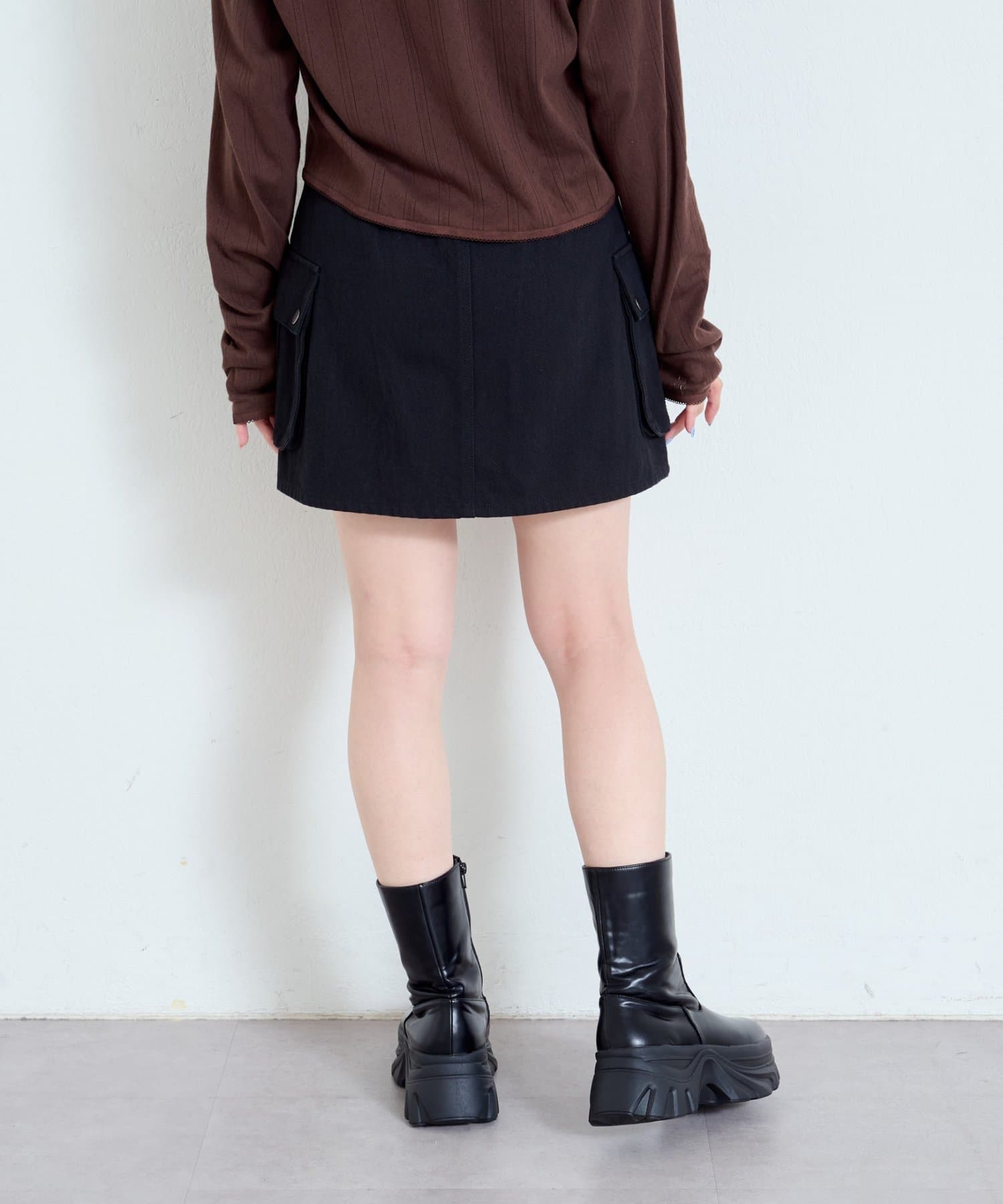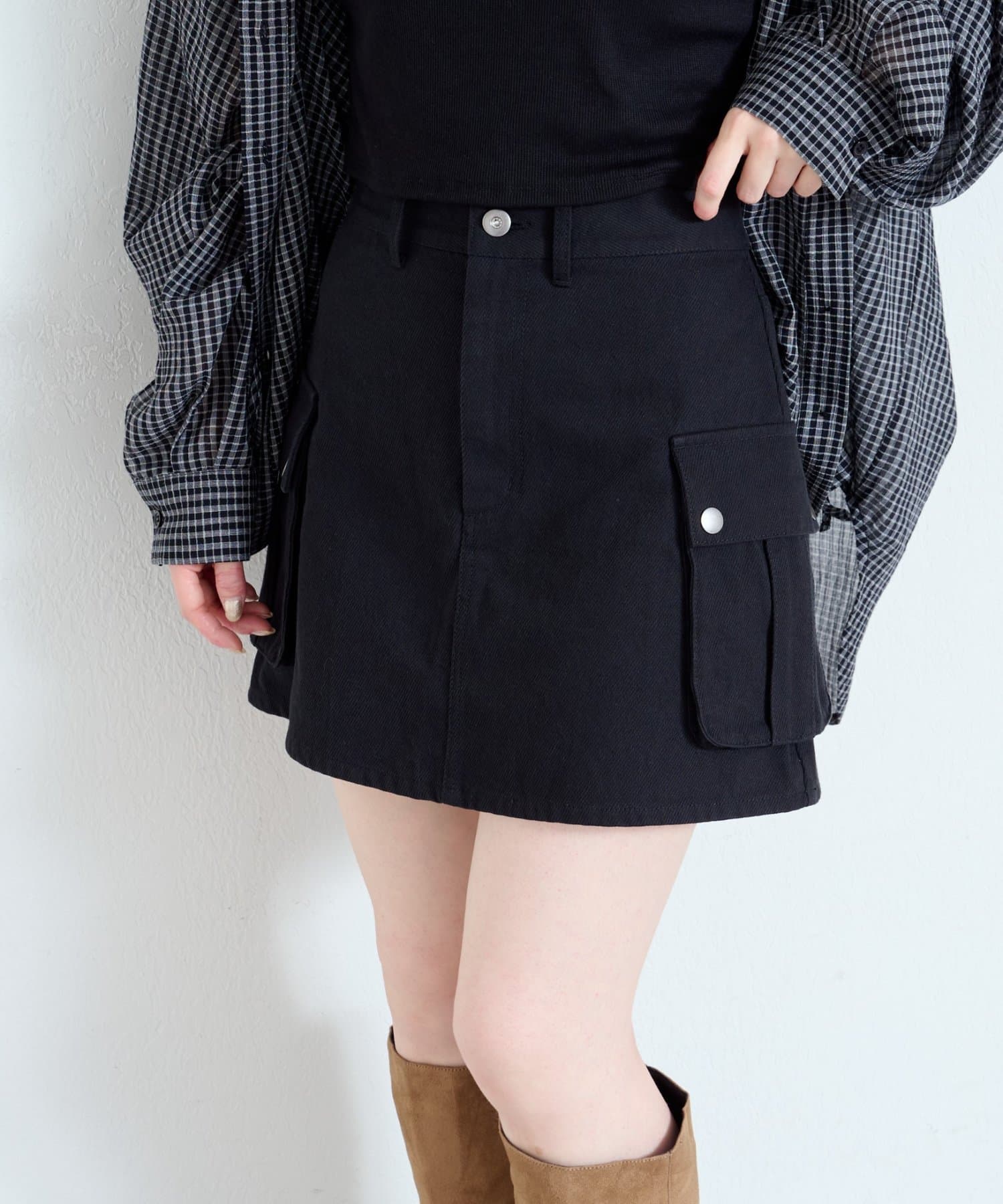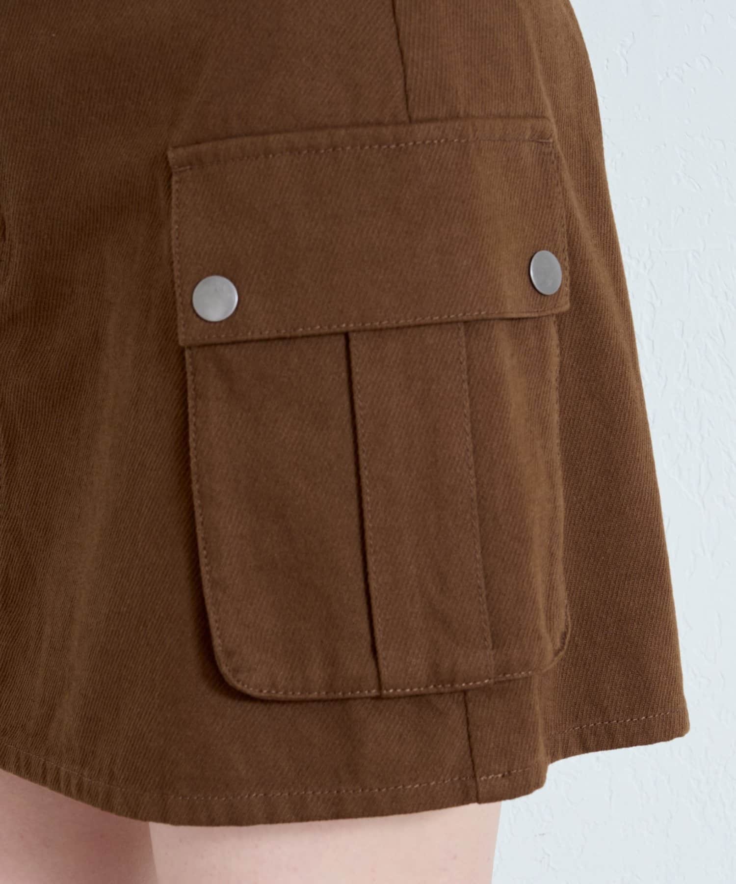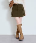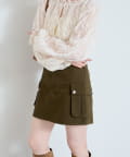 大きめのフラップポケットがポイントのミニスカート。