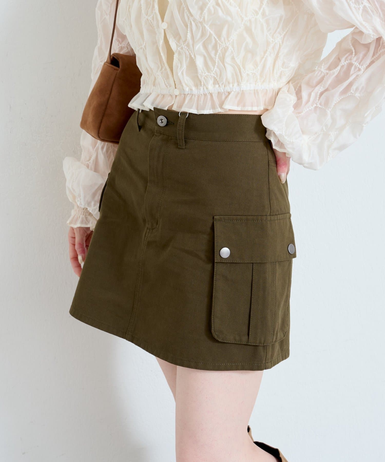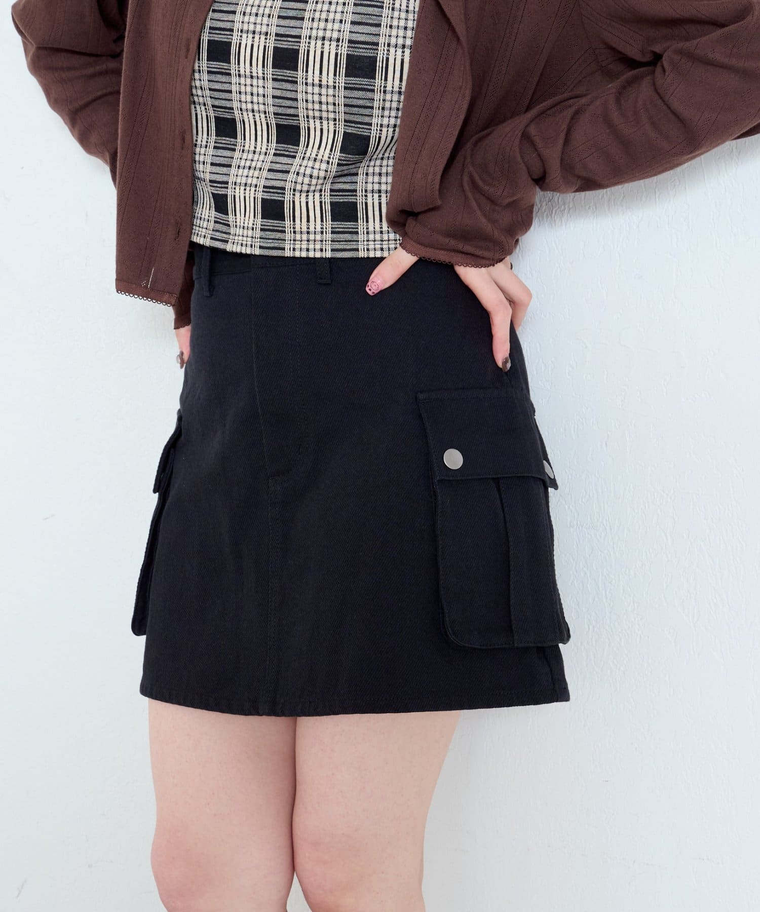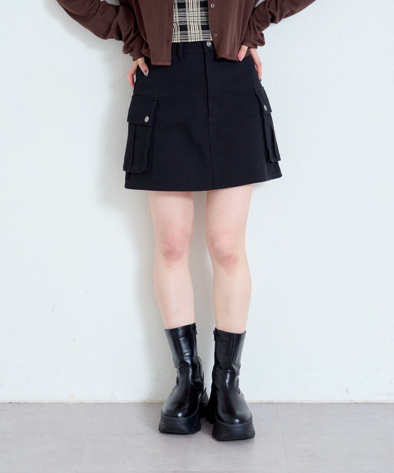 大きめのフラップポケットがポイントのミニスカート。