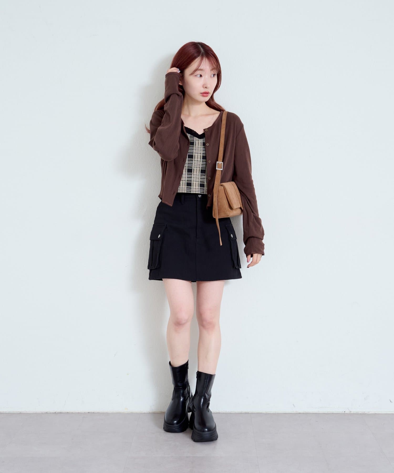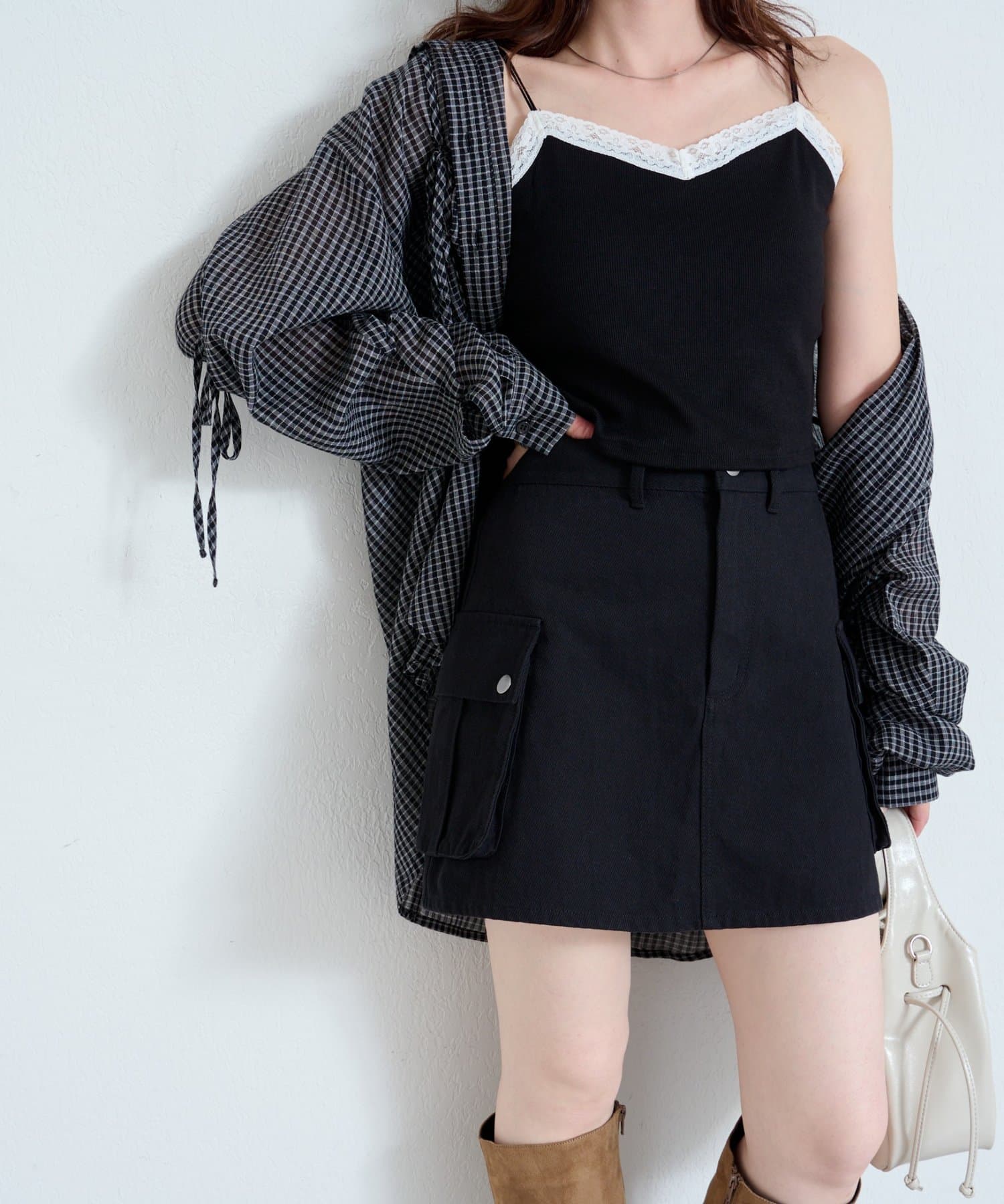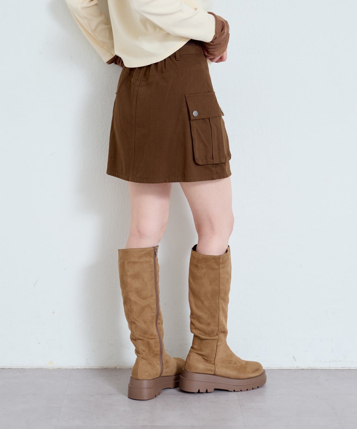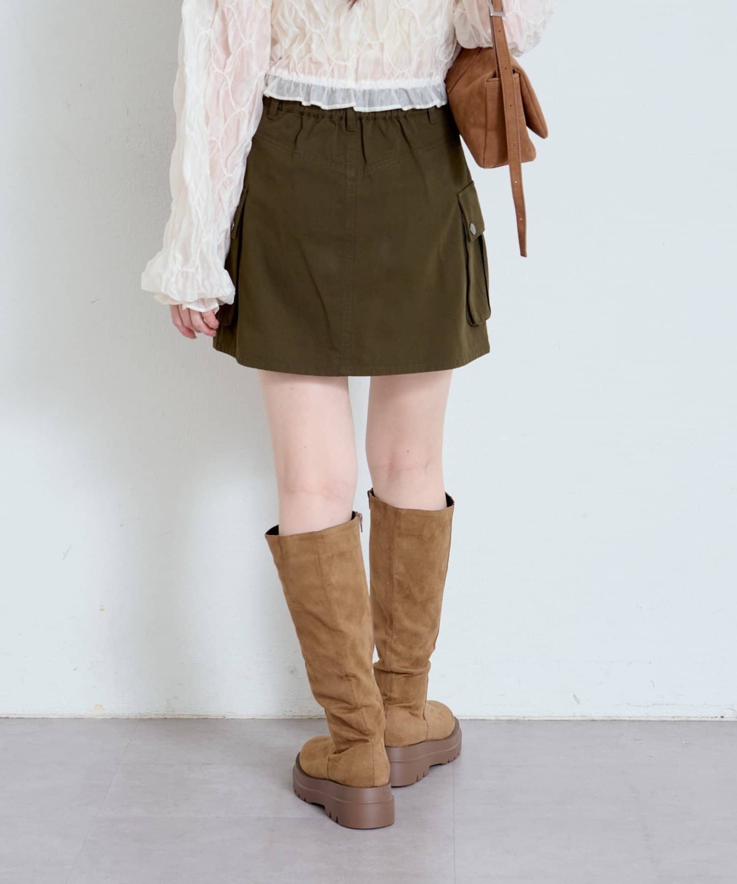 大きめのフラップポケットがポイントのミニスカート。