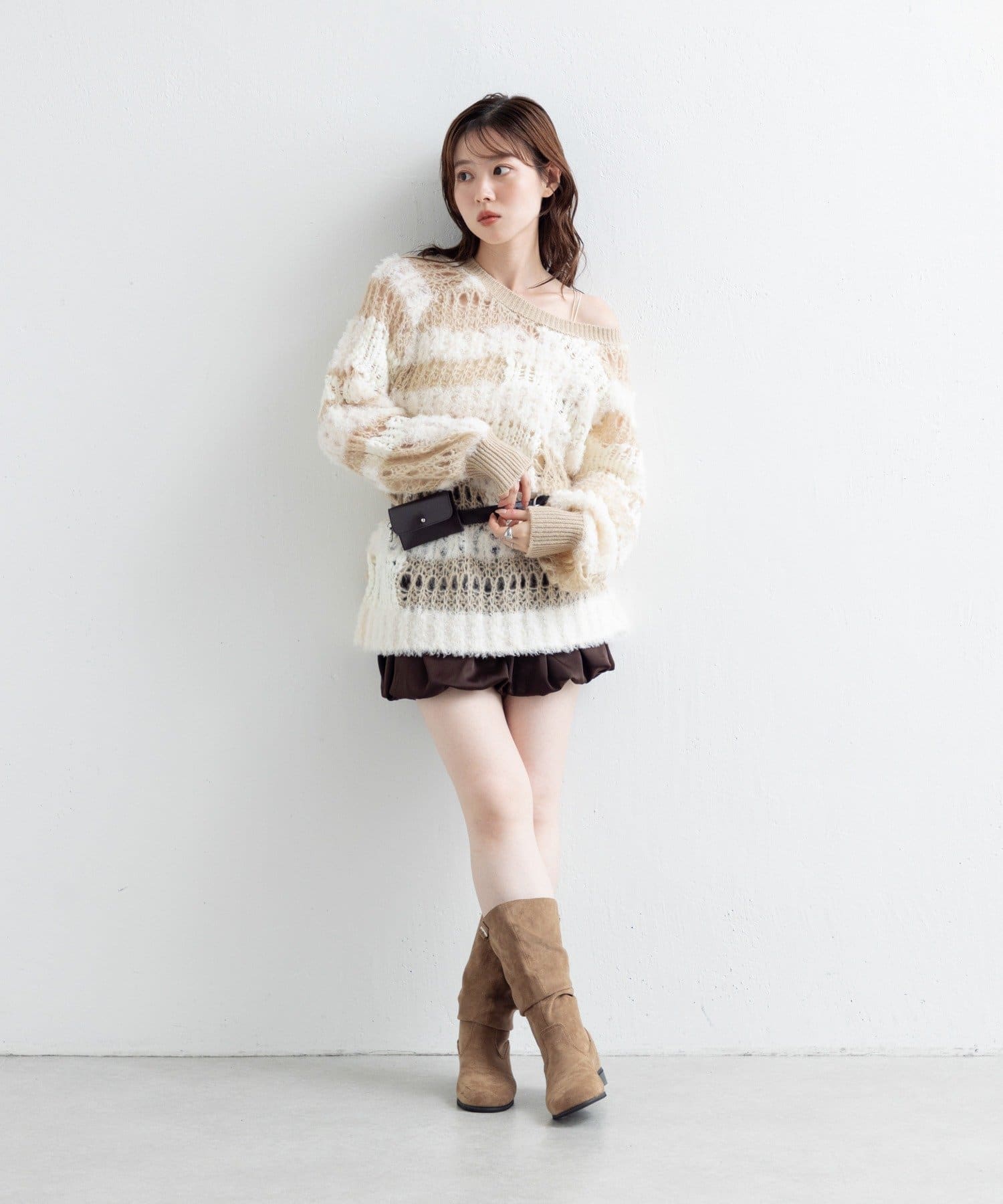 コンパクトなトップスやショート丈カーディガンと合わせると、バランスよくスタイルアップ。