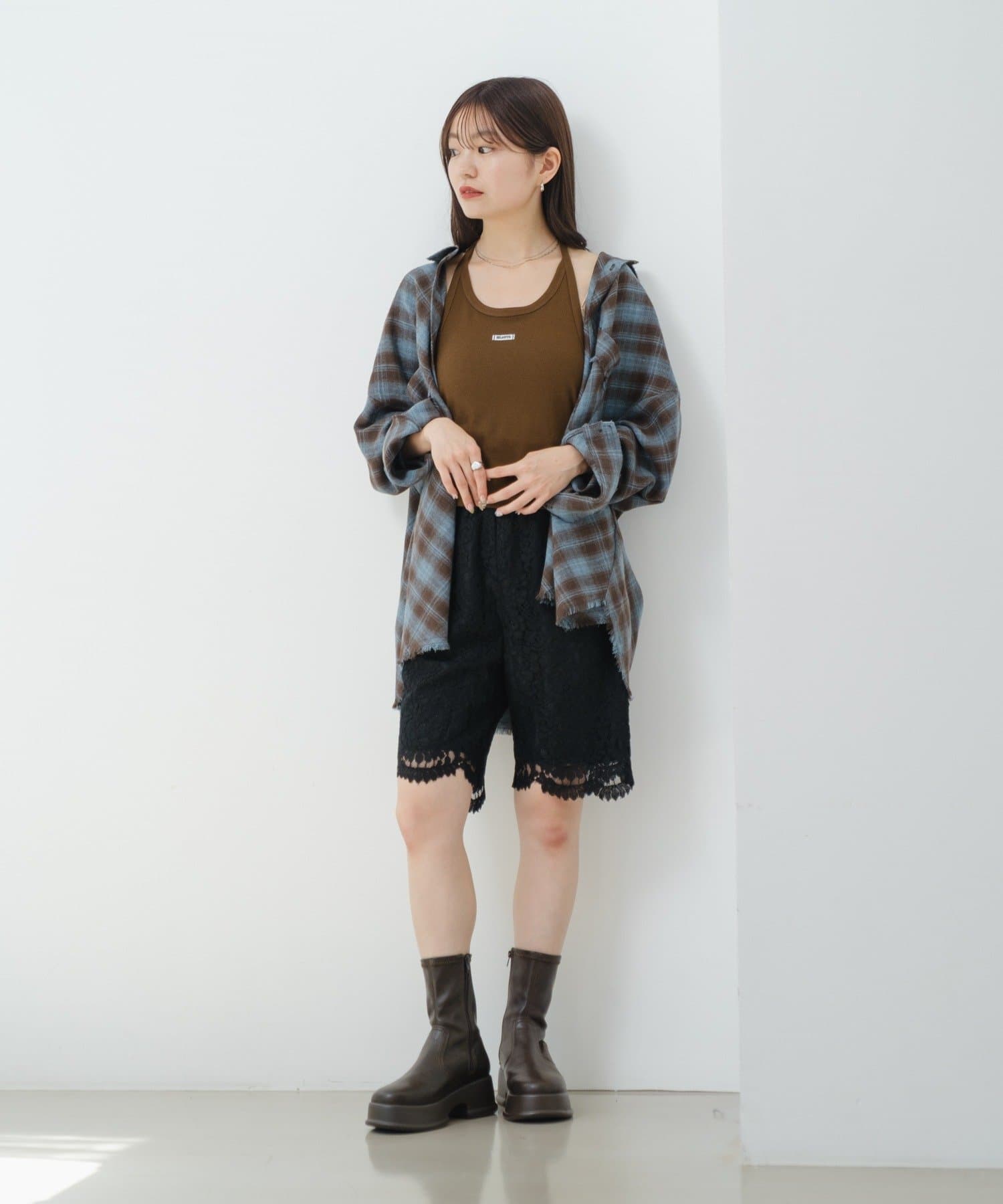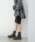 足元はブーツで甘さを引き締めて、バランスのとれたスタイルに。