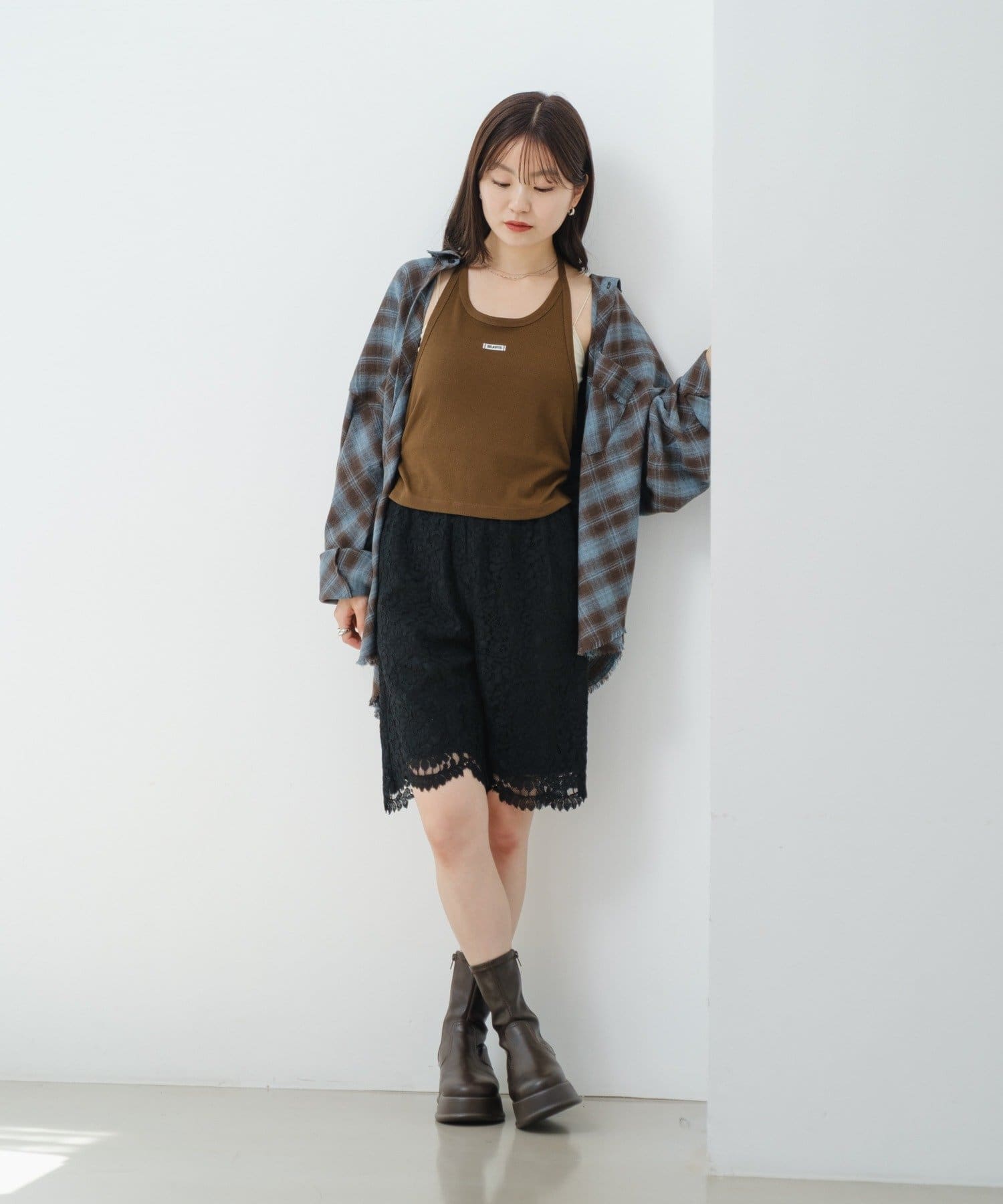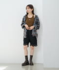 同素材のレーストップスやキャミとセットアップ風に。