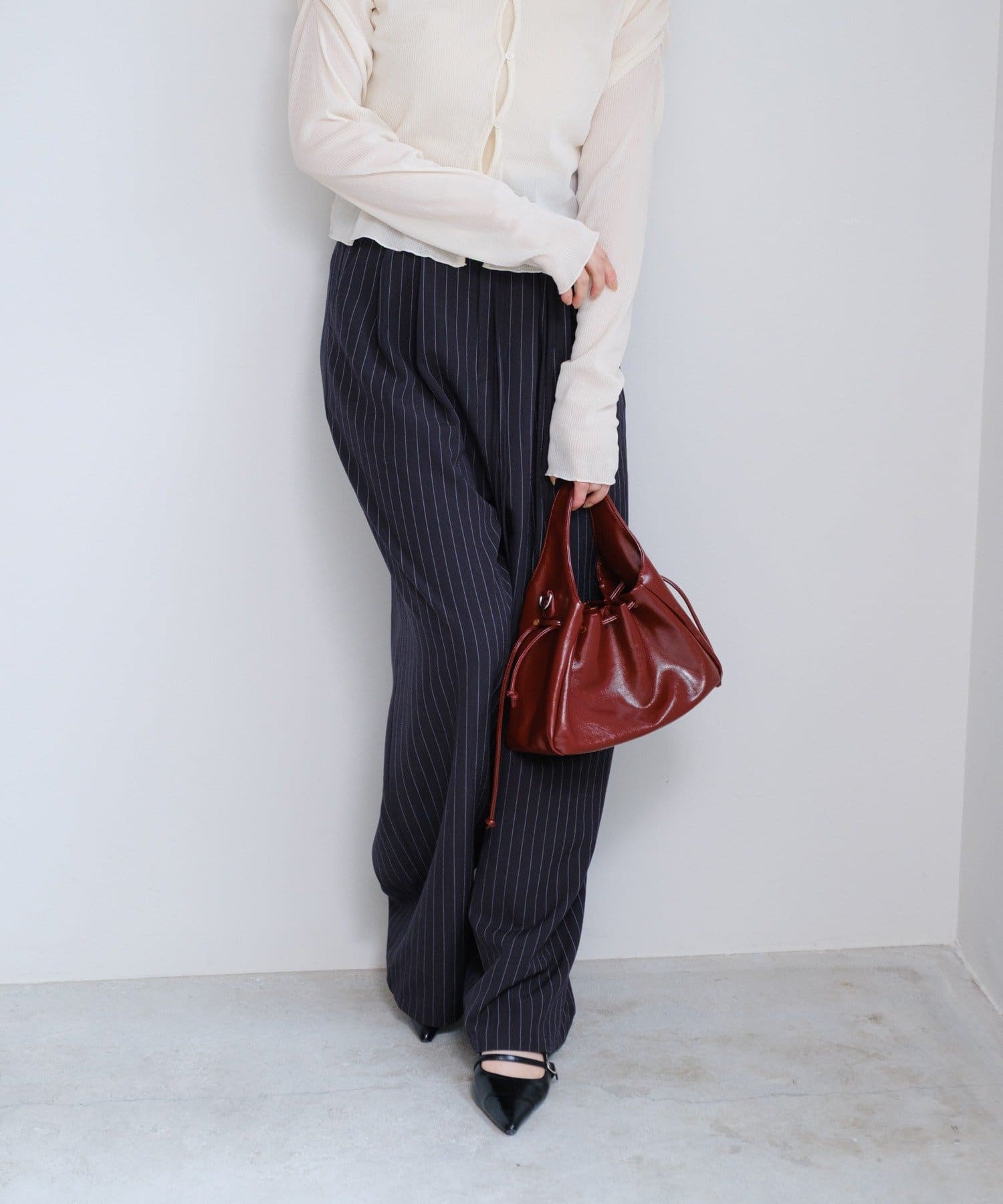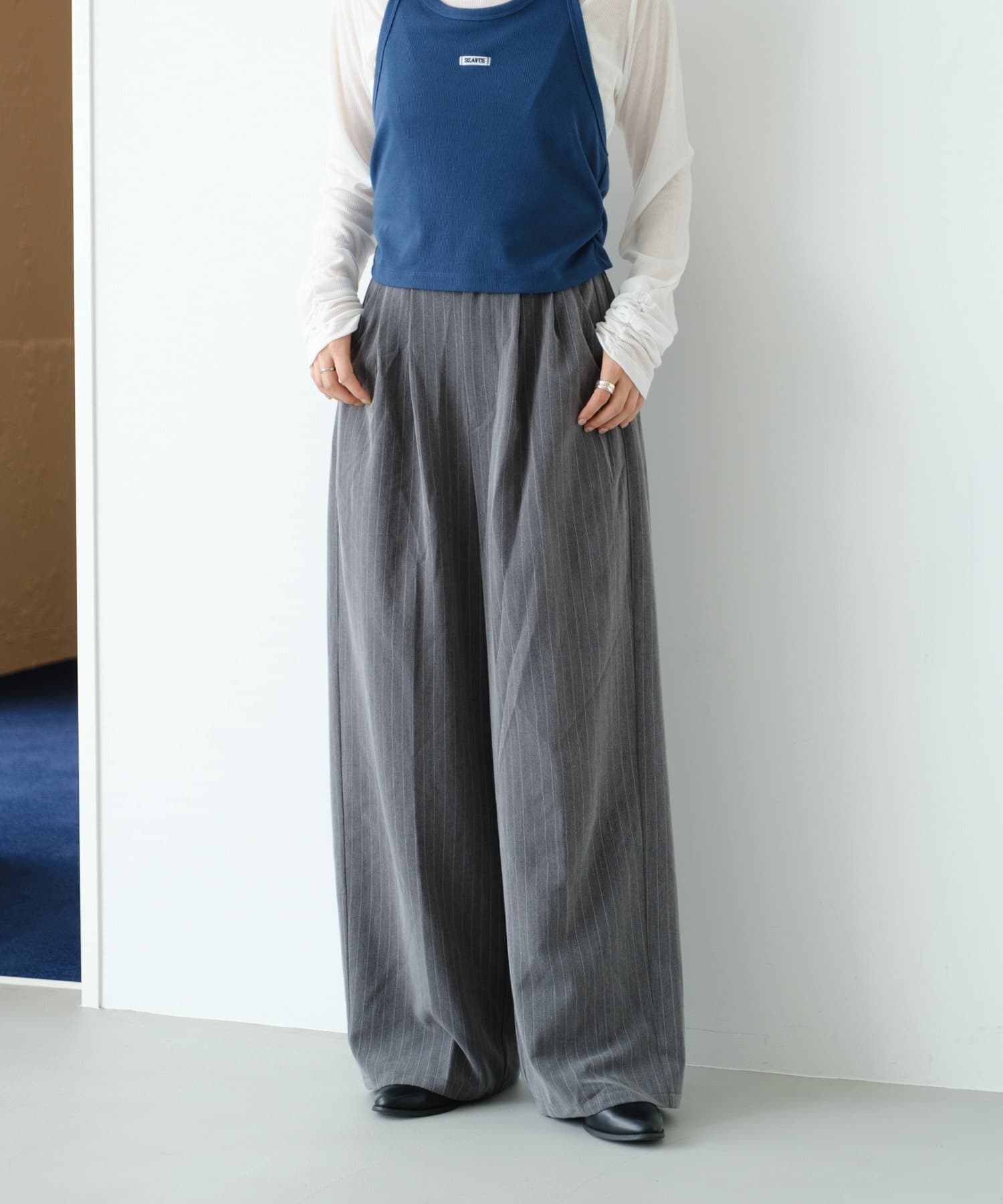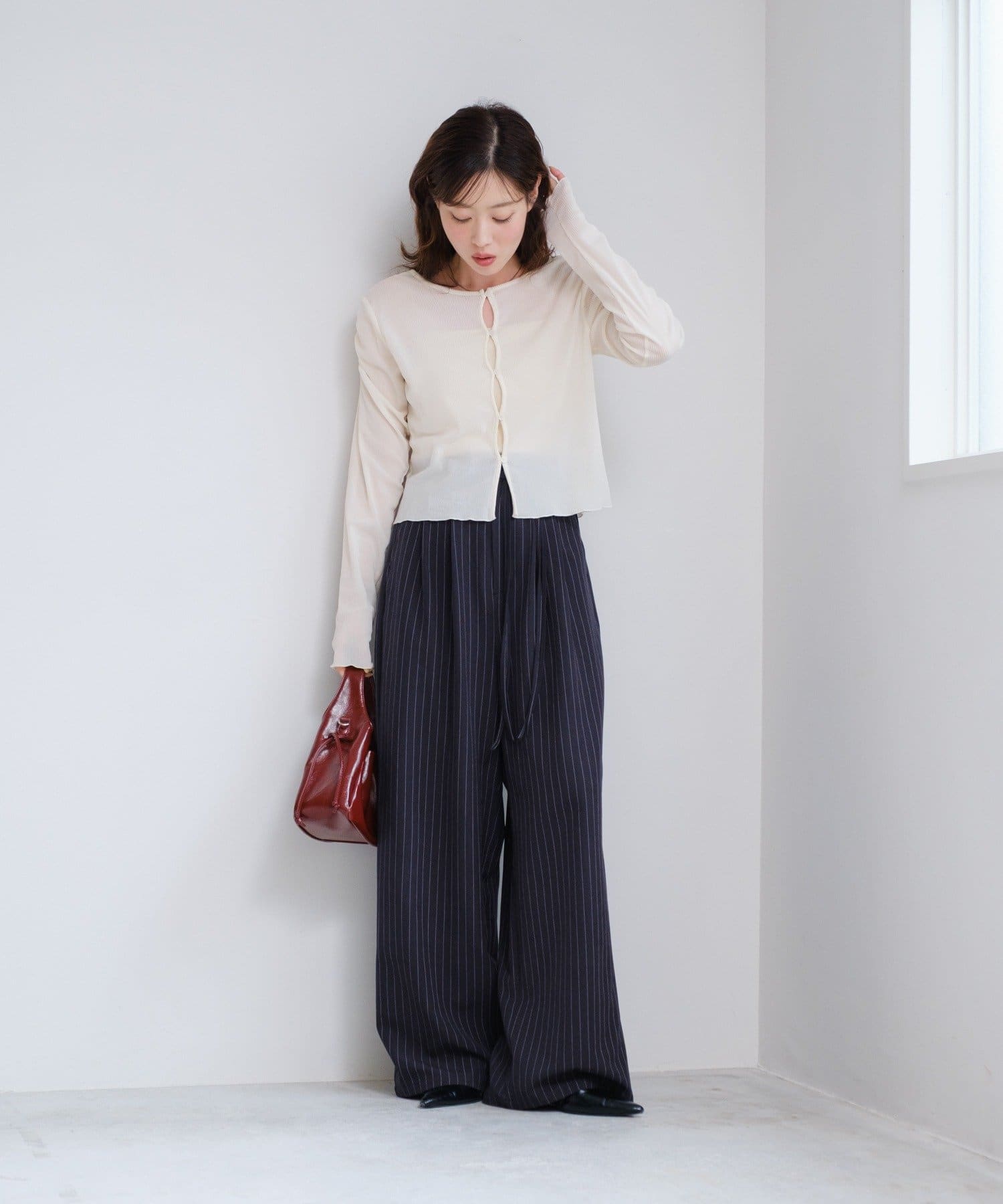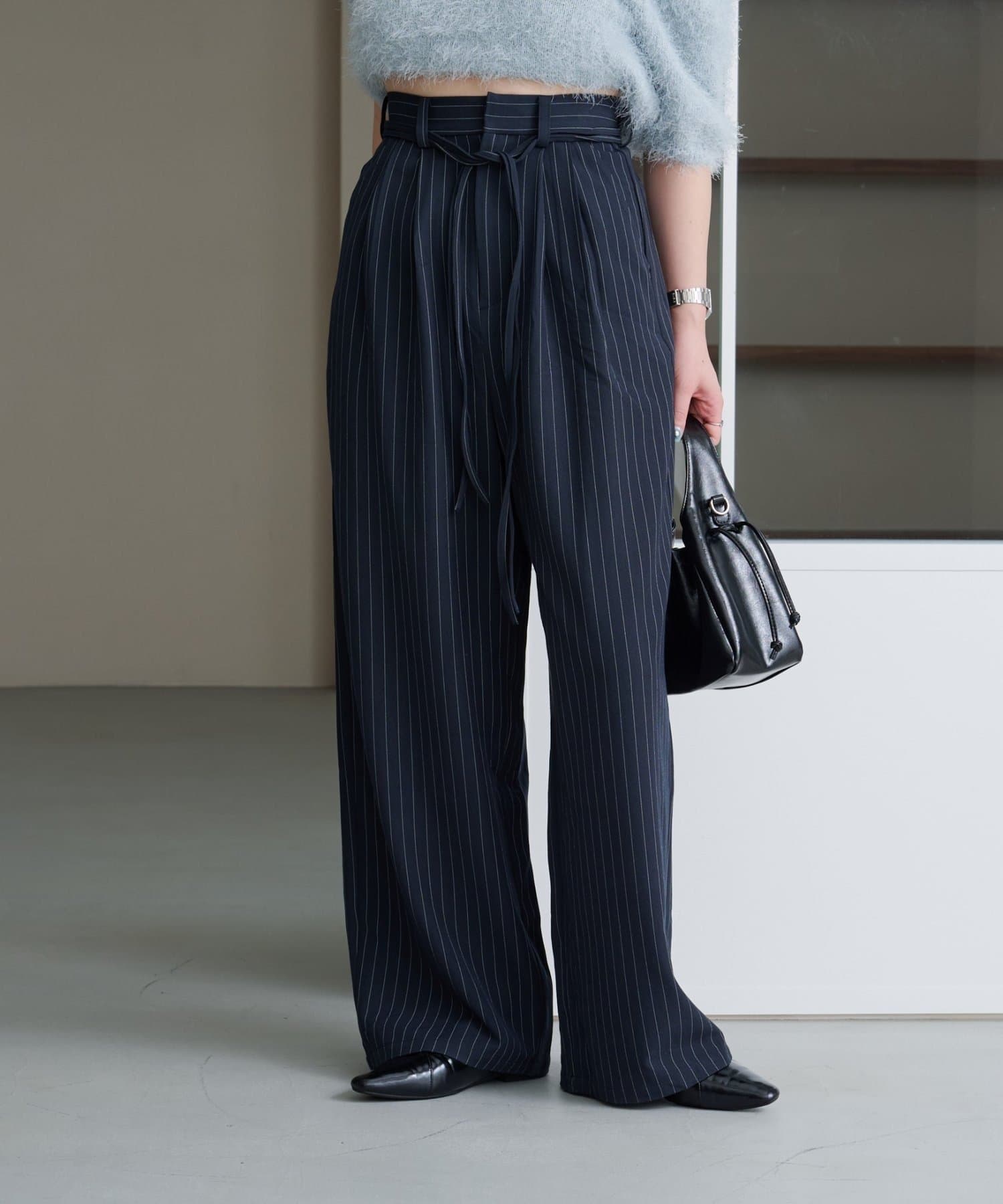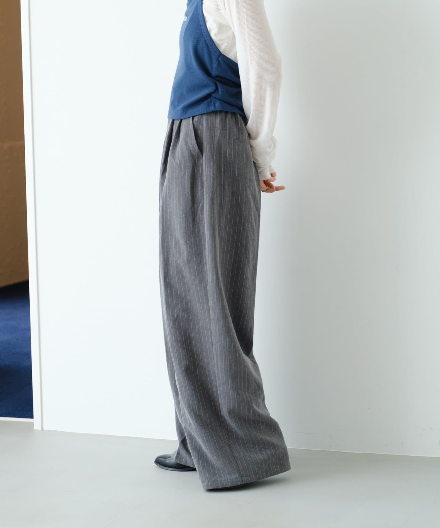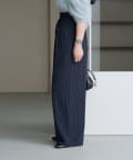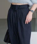 ピンストライプがさりげない縦ラインを強調し、スタイルアップ効果も◎。