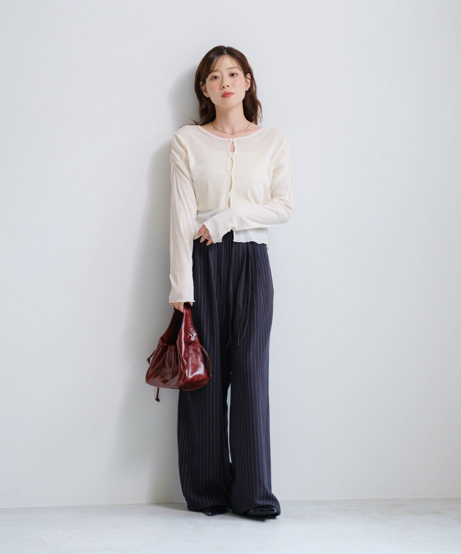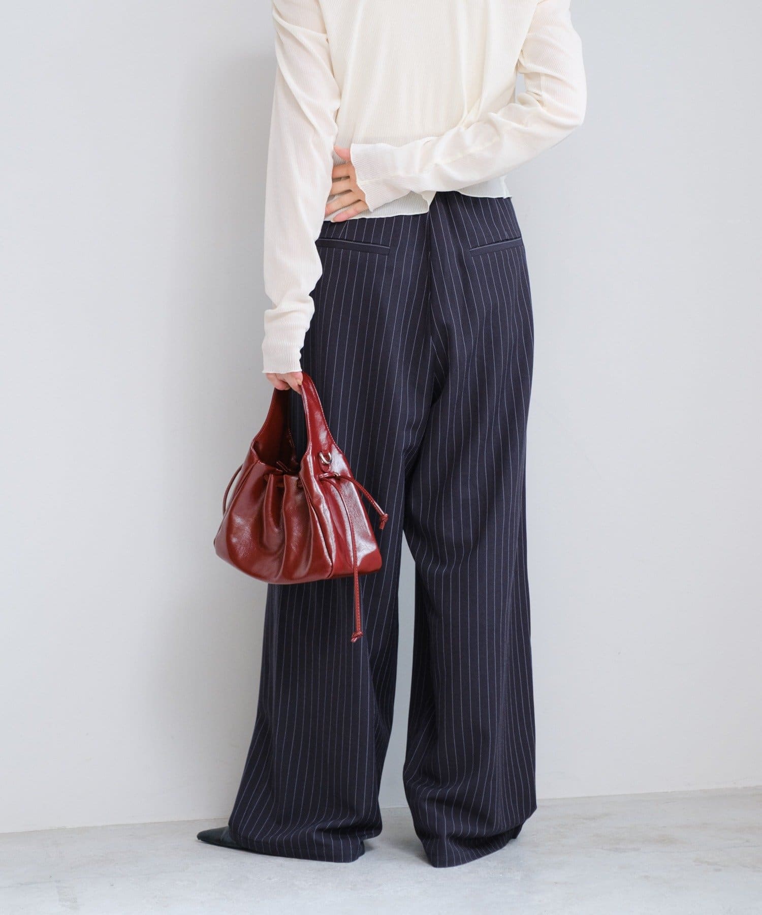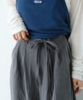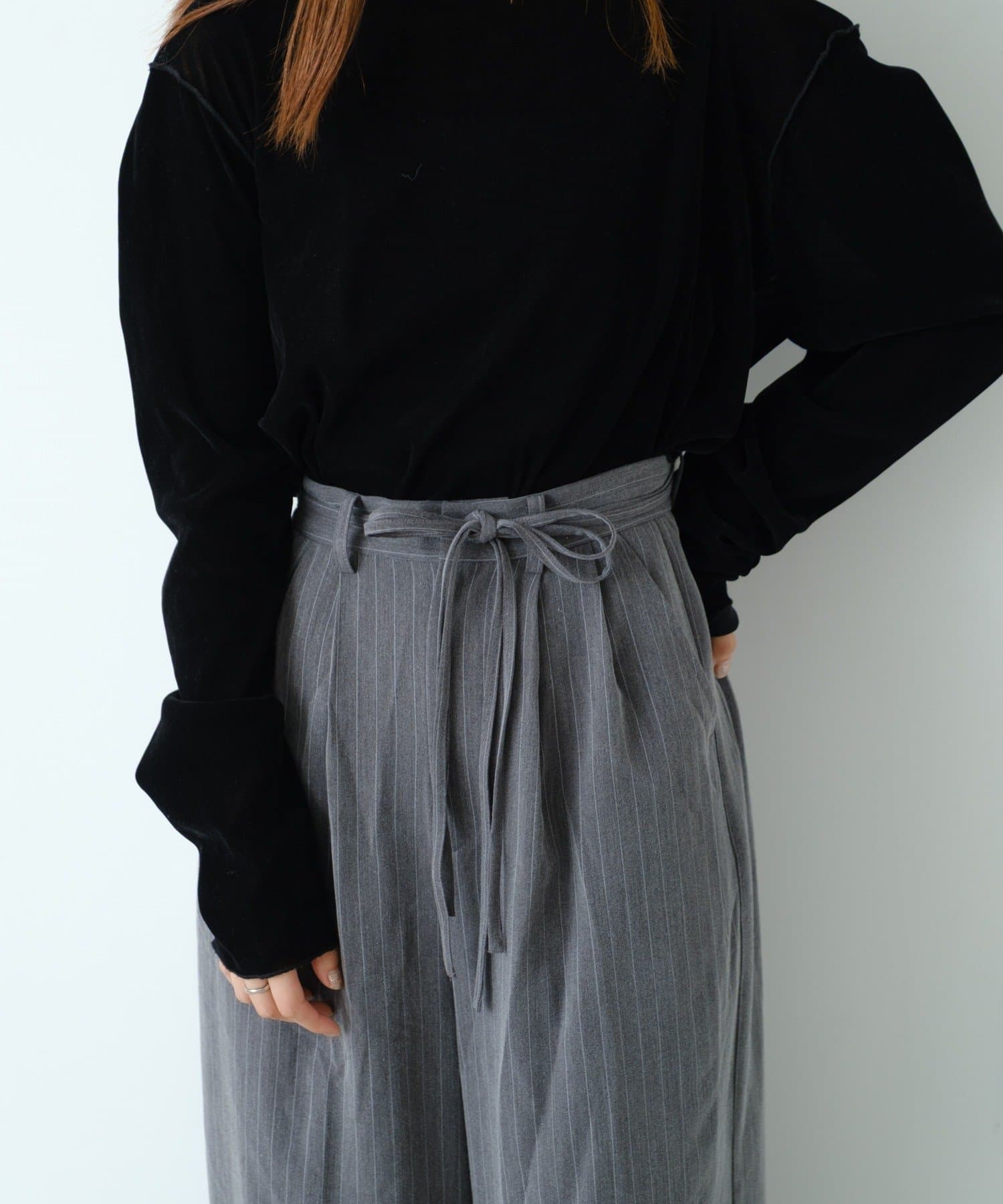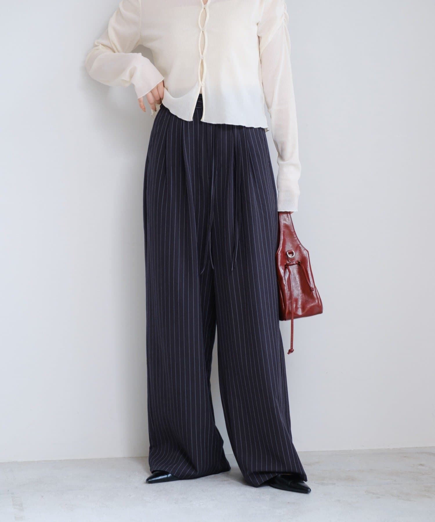 ピンストライプがさりげない縦ラインを強調し、スタイルアップ効果も◎。