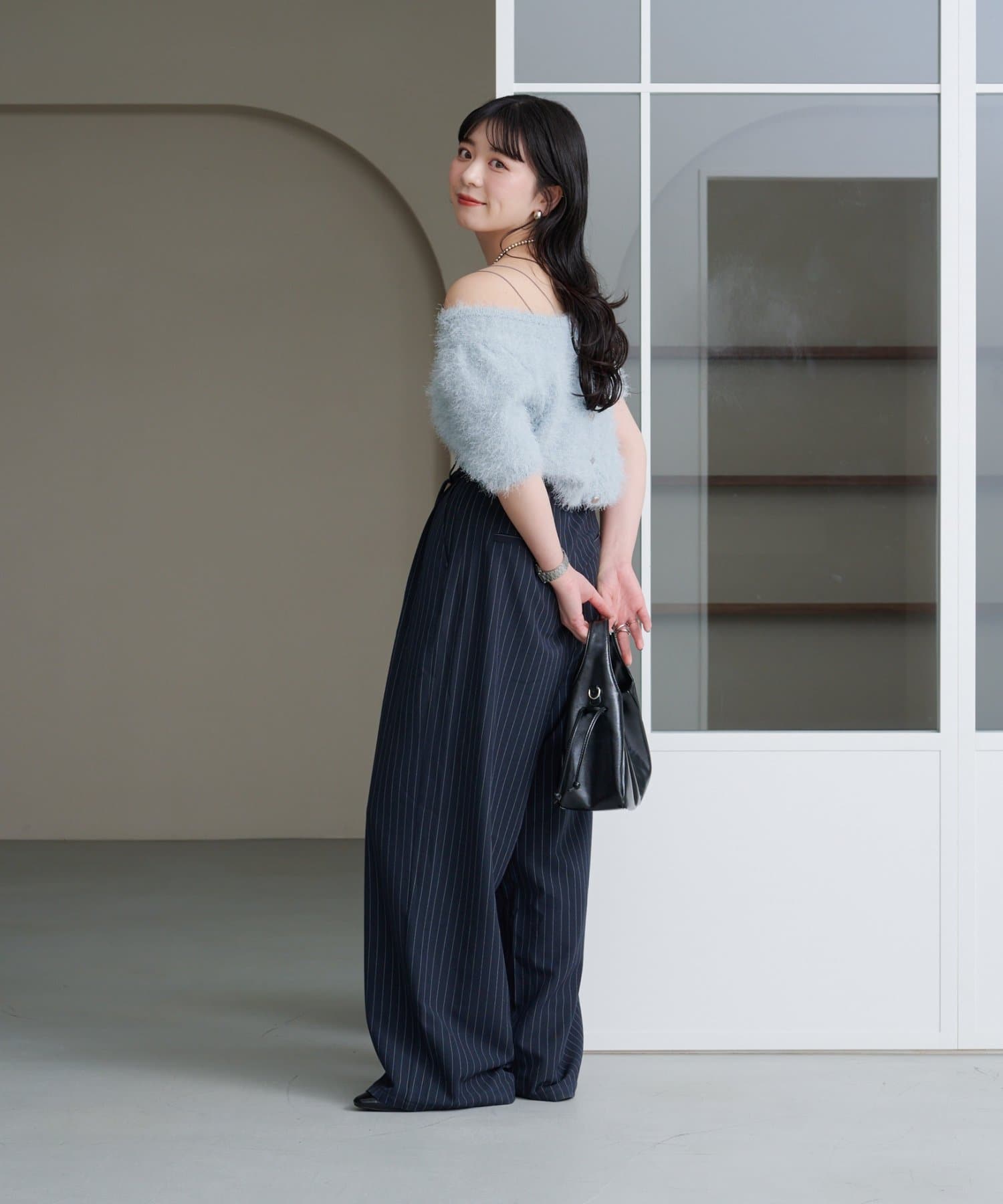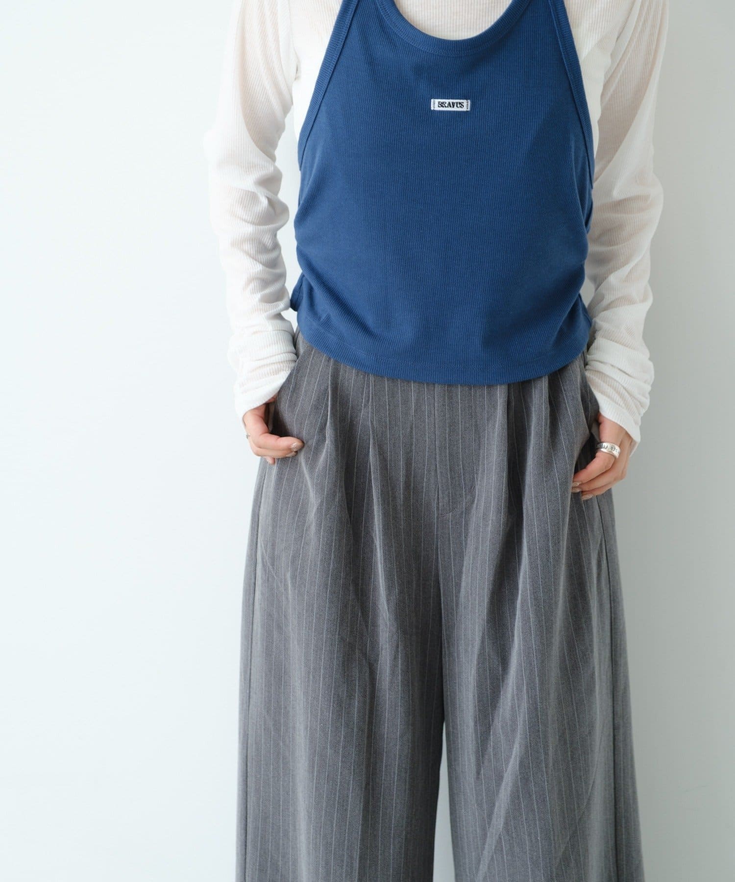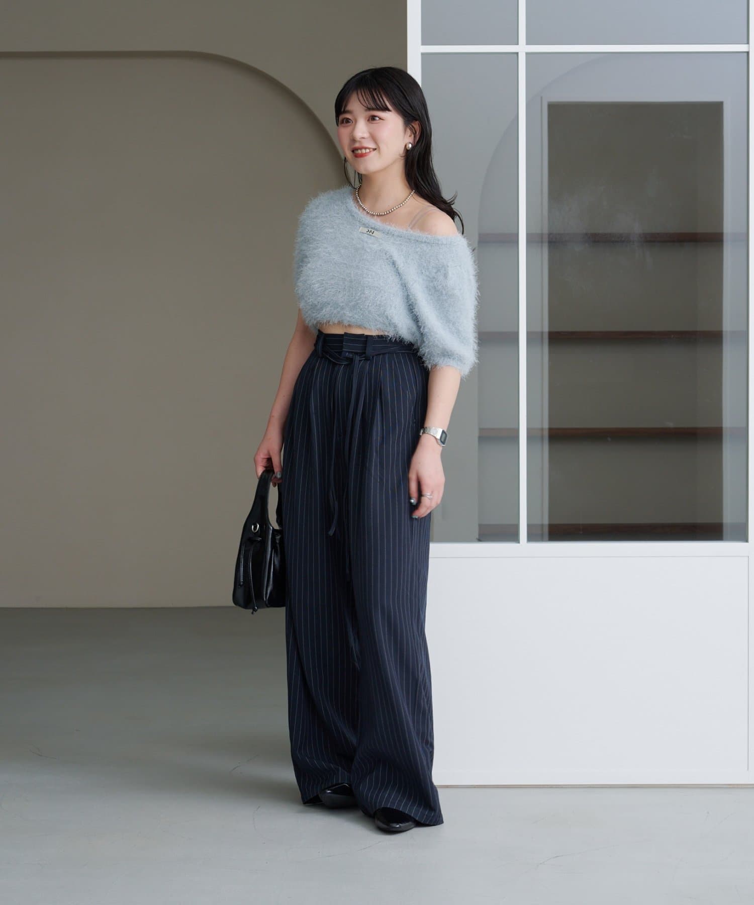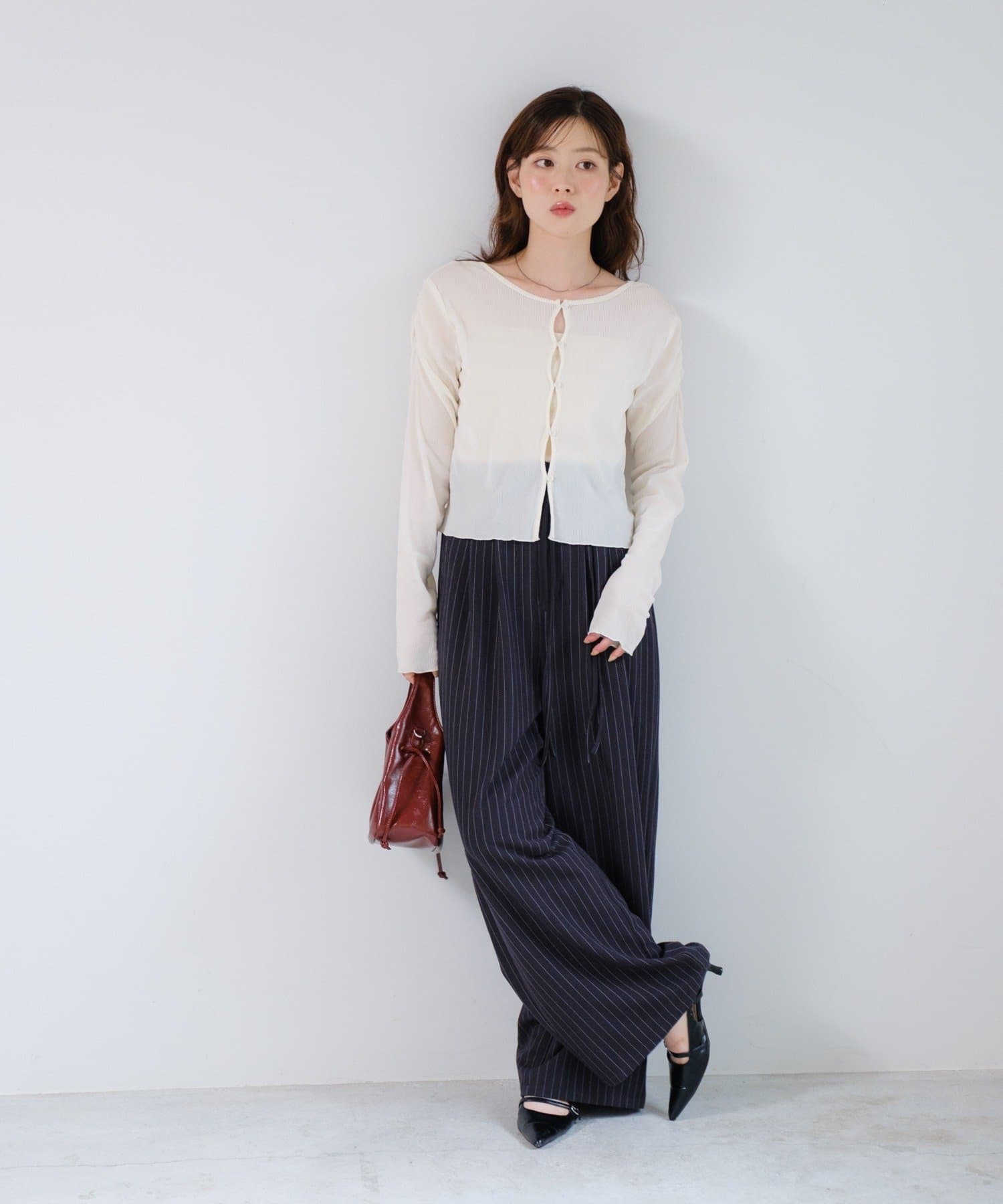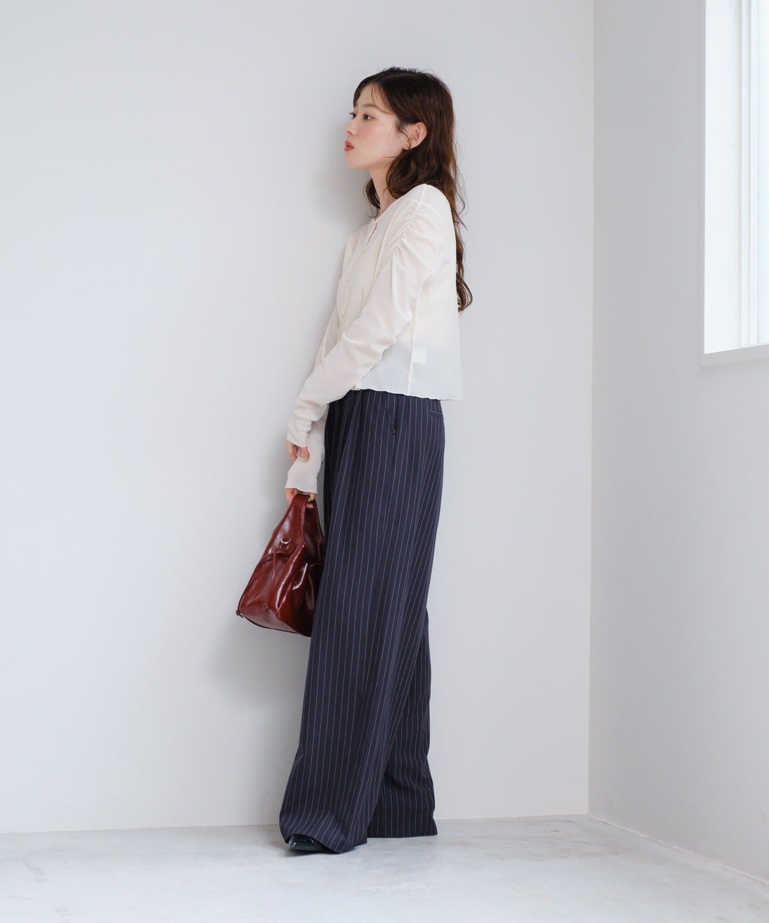 ピンストライプがさりげない縦ラインを強調し、スタイルアップ効果も◎。