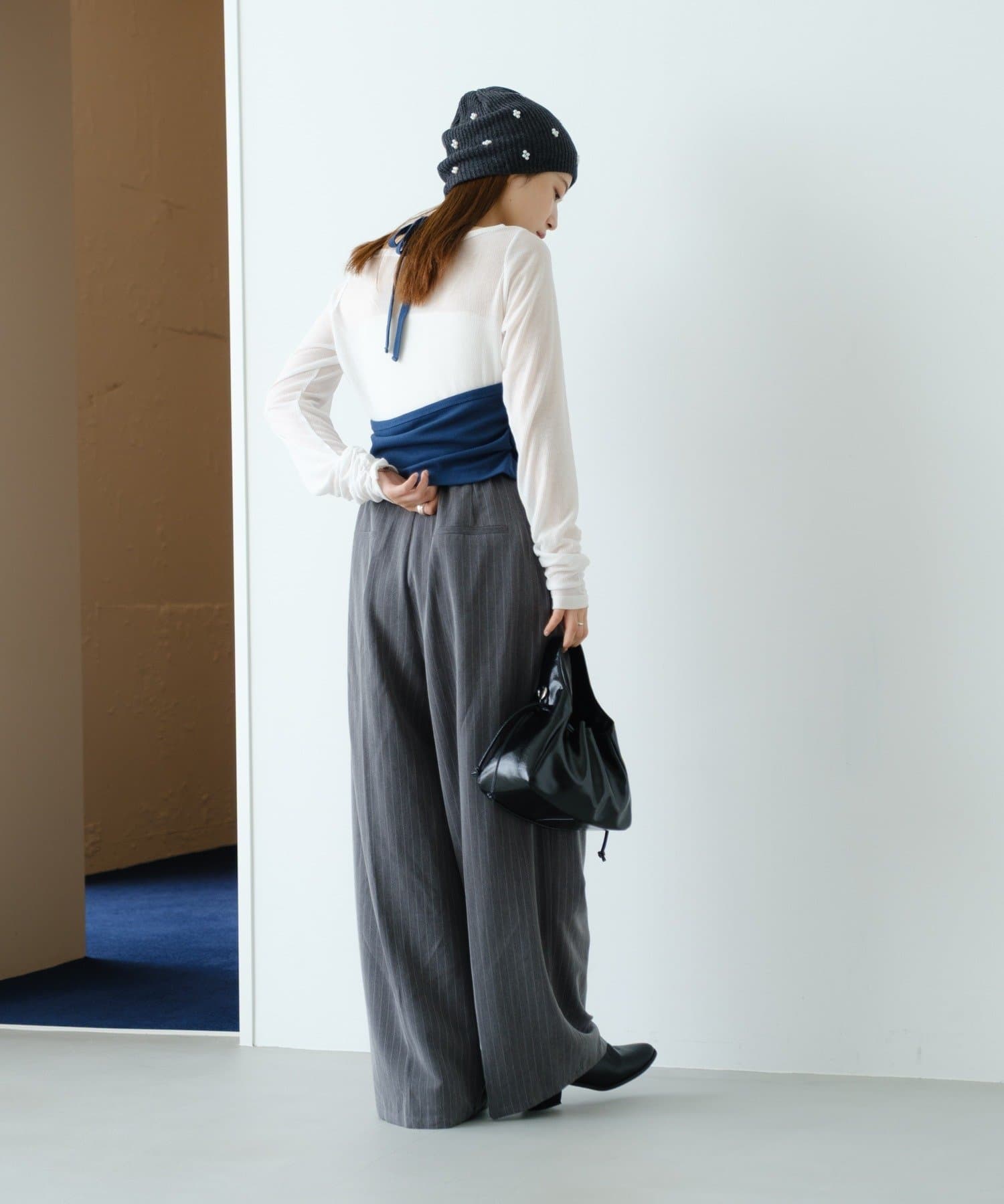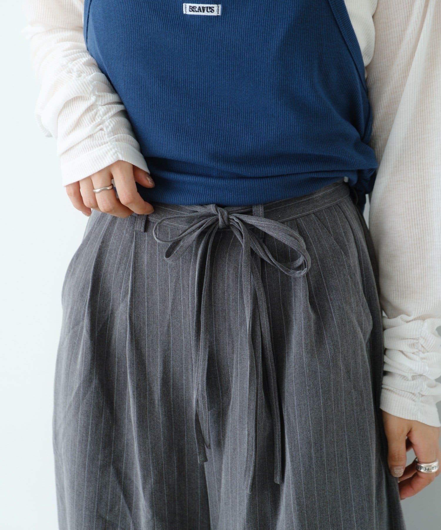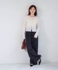 タイトなニットやインナーをインしてウエストマーク。