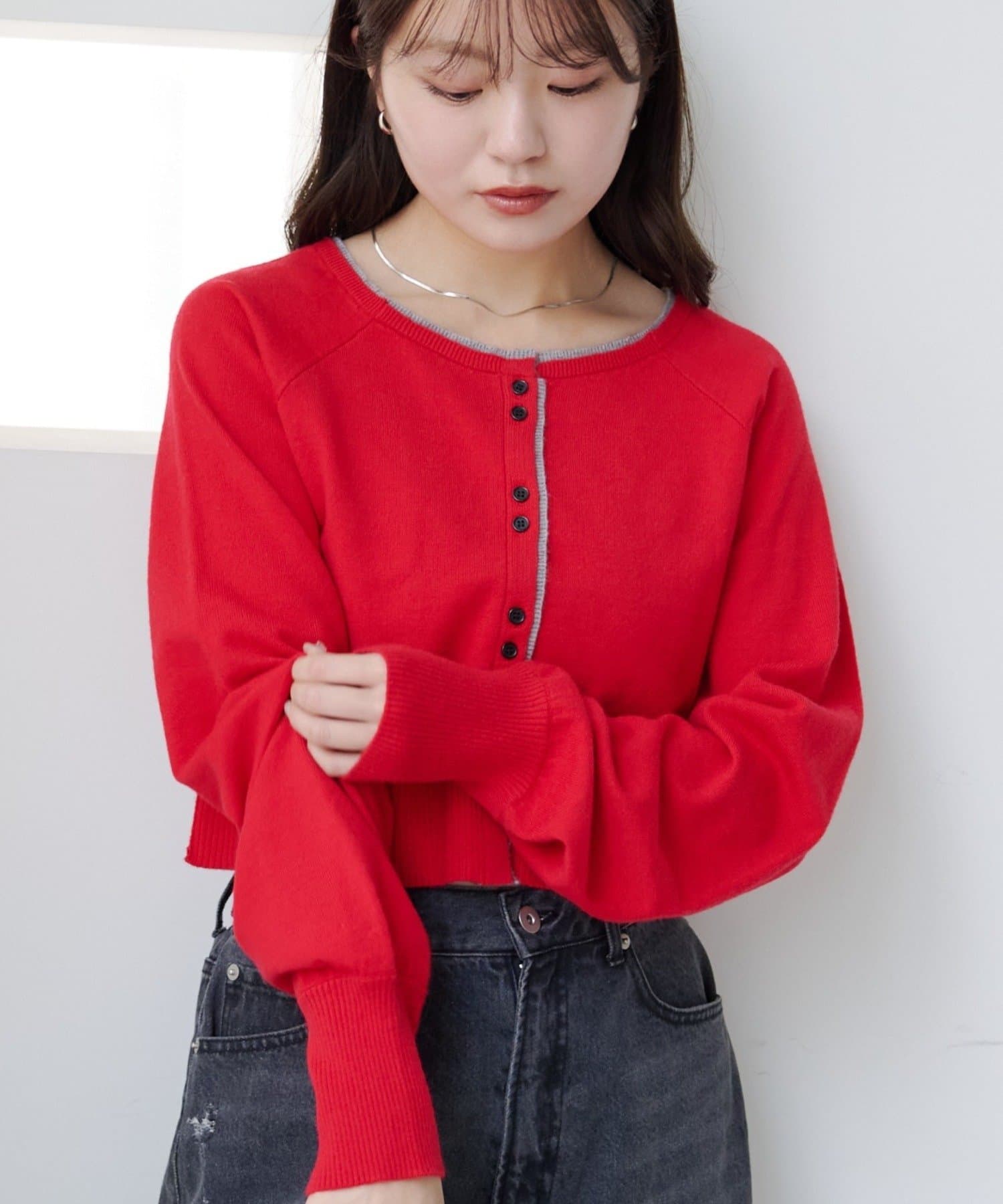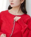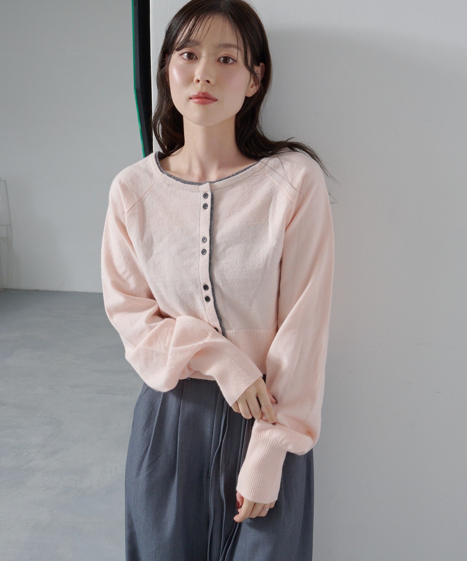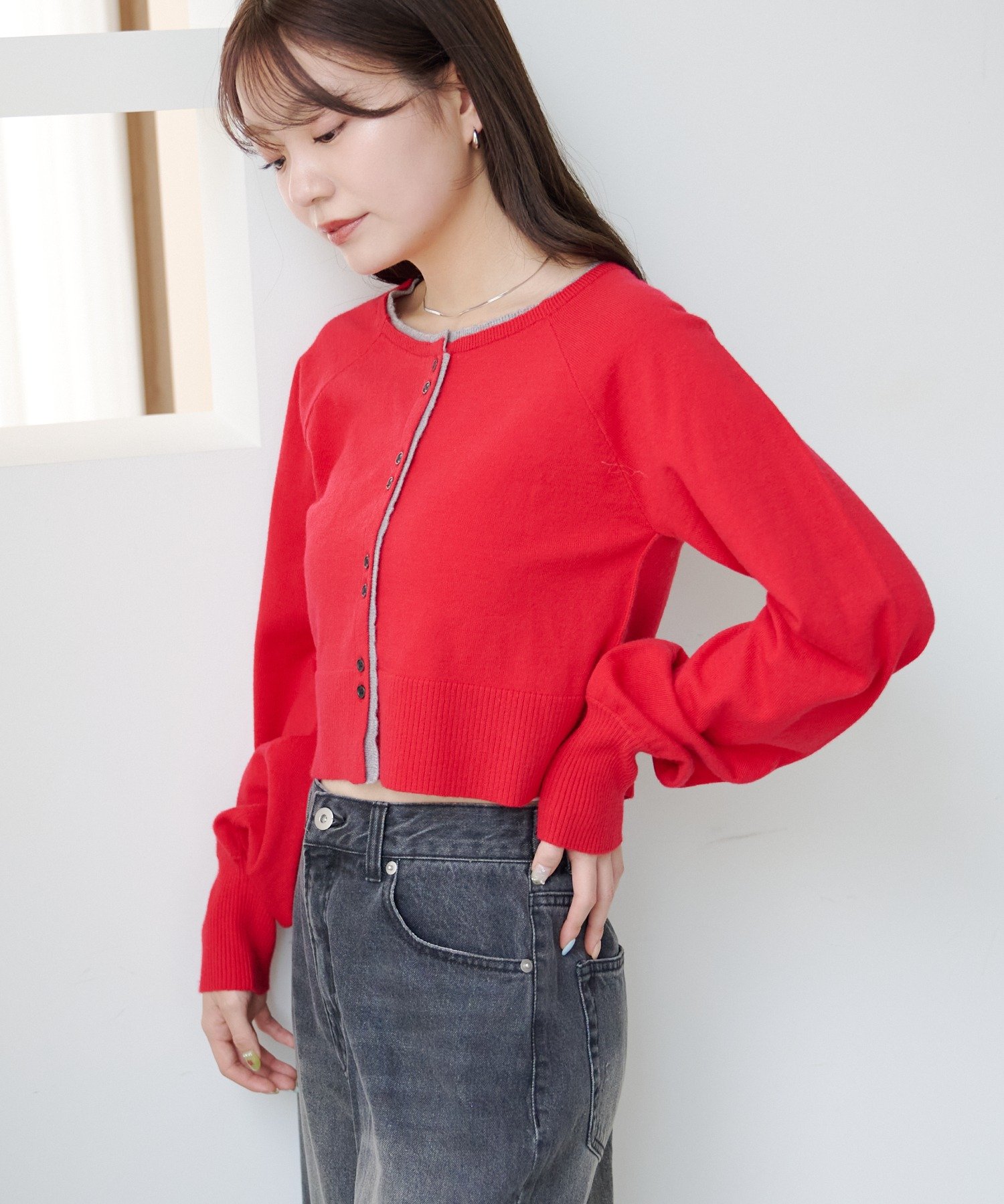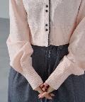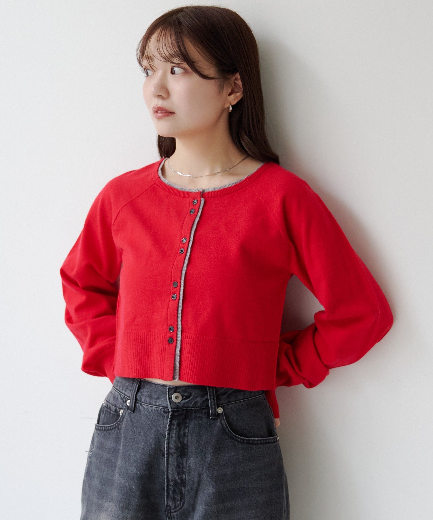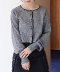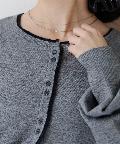 シンプルながらも配色デザインがアクセントになるレイヤード風カーディガン。