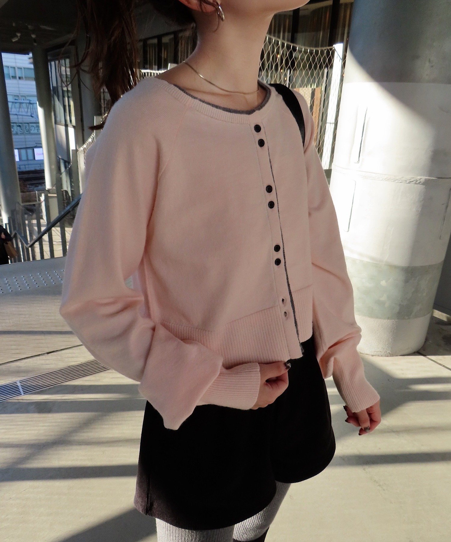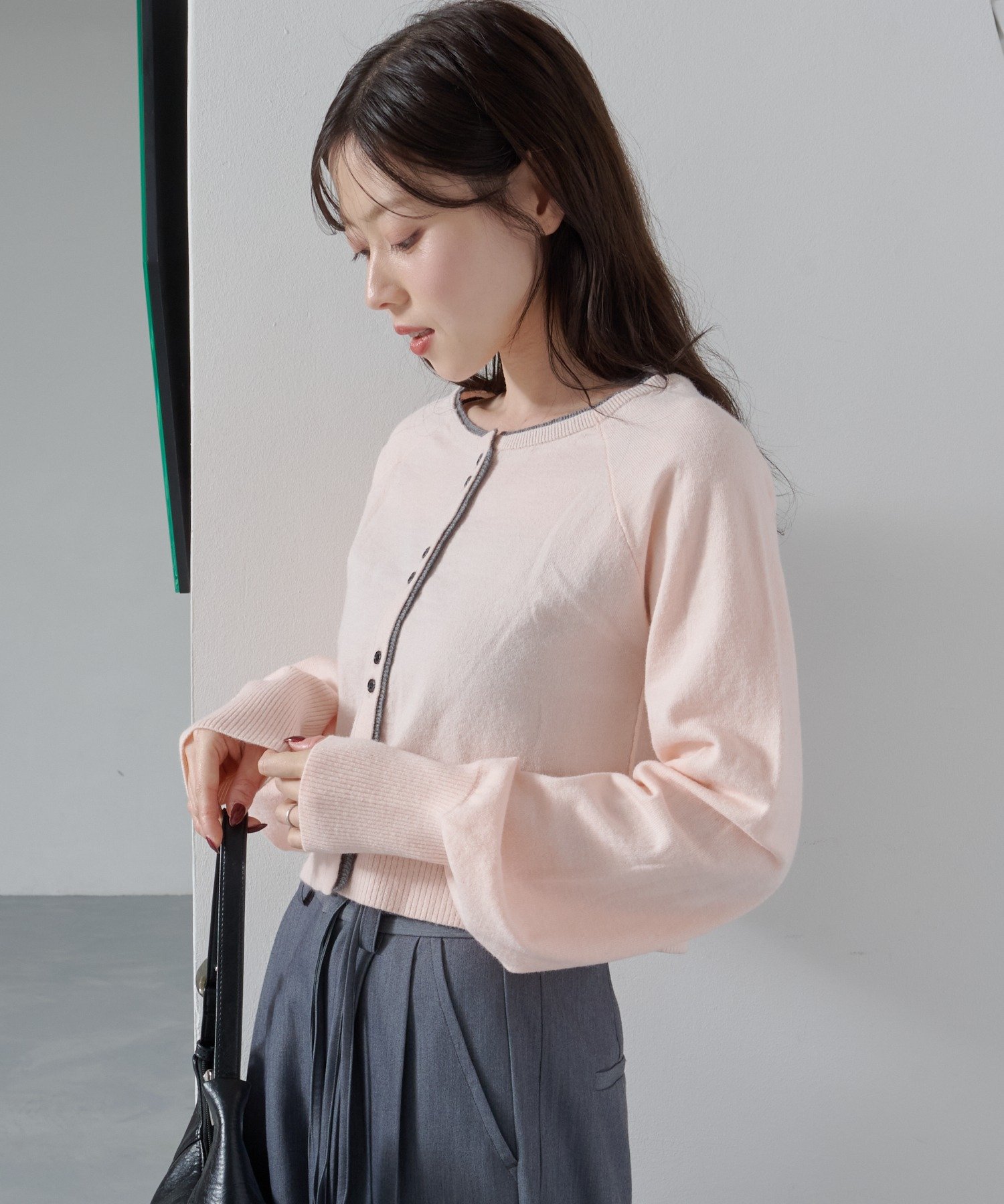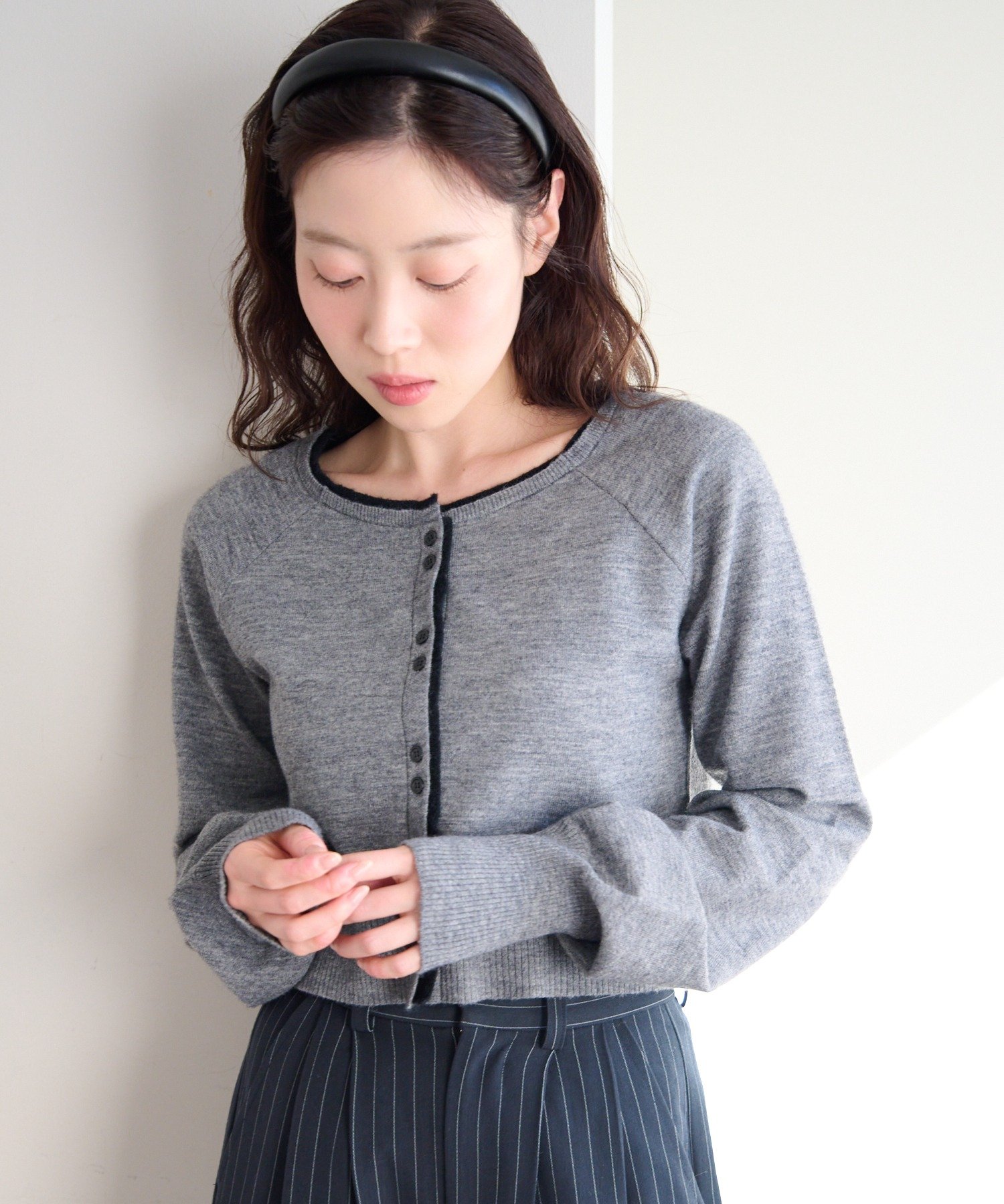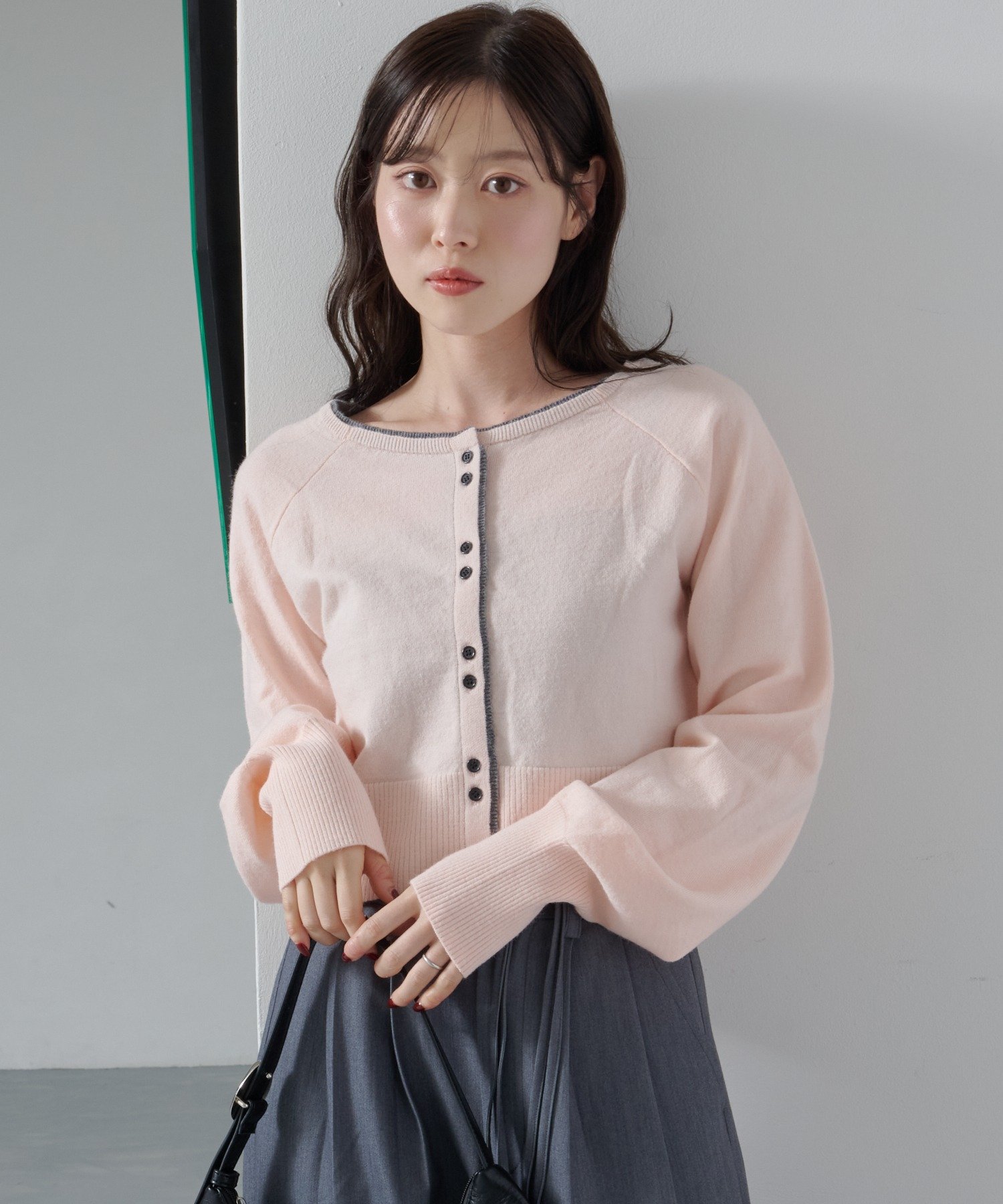 シンプルながらも配色デザインがアクセントになるレイヤード風カーディガン。