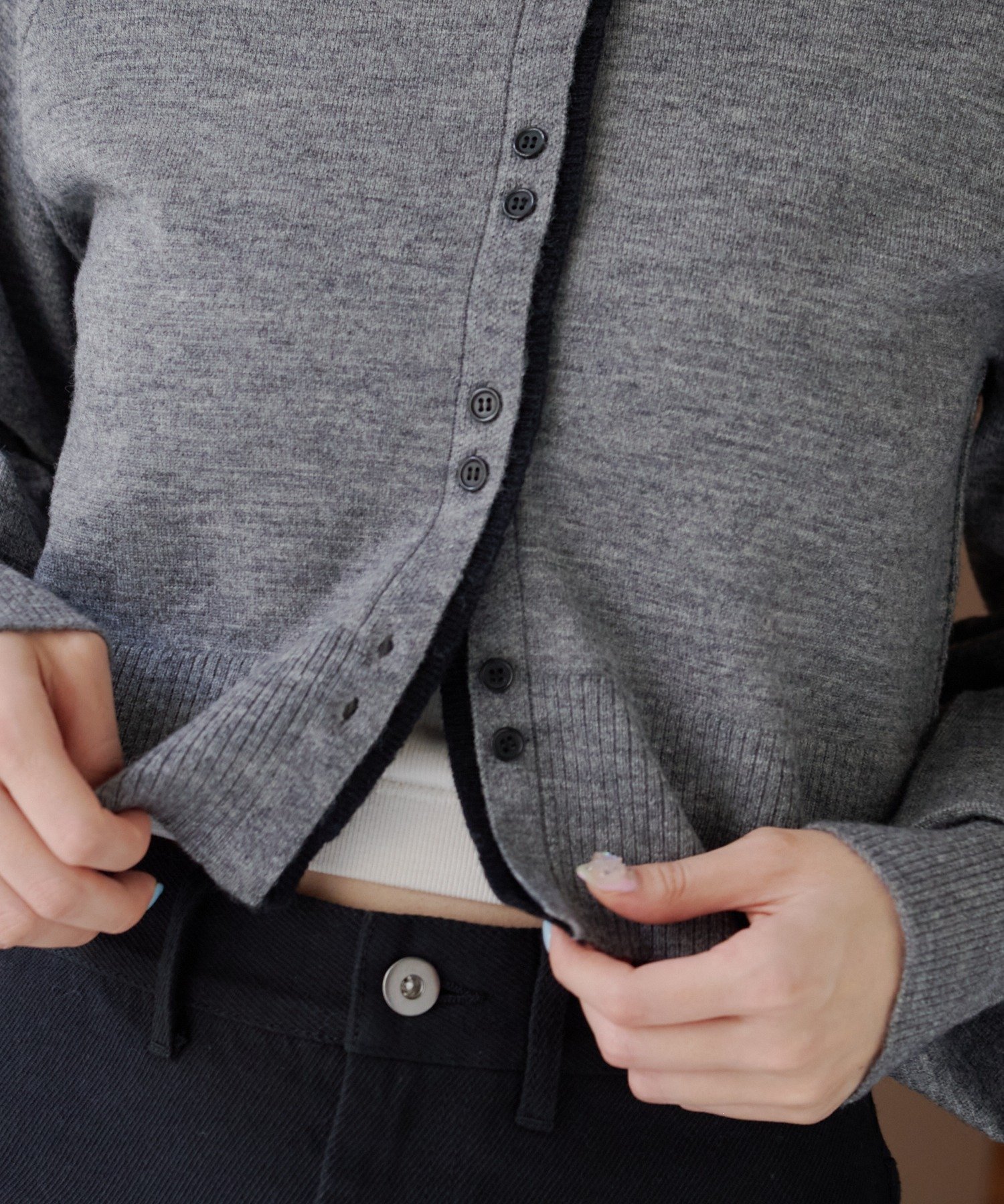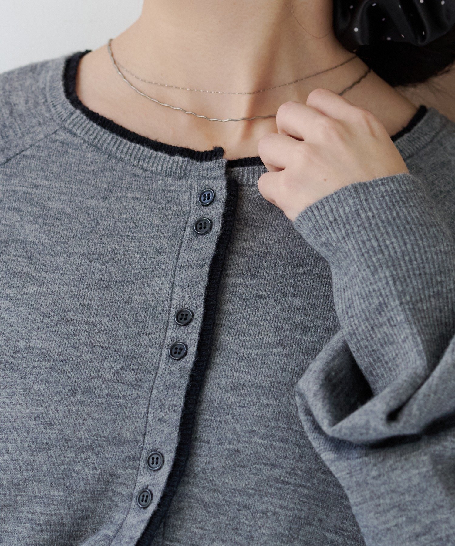 首元と前立てのさりげない切り替えカラーが、一枚で着てもレイヤード感を演出してくれます。