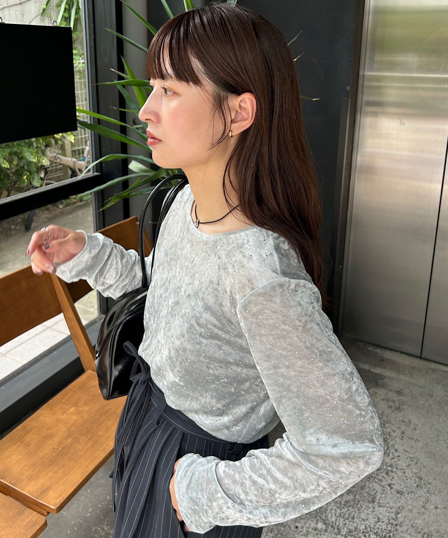 しっとりとした光沢感が魅力のベロア素材に細やかなスタッズを散りばめたカットソー。