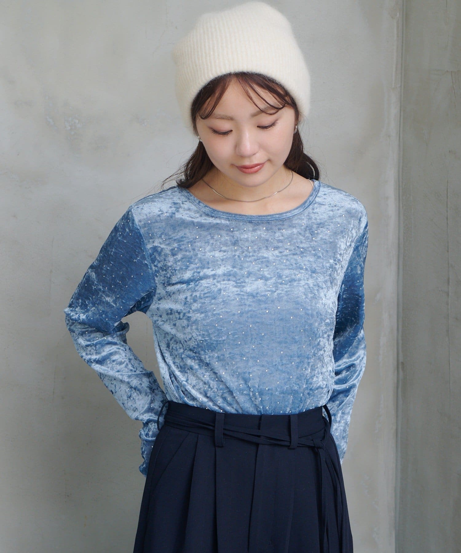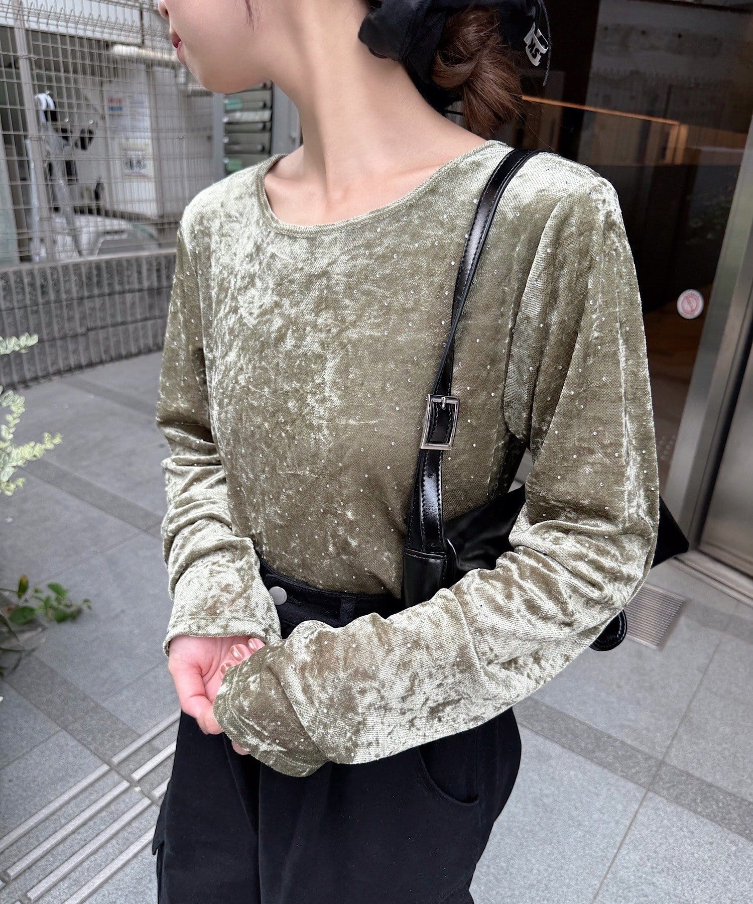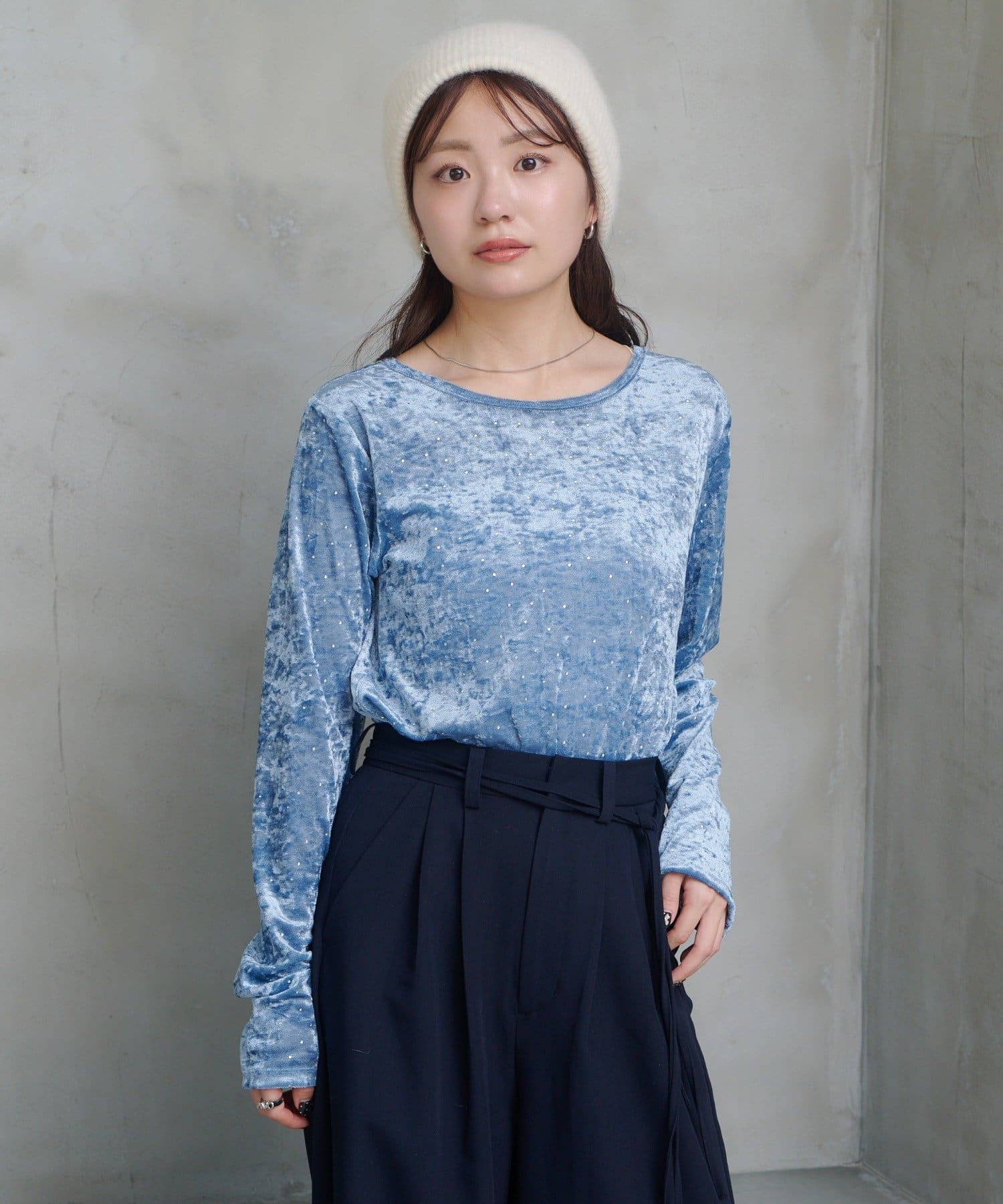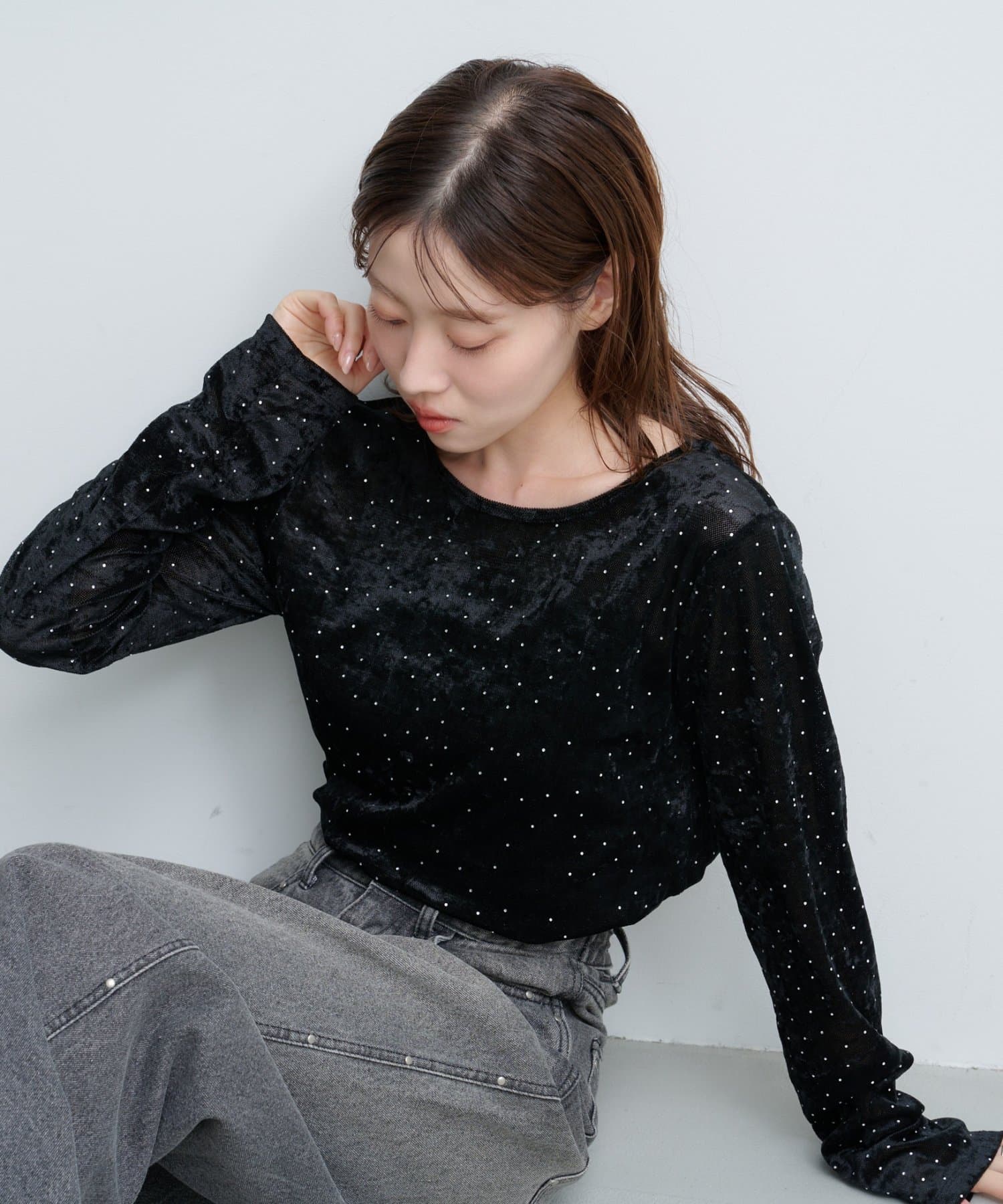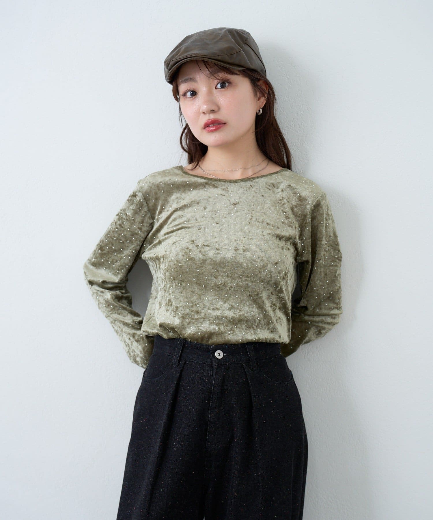 しっとりとした光沢感が魅力のベロア素材に細やかなスタッズを散りばめたカットソー。