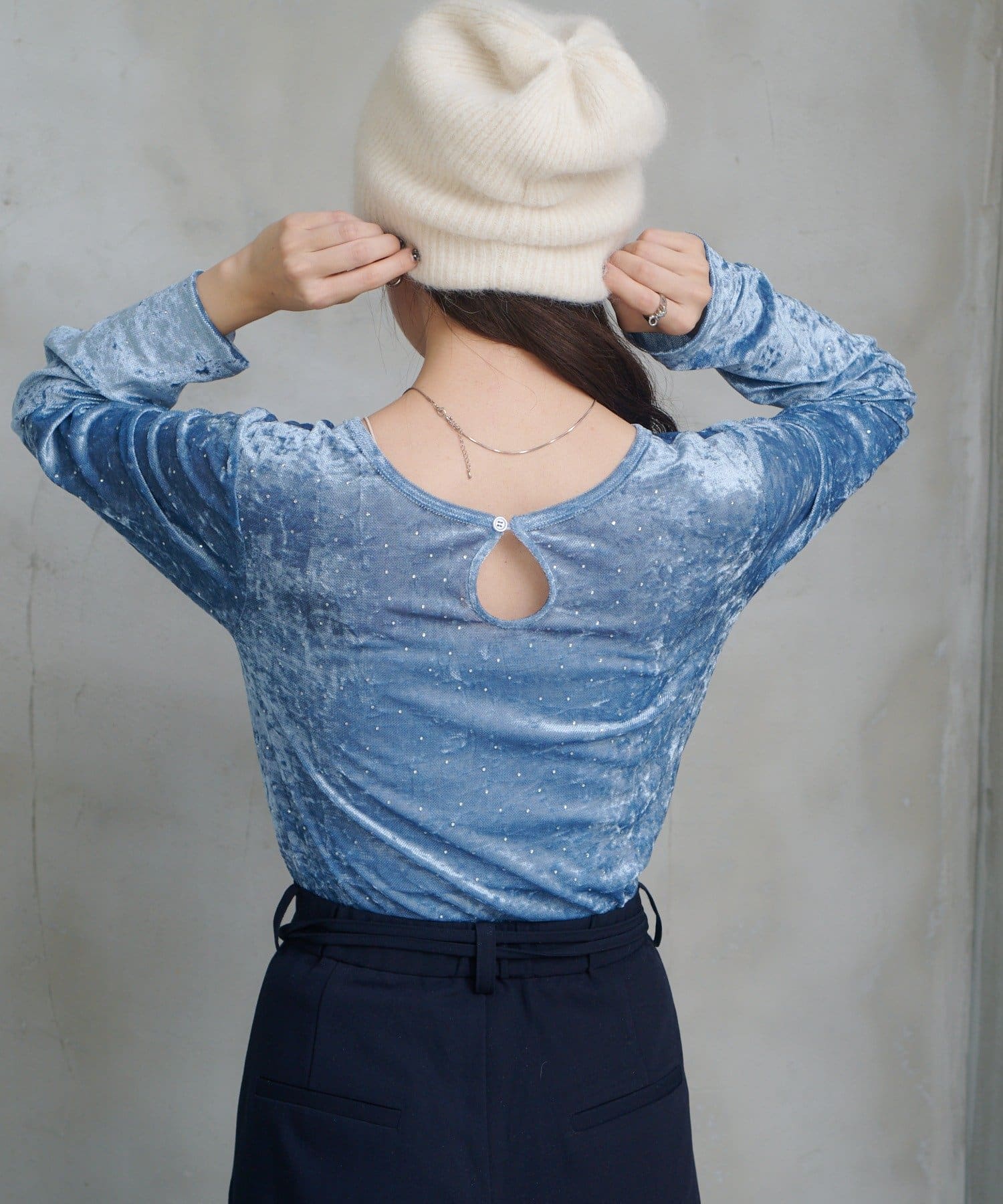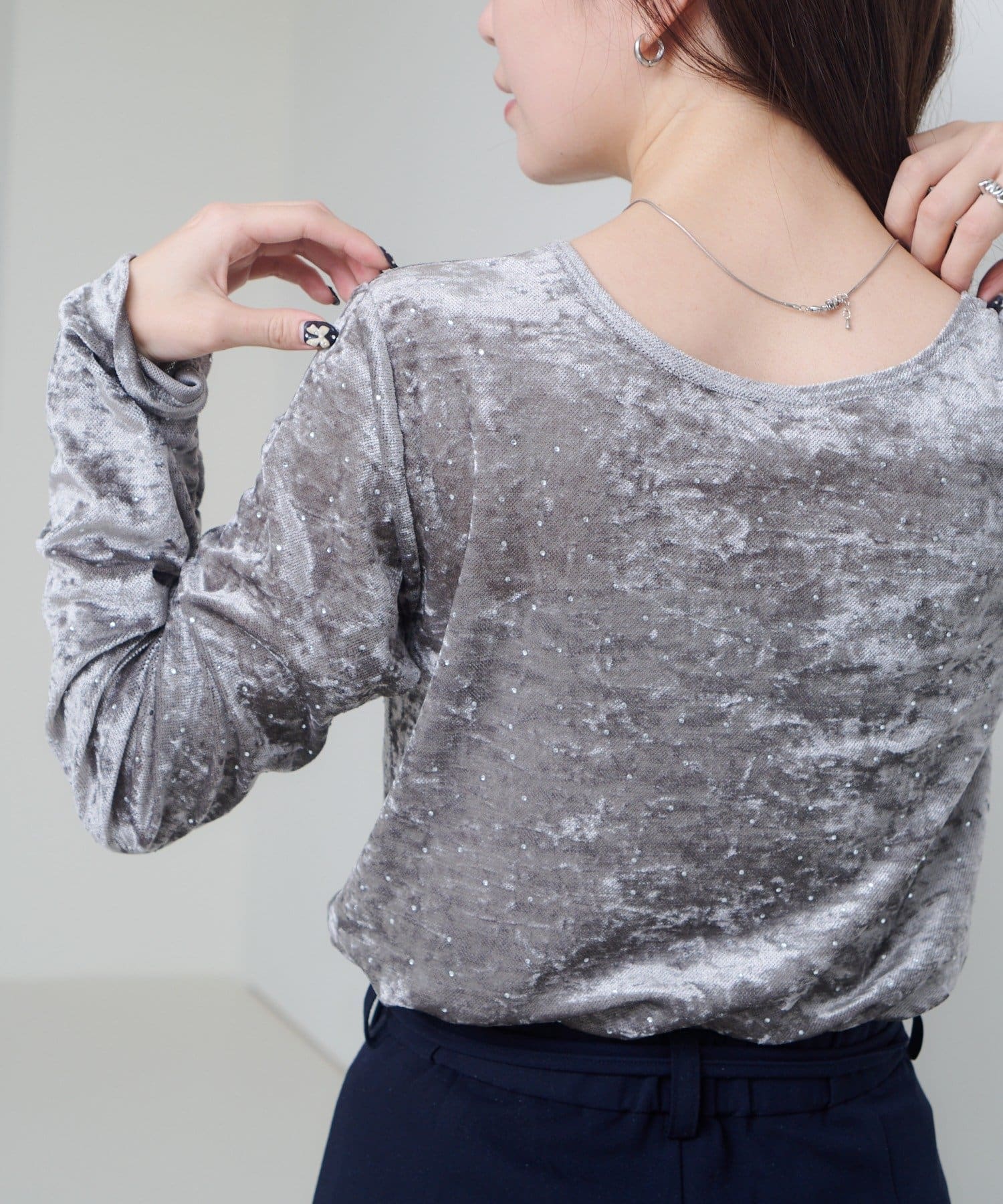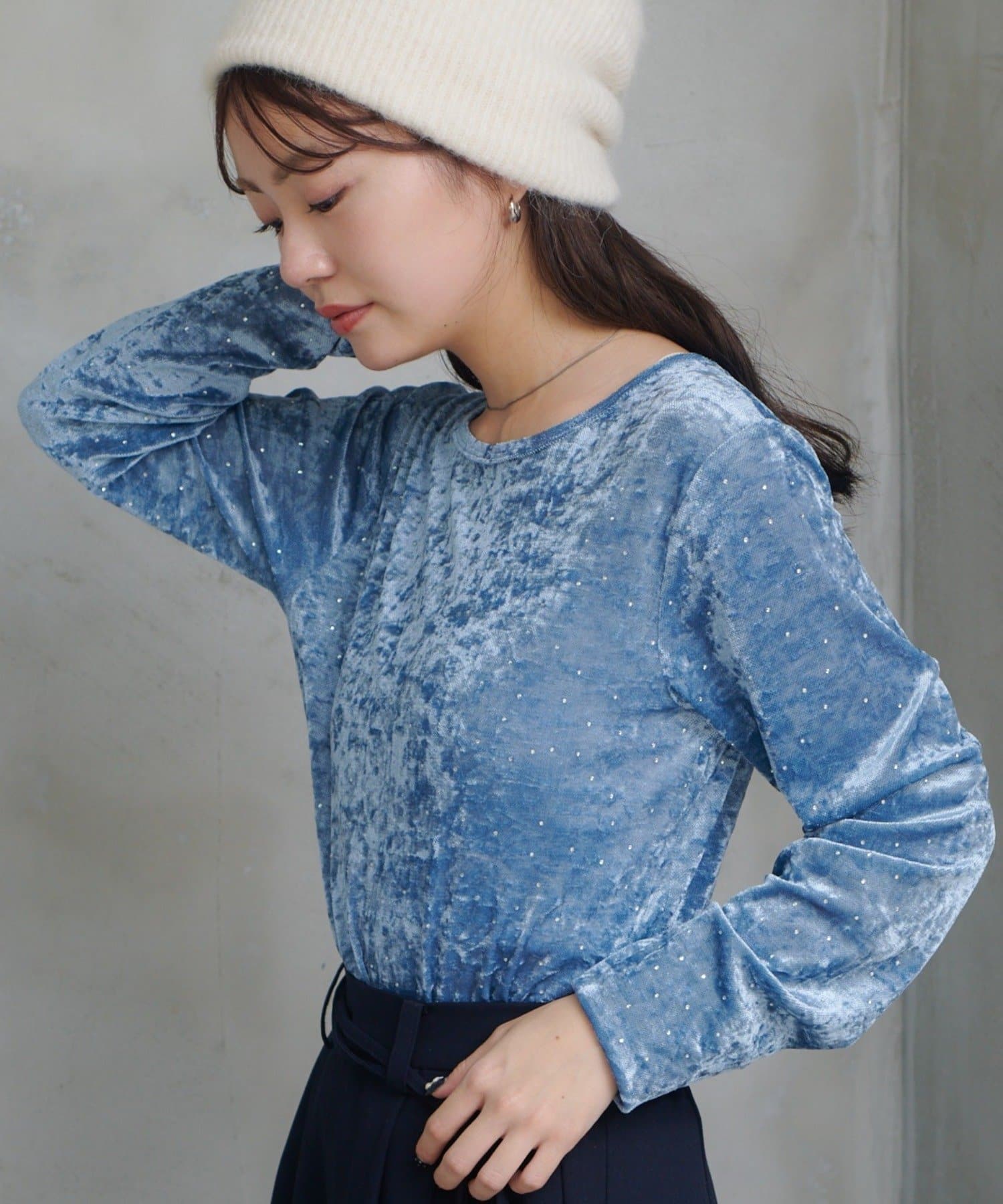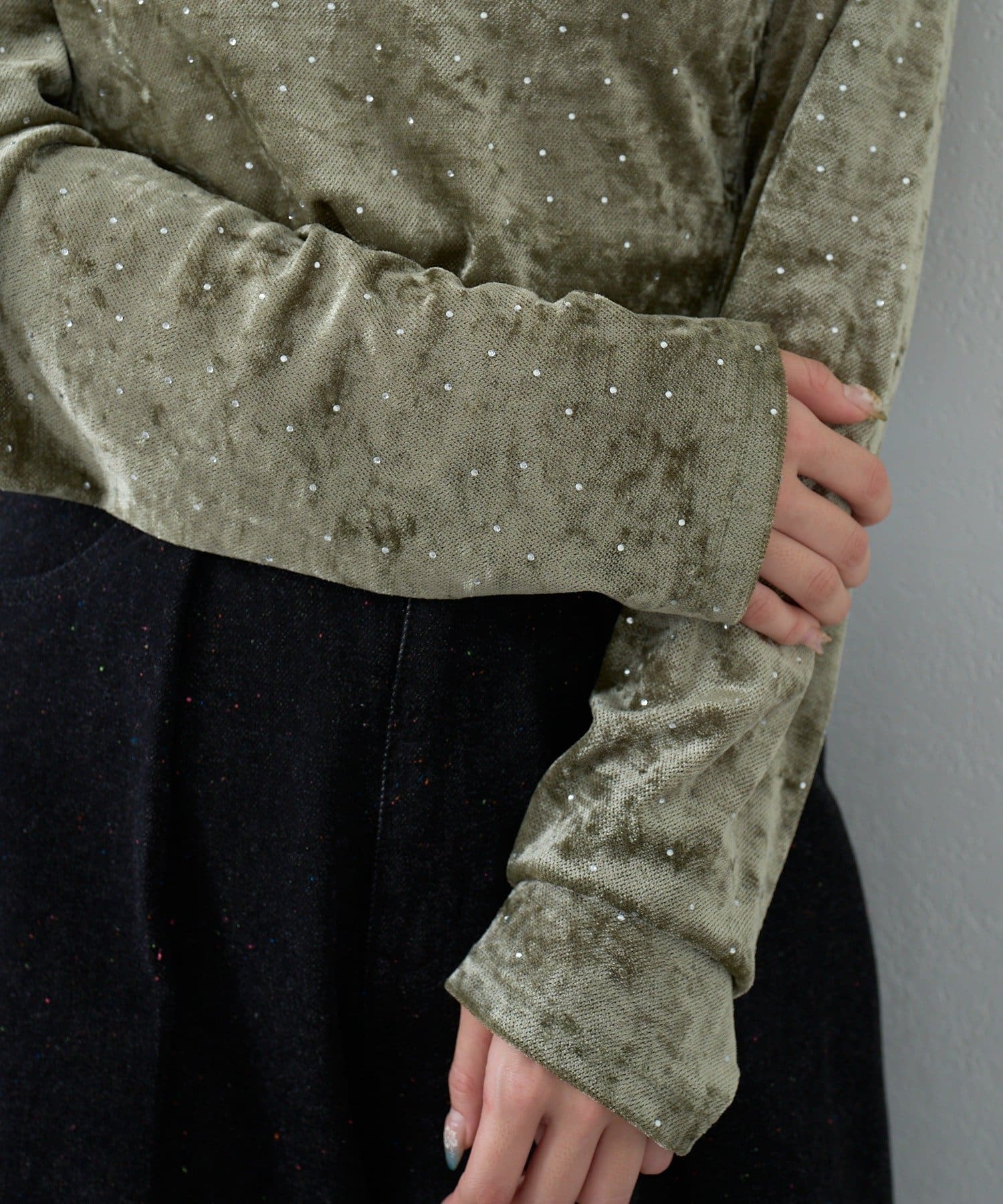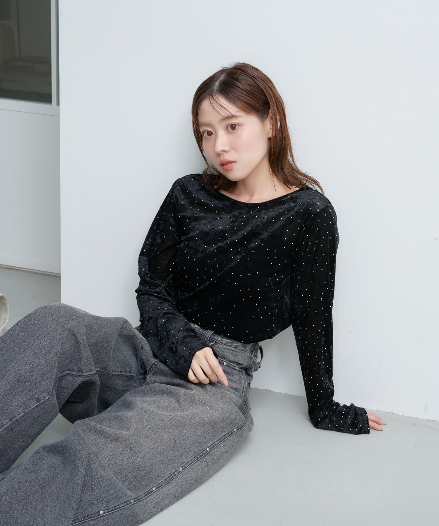 しっとりとした光沢感が魅力のベロア素材に細やかなスタッズを散りばめたカットソー。