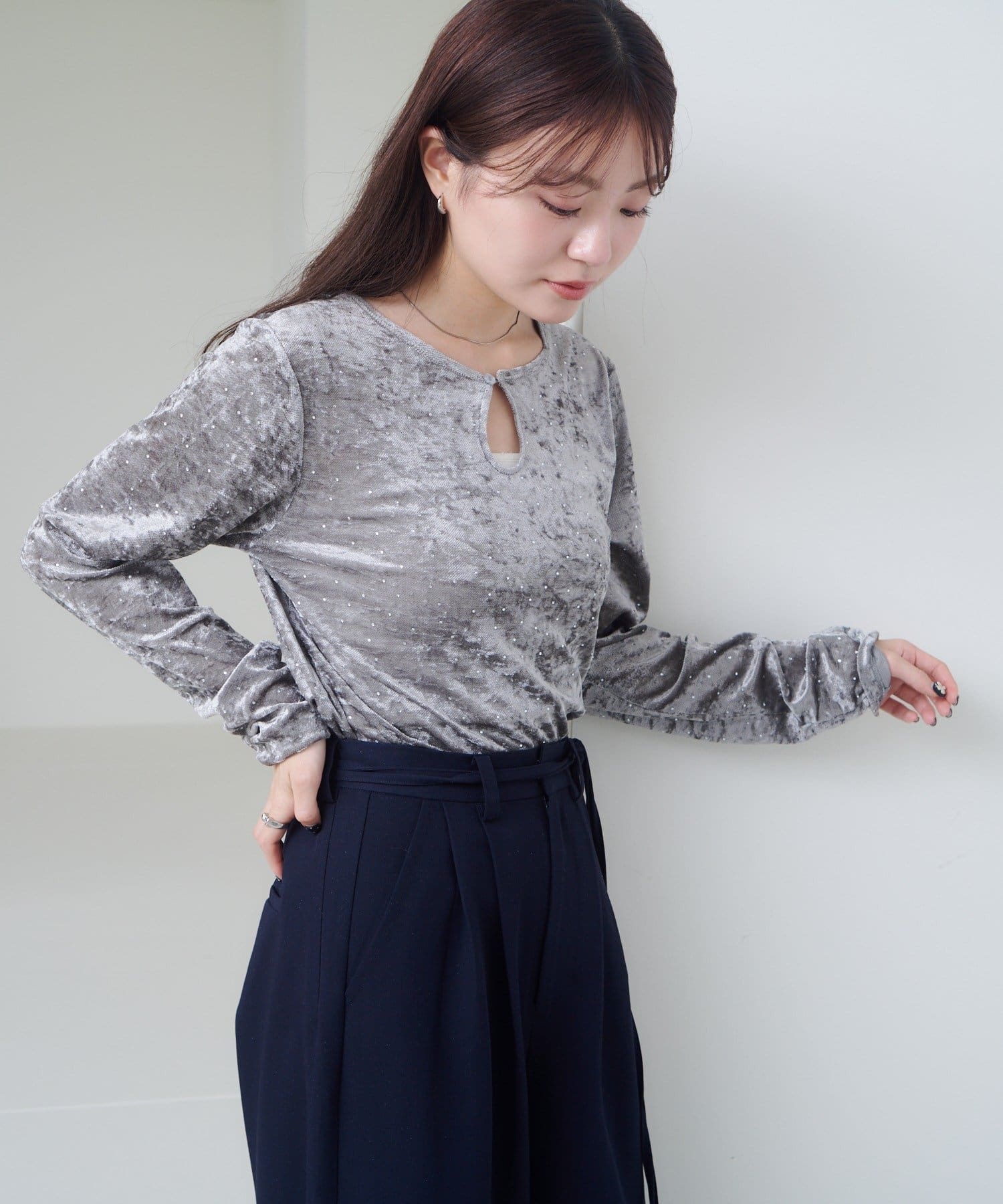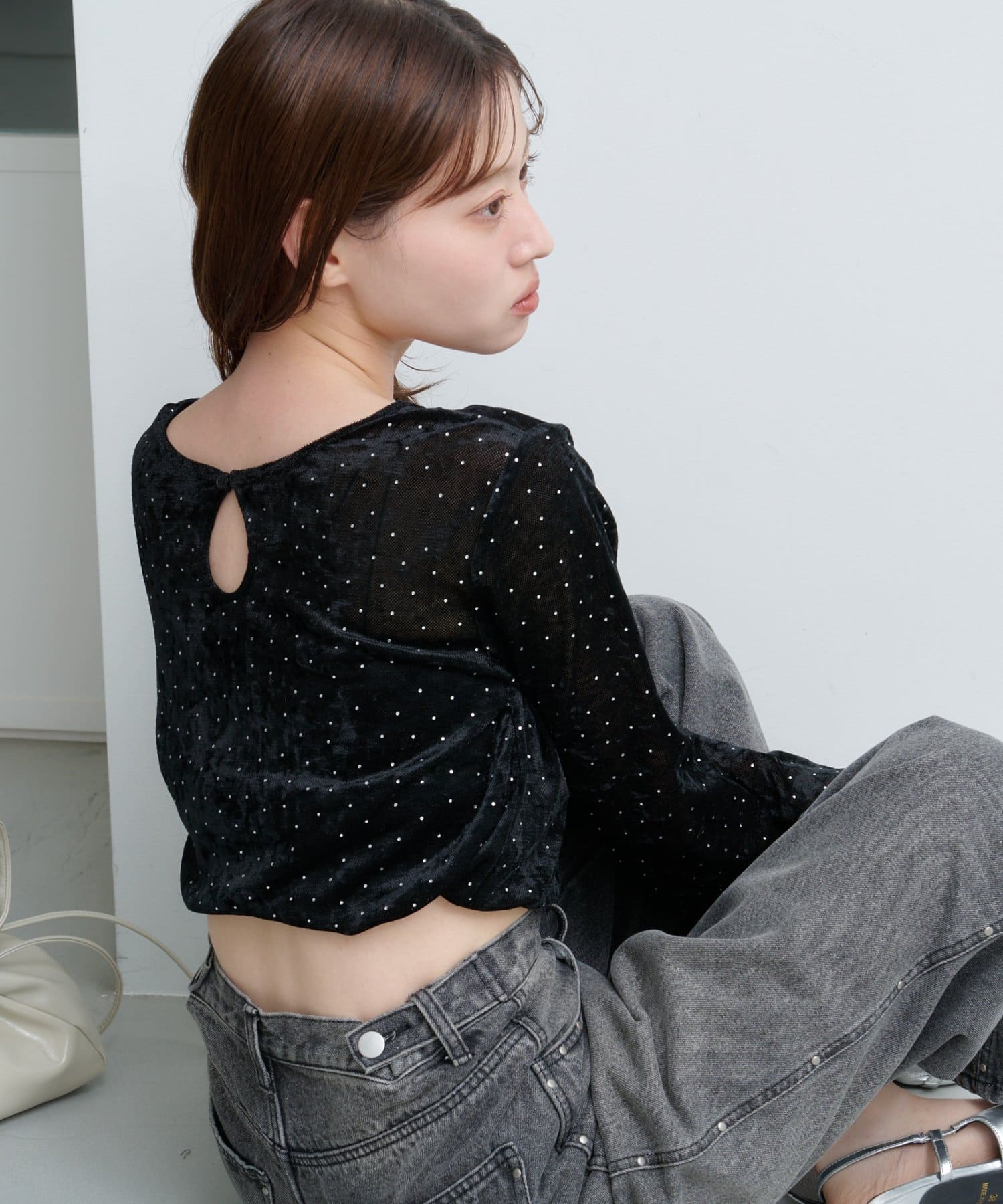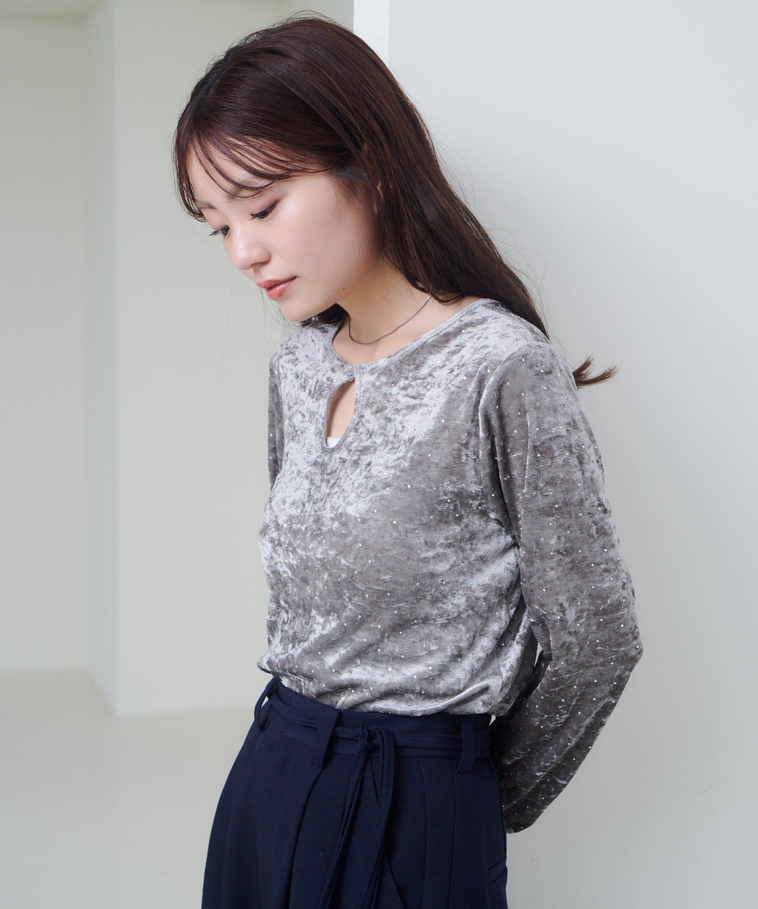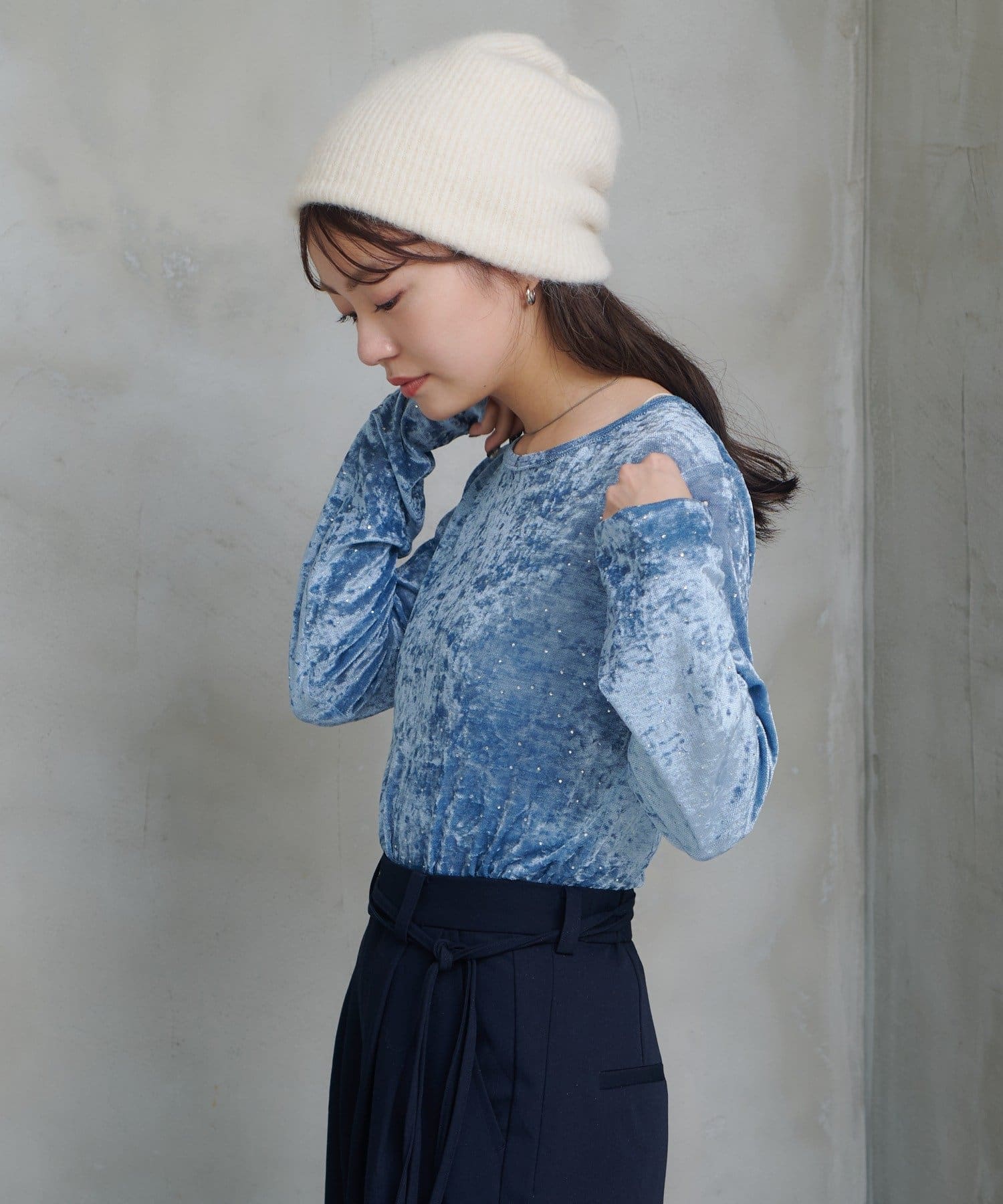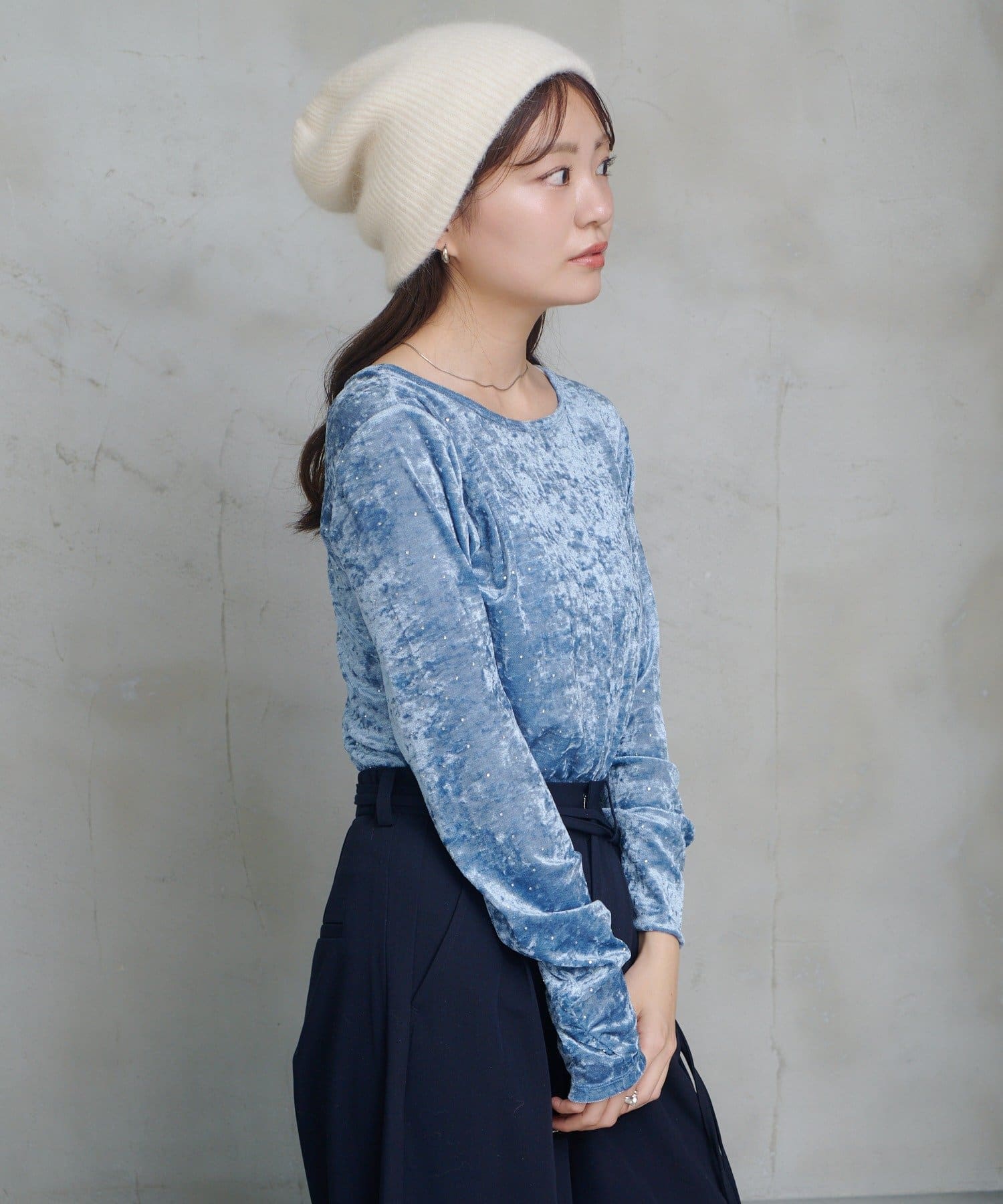 しっとりとした光沢感が魅力のベロア素材に細やかなスタッズを散りばめたカットソー。