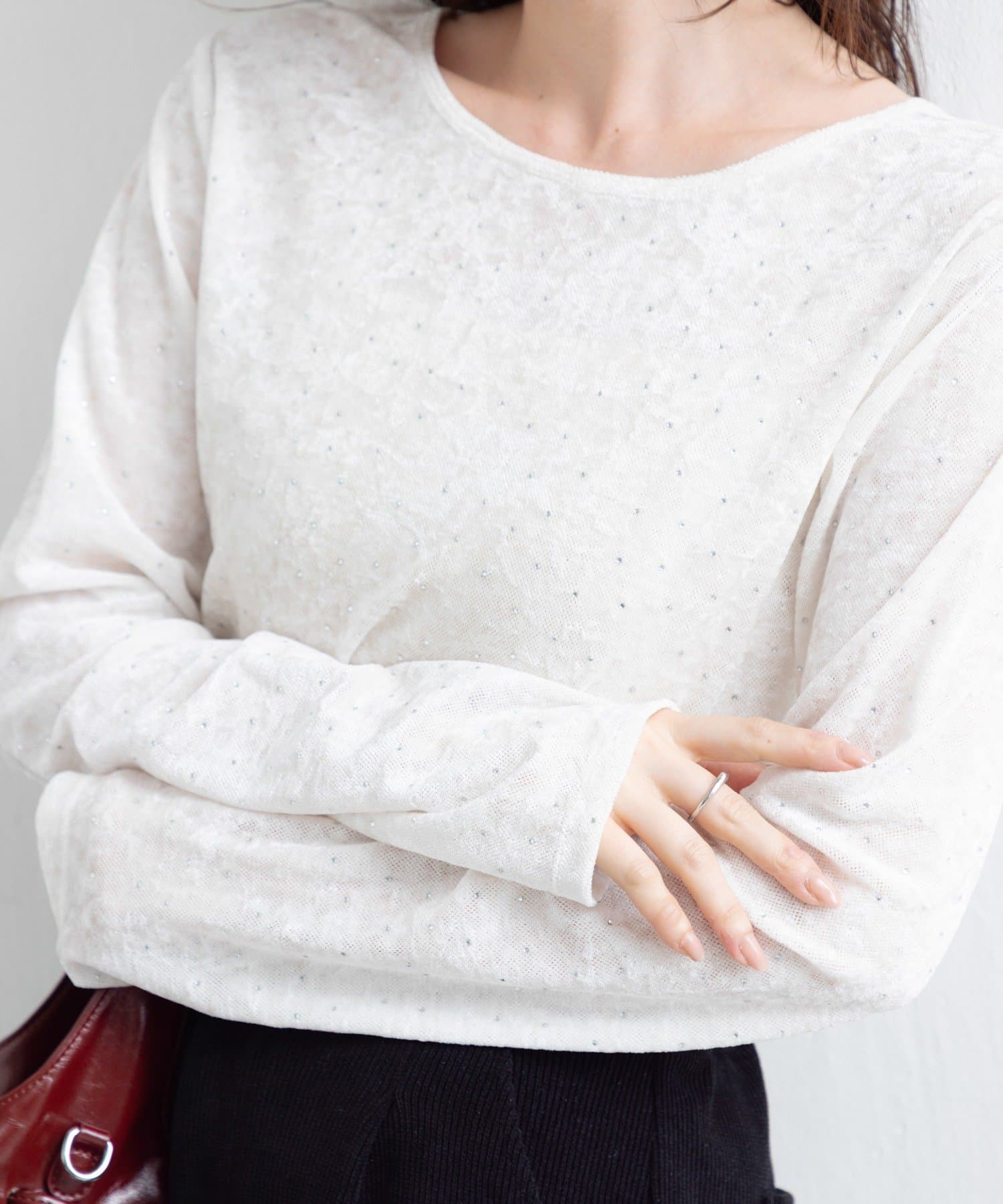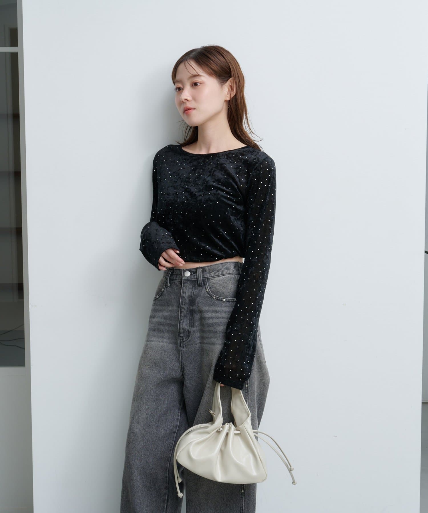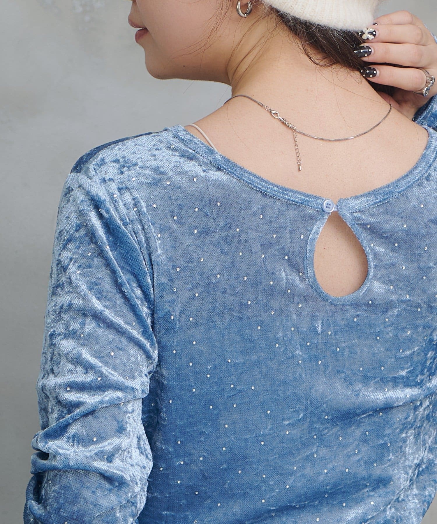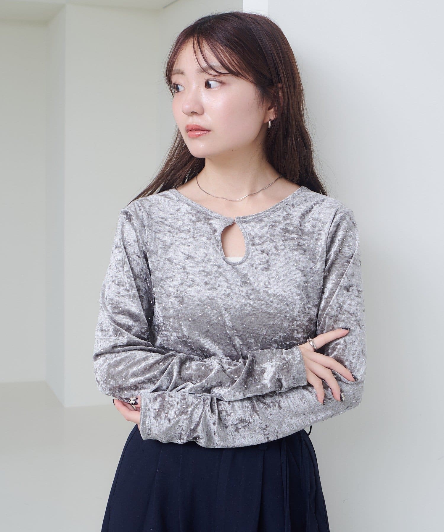 しっとりとした光沢感が魅力のベロア素材に細やかなスタッズを散りばめたカットソー。