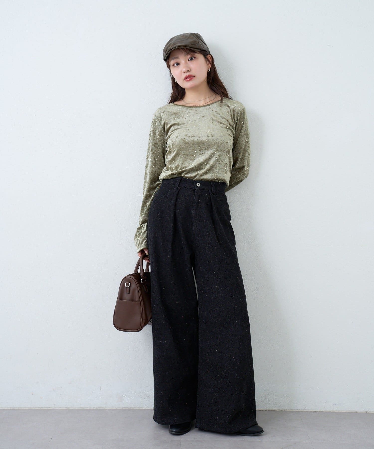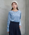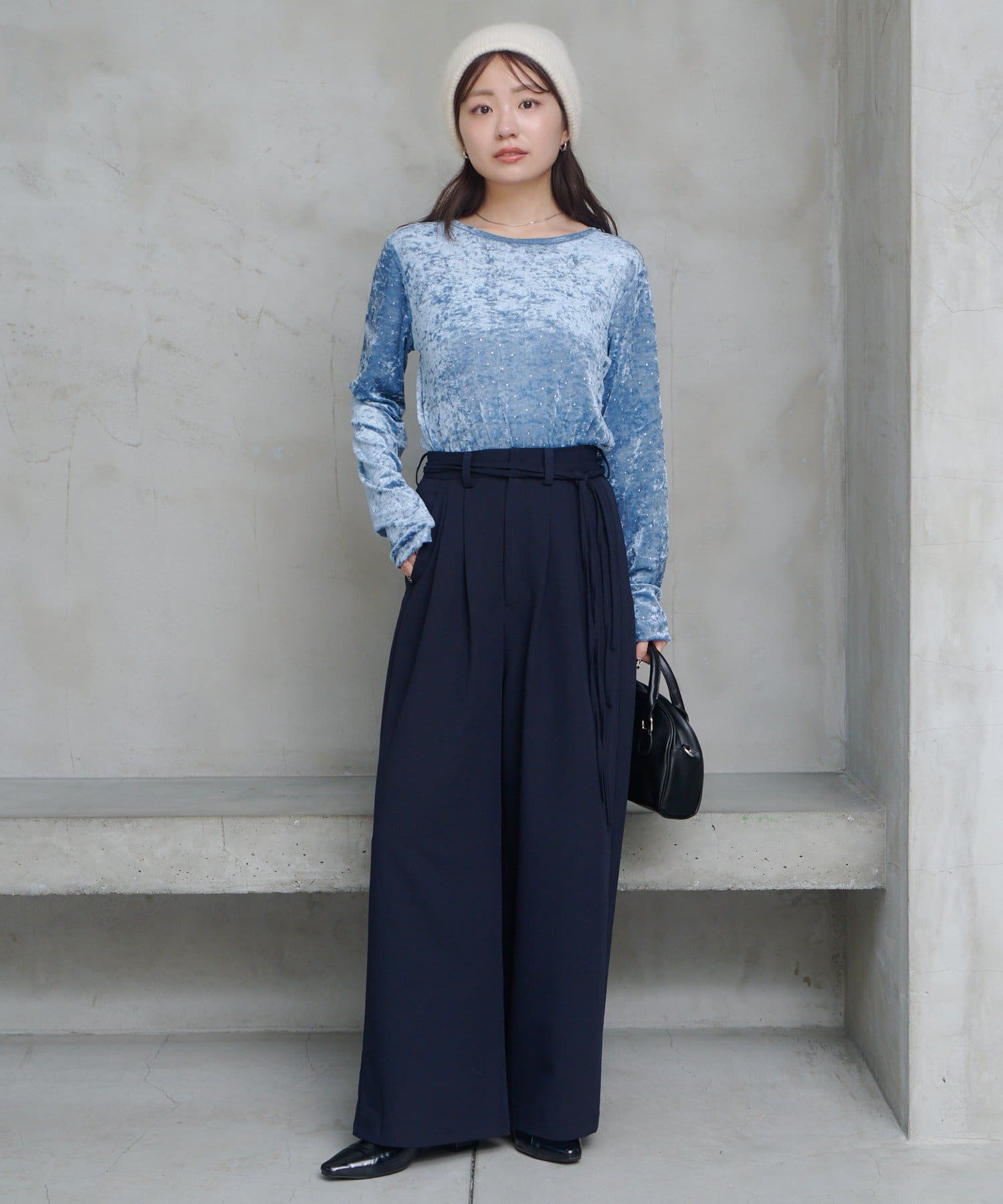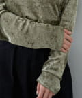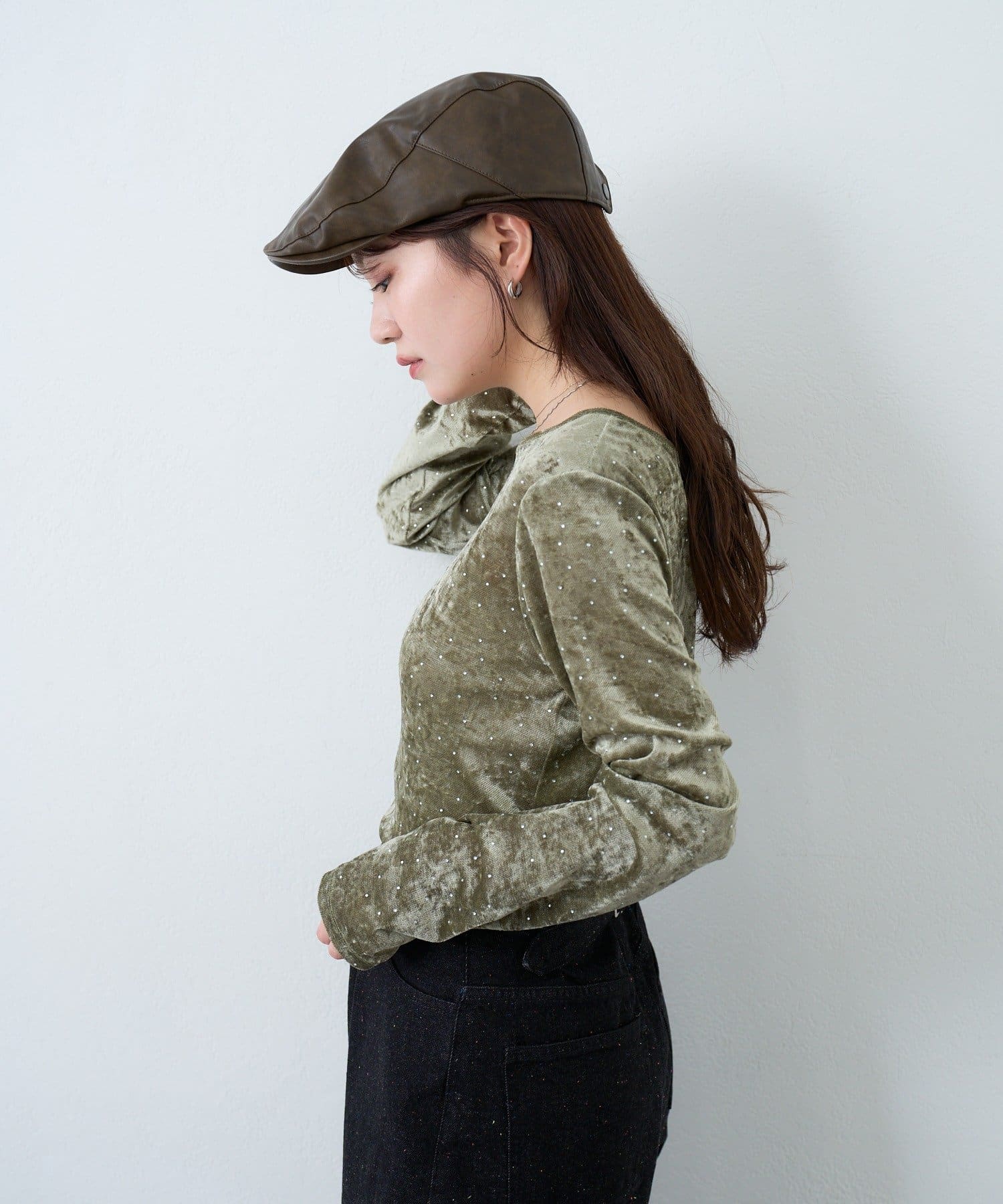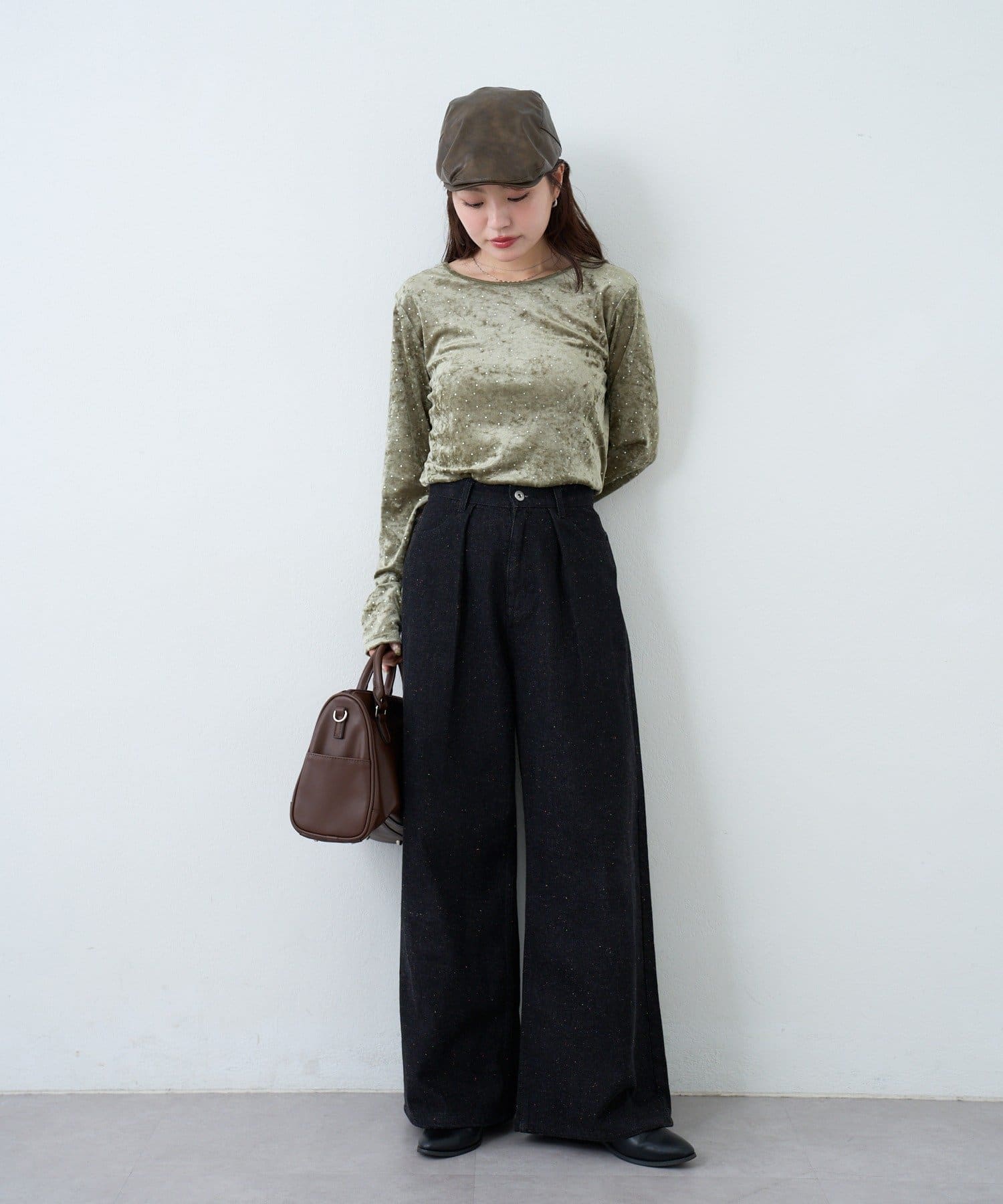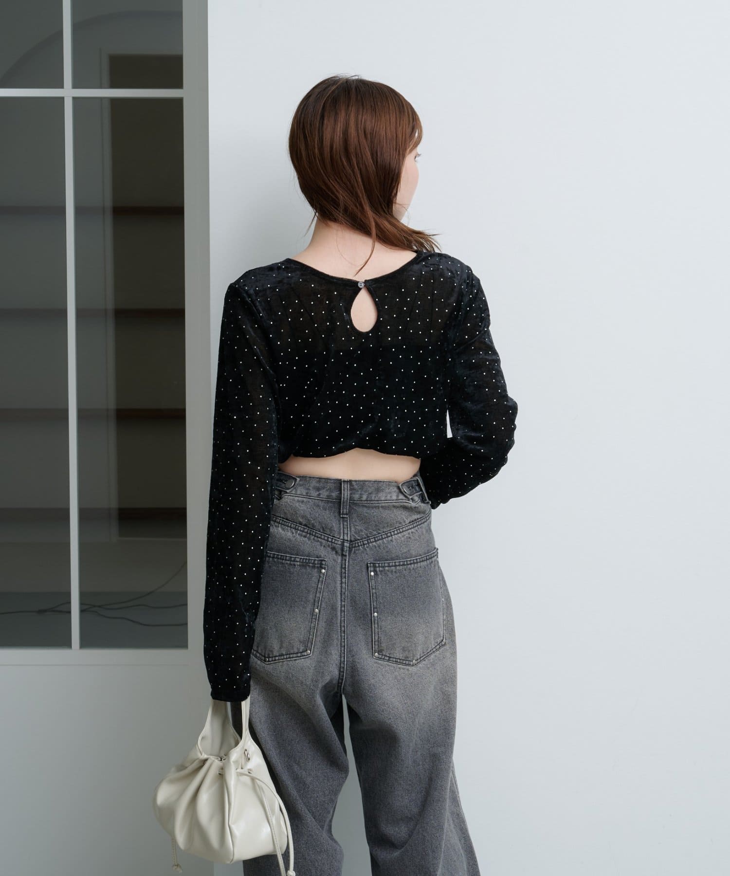 しっとりとした光沢感が魅力のベロア素材に細やかなスタッズを散りばめたカットソー。
