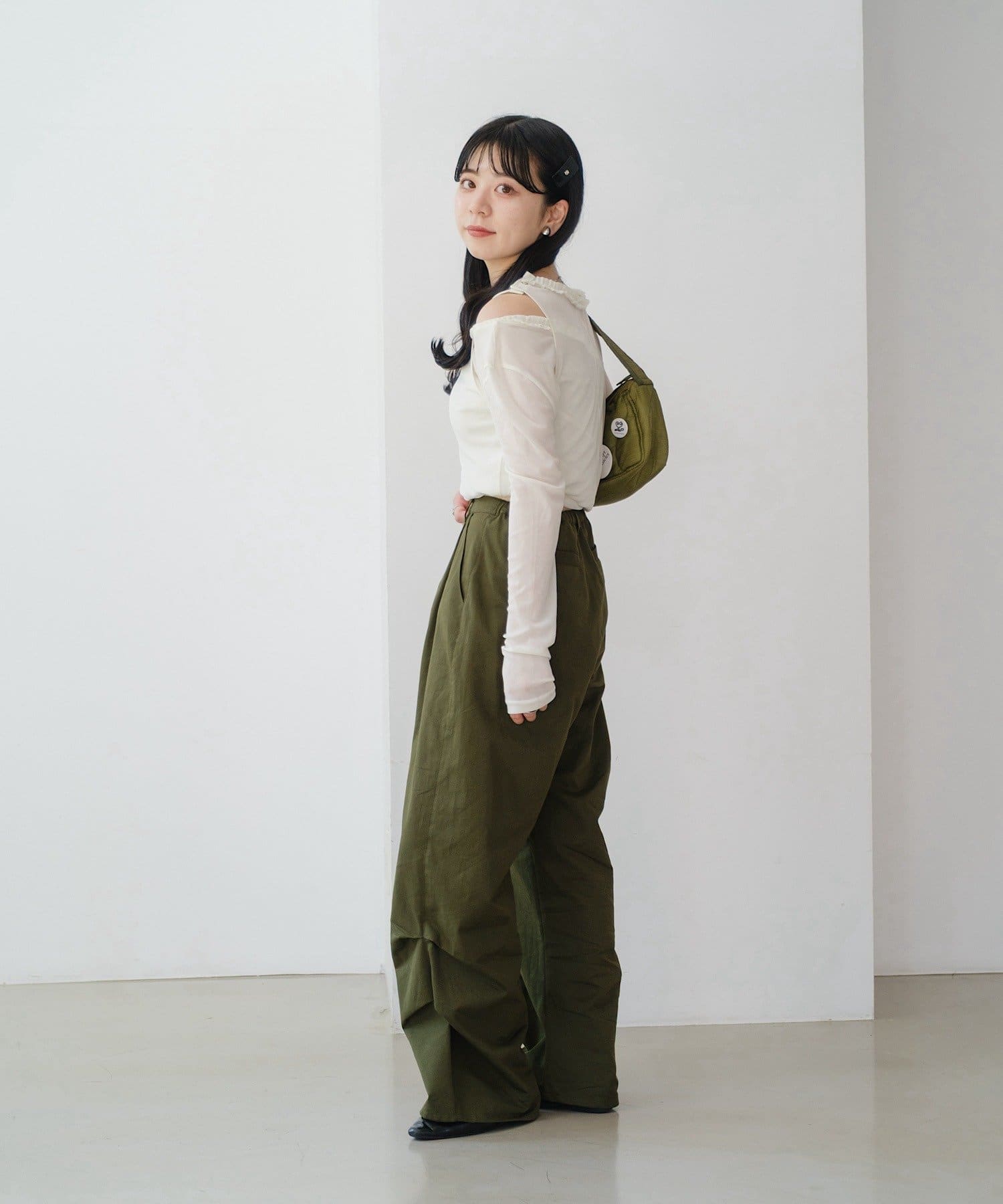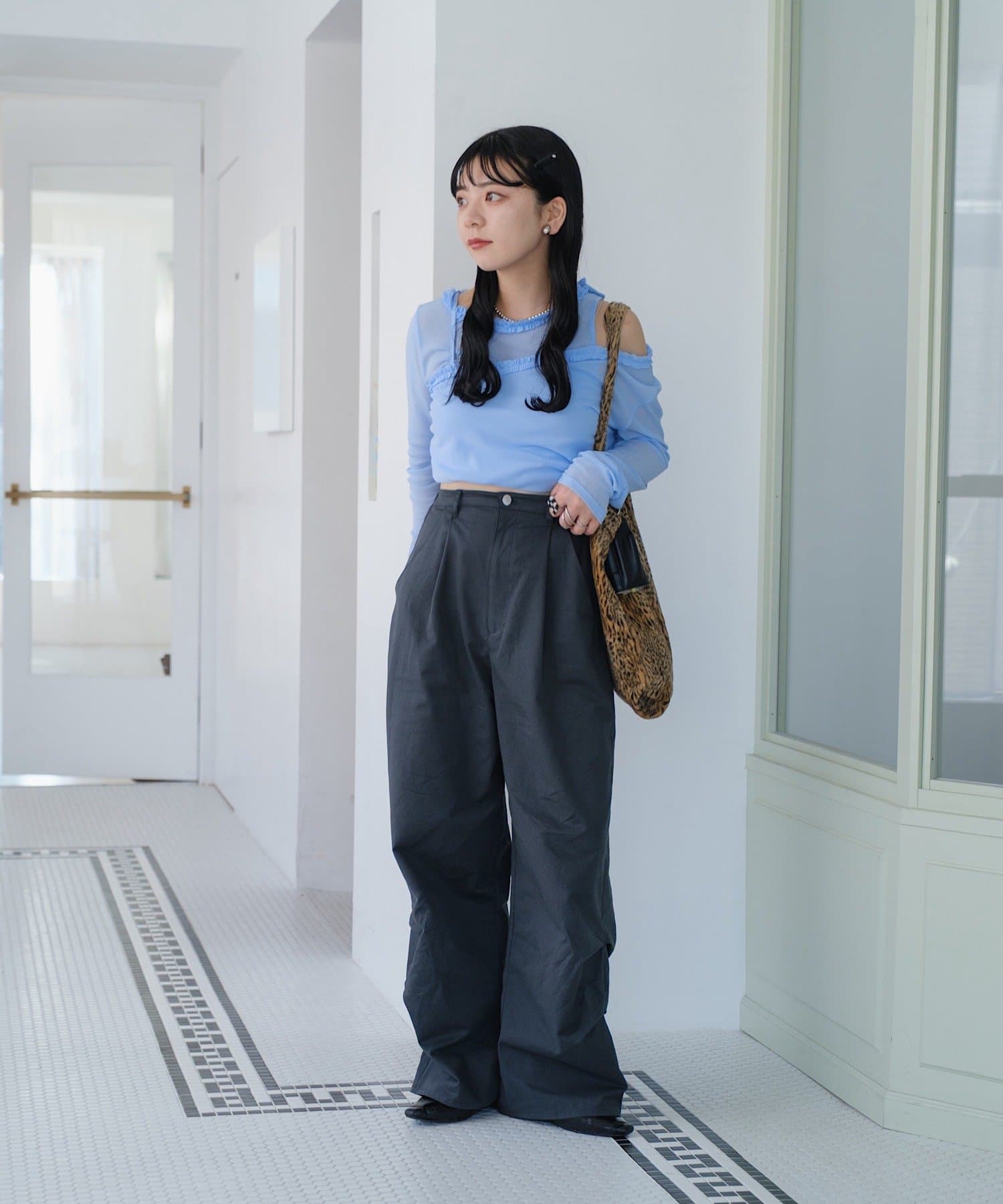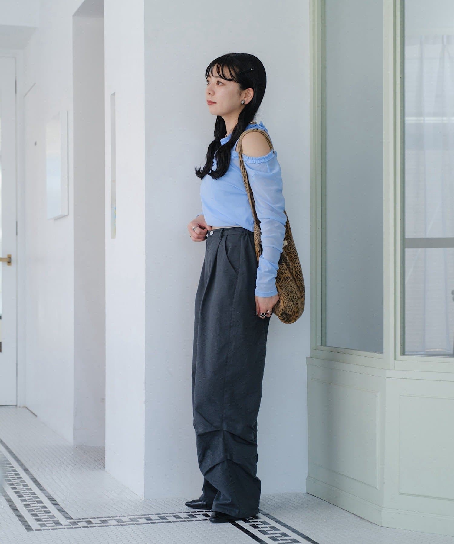 ワイドパンツとの相性が◎ですが、【YAMADA企画】スーパーハイデザインタックパンツと合わせると、より上半身が華奢見えします。