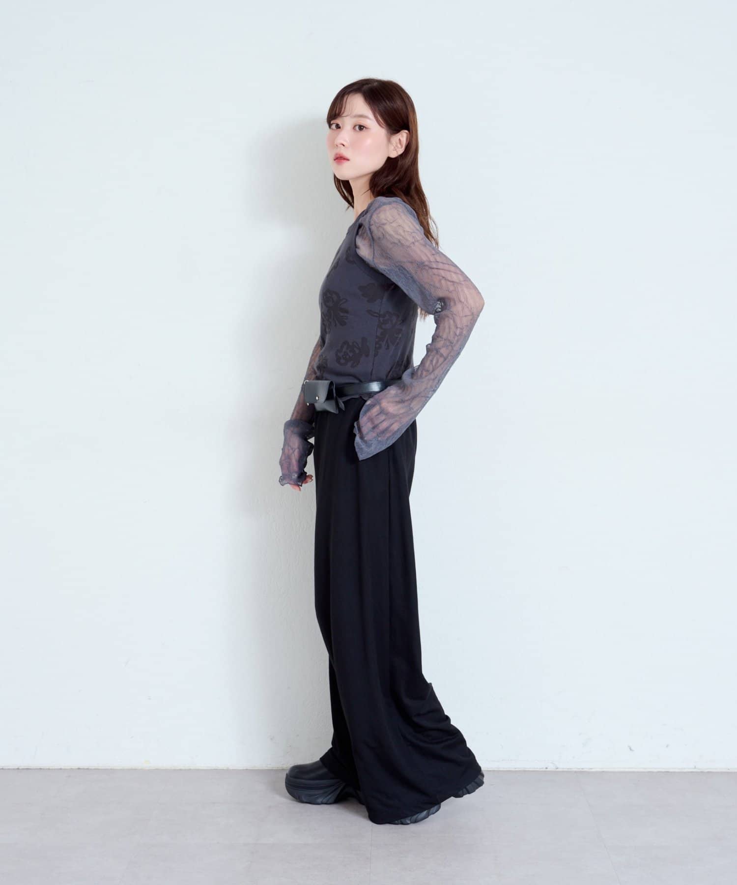 透け感のあるフラワーパターンがシックに映え、大人っぽい華やかさをプラスします。