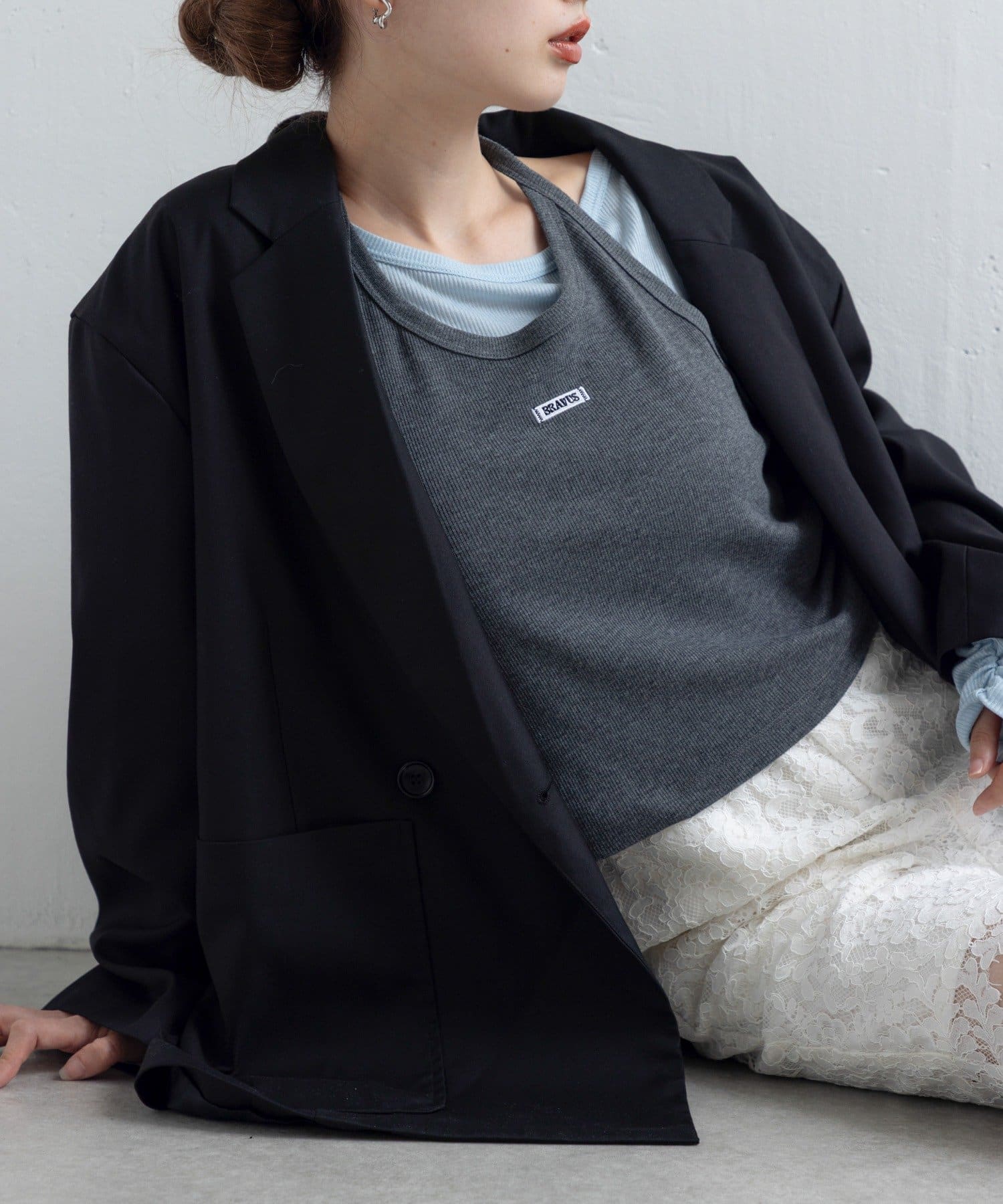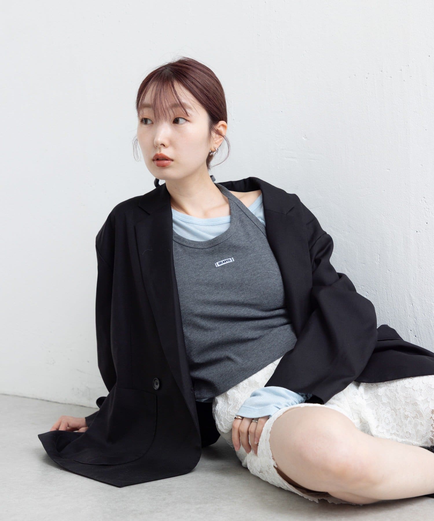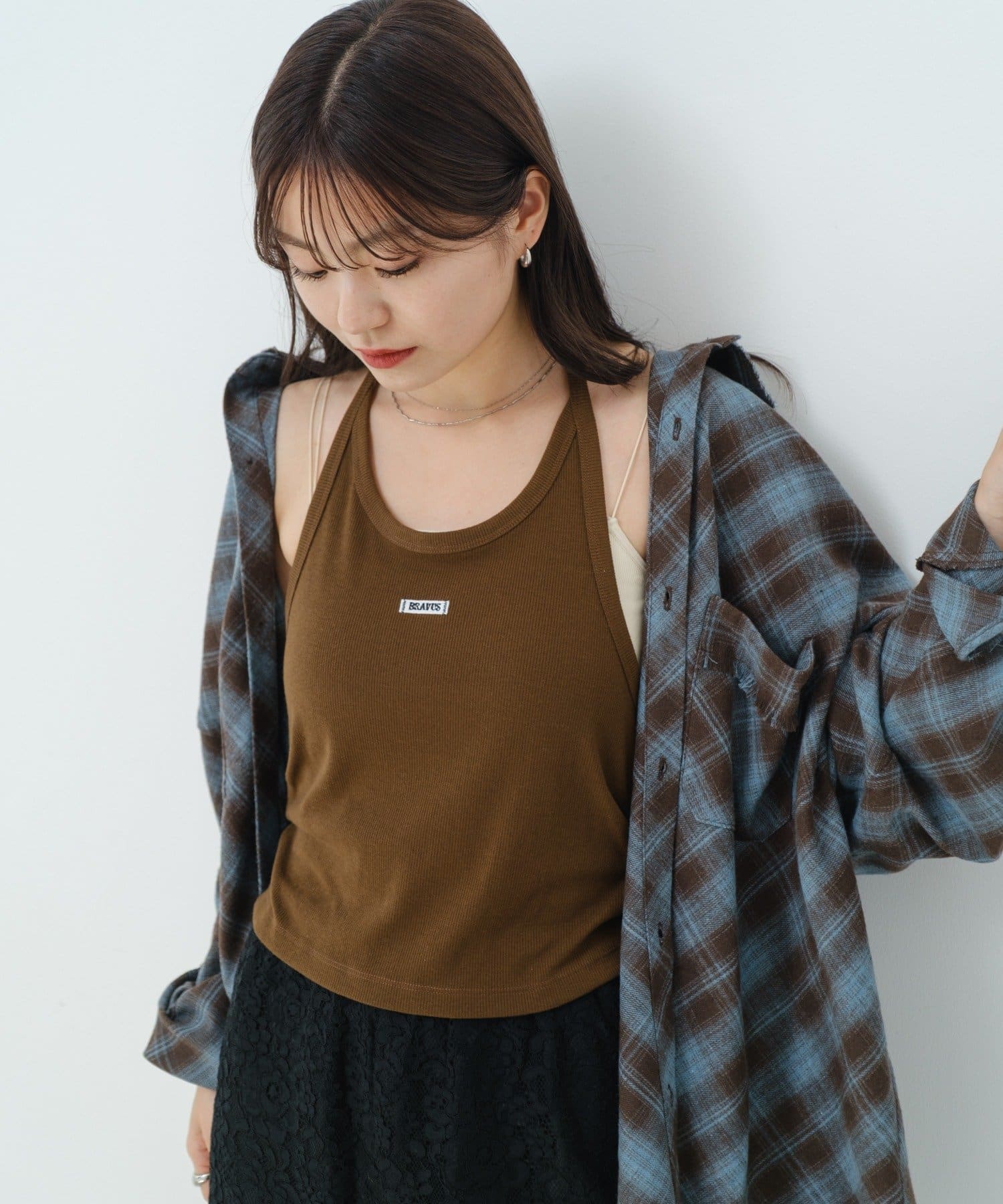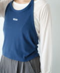 タンクトップは胸元にワンポイントのロゴタグ付きで、シンプルながらもアクセントに。