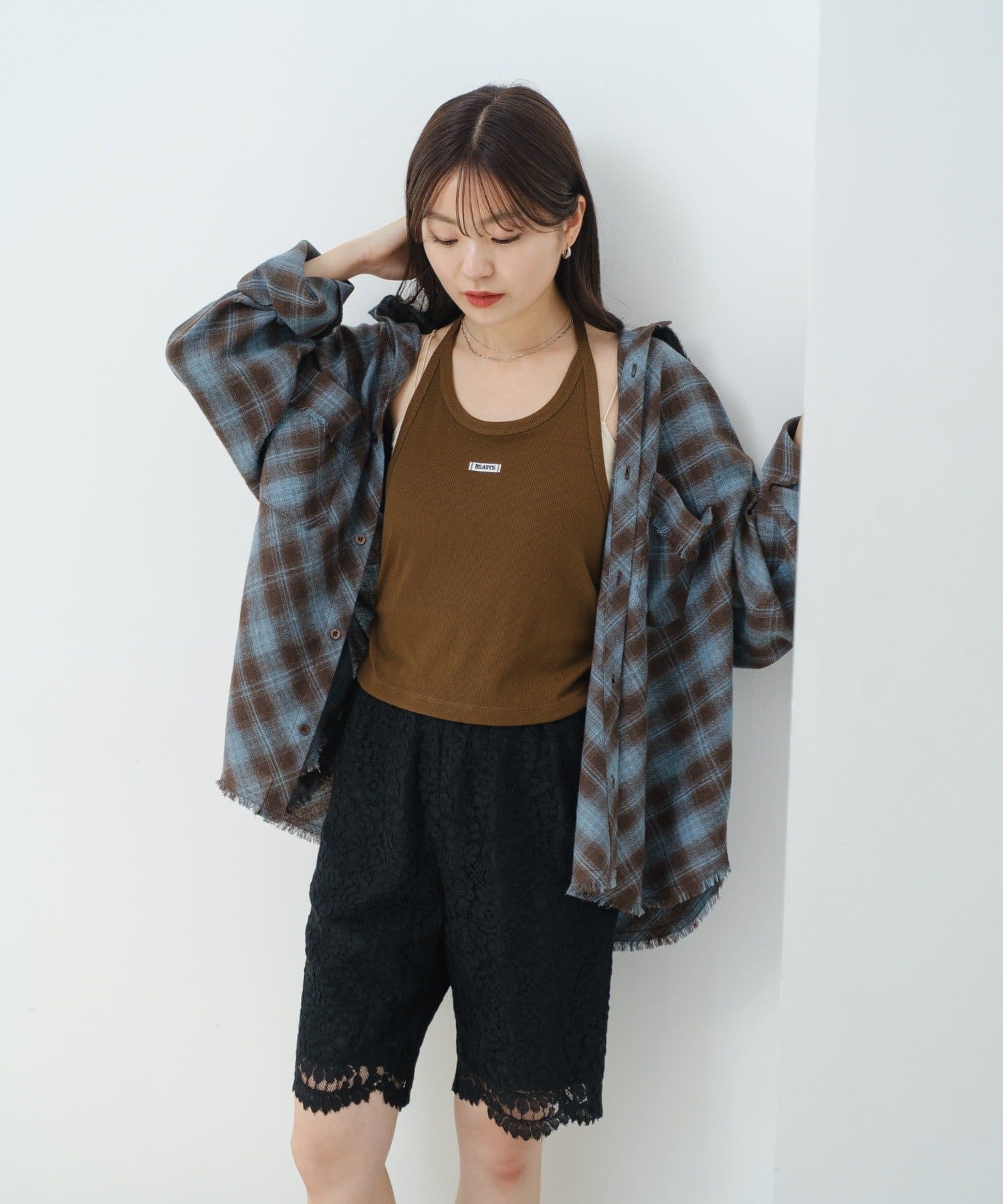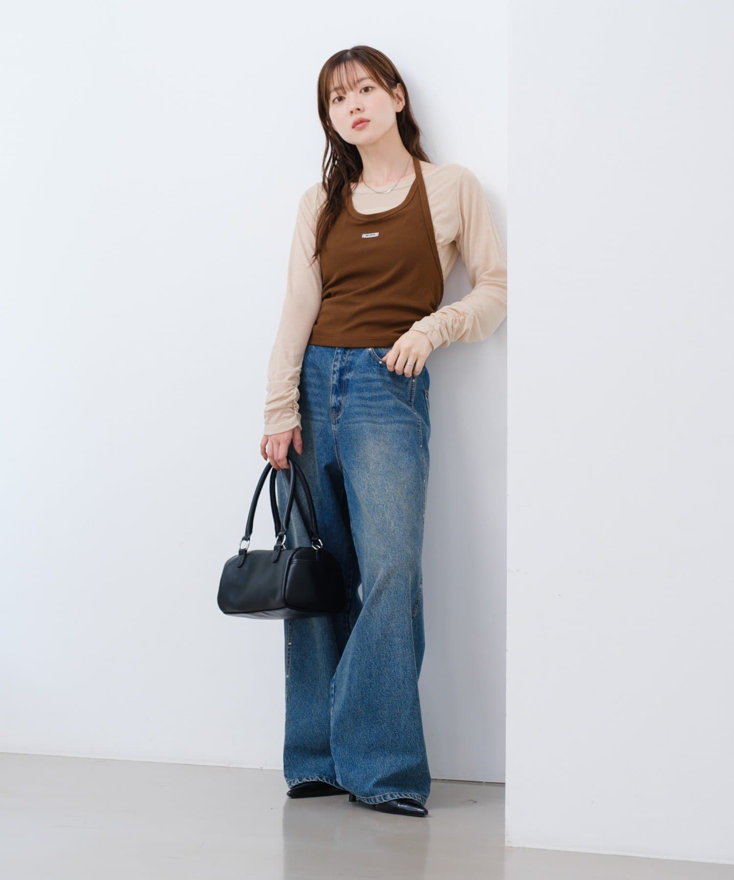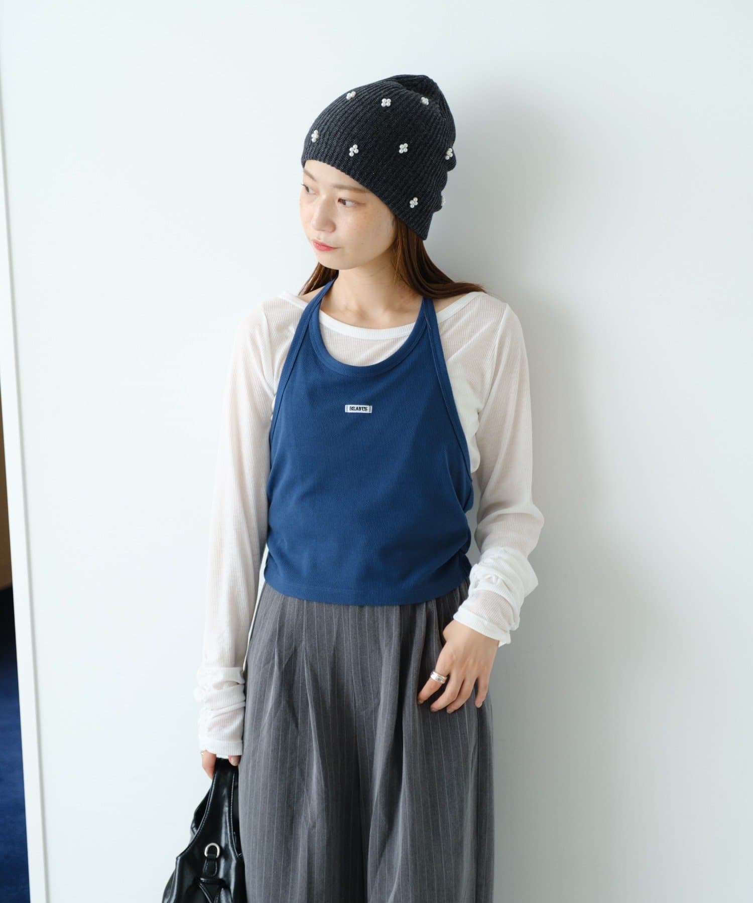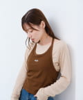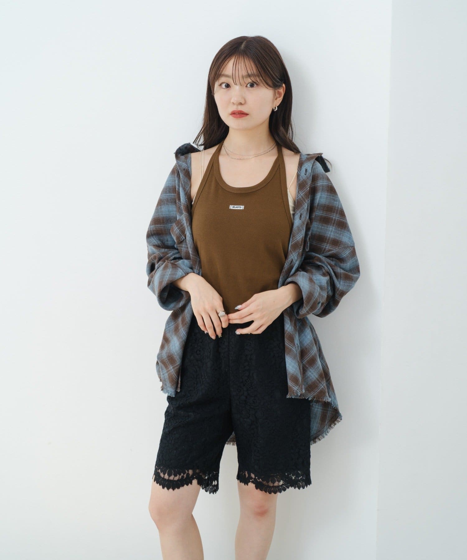 タンクトップは胸元にワンポイントのロゴタグ付きで、シンプルながらもアクセントに。