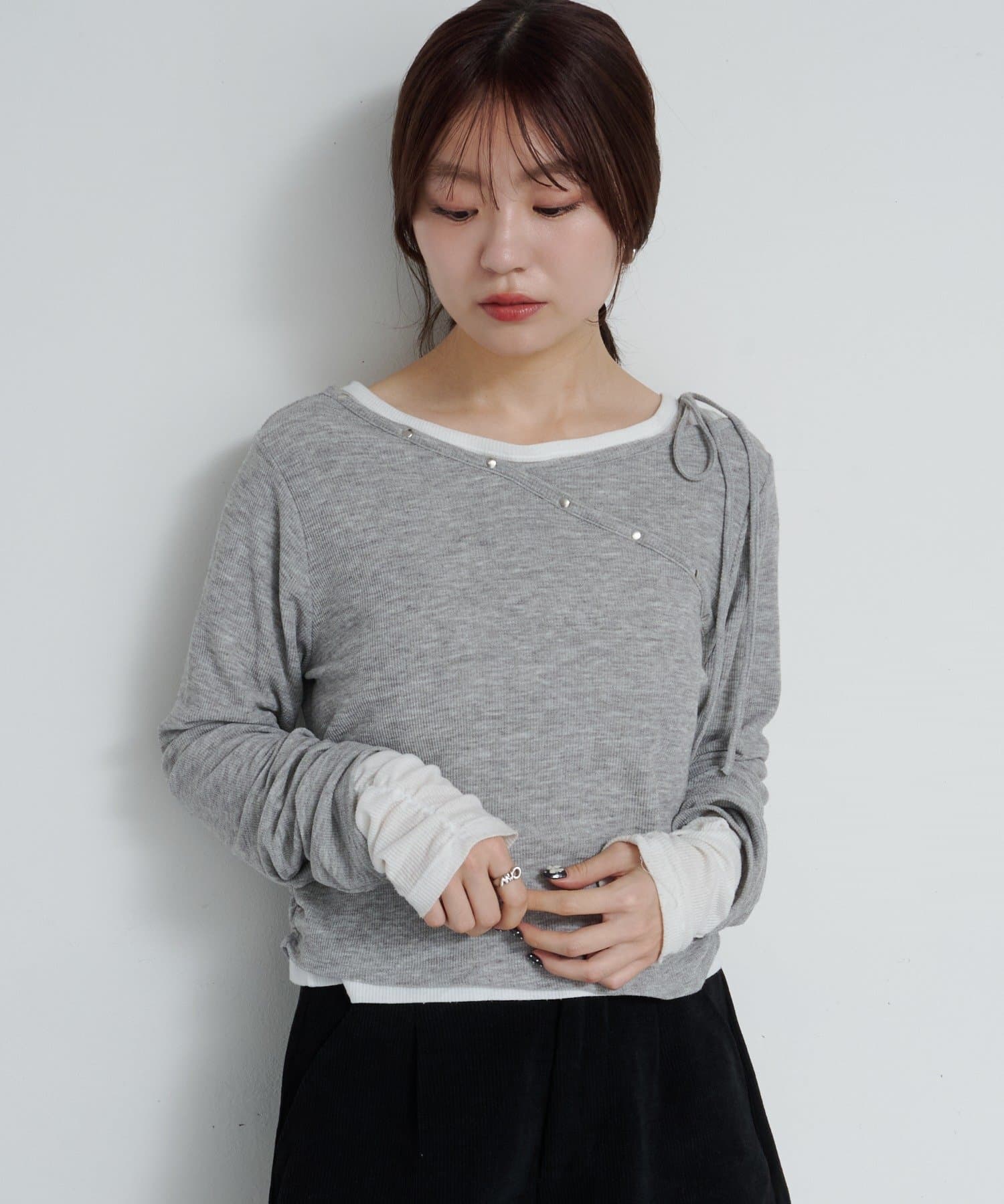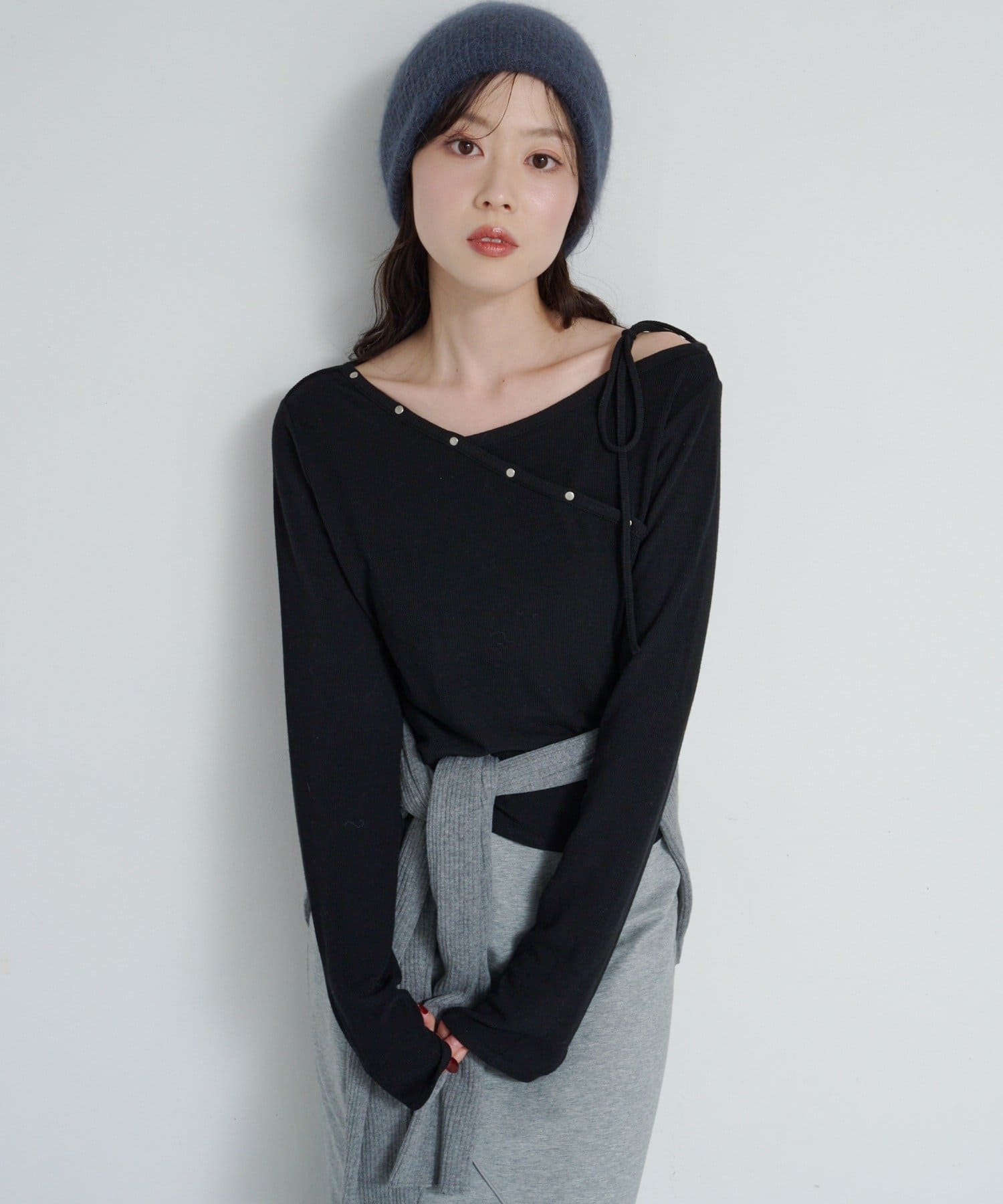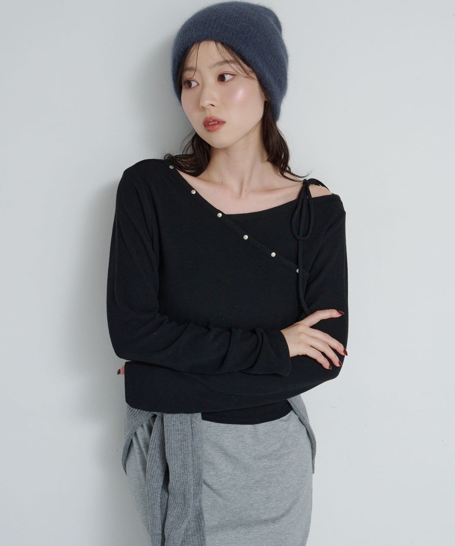 ネックラインにあしらったスタッズがアクセントになるデザイントップス。