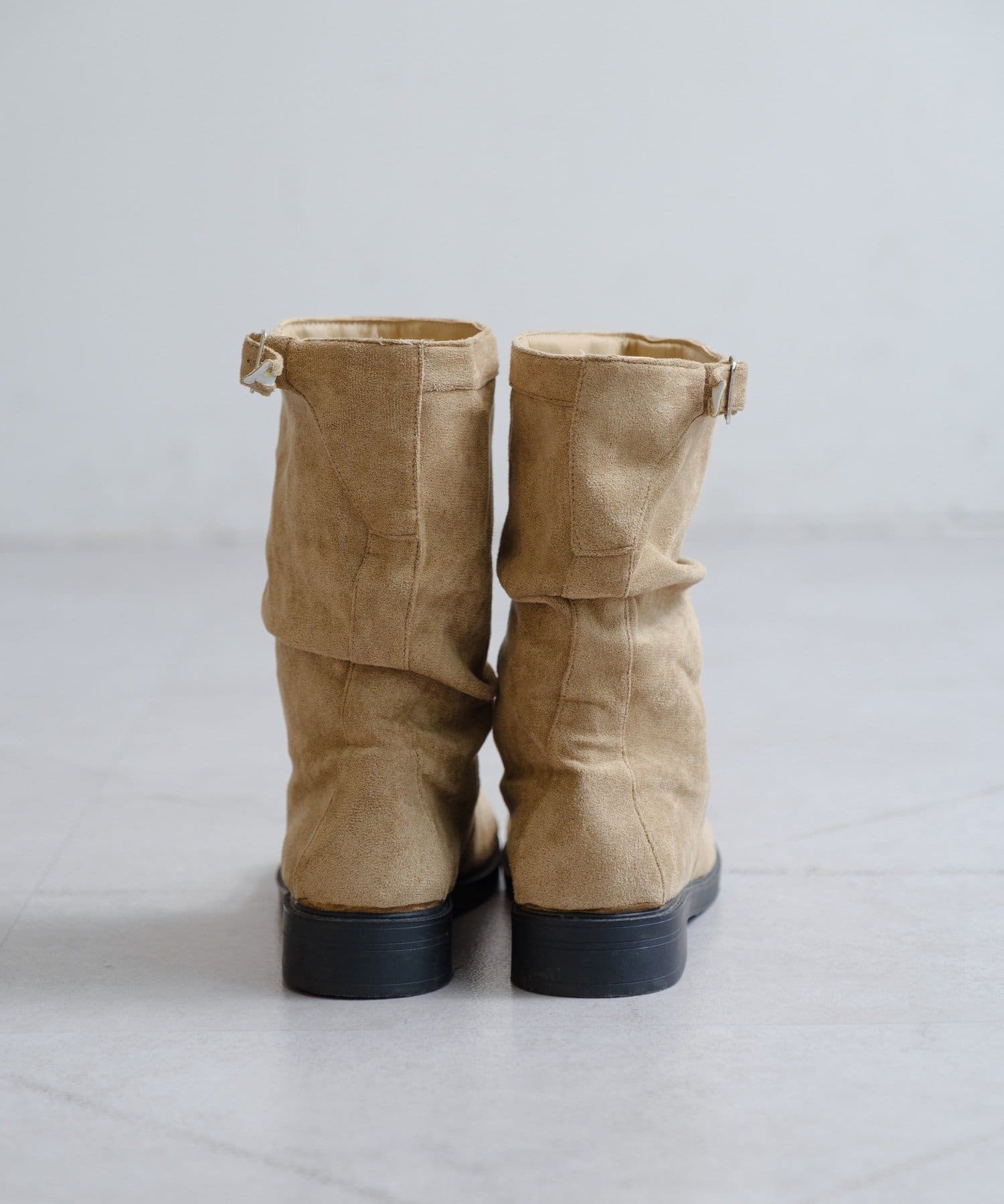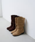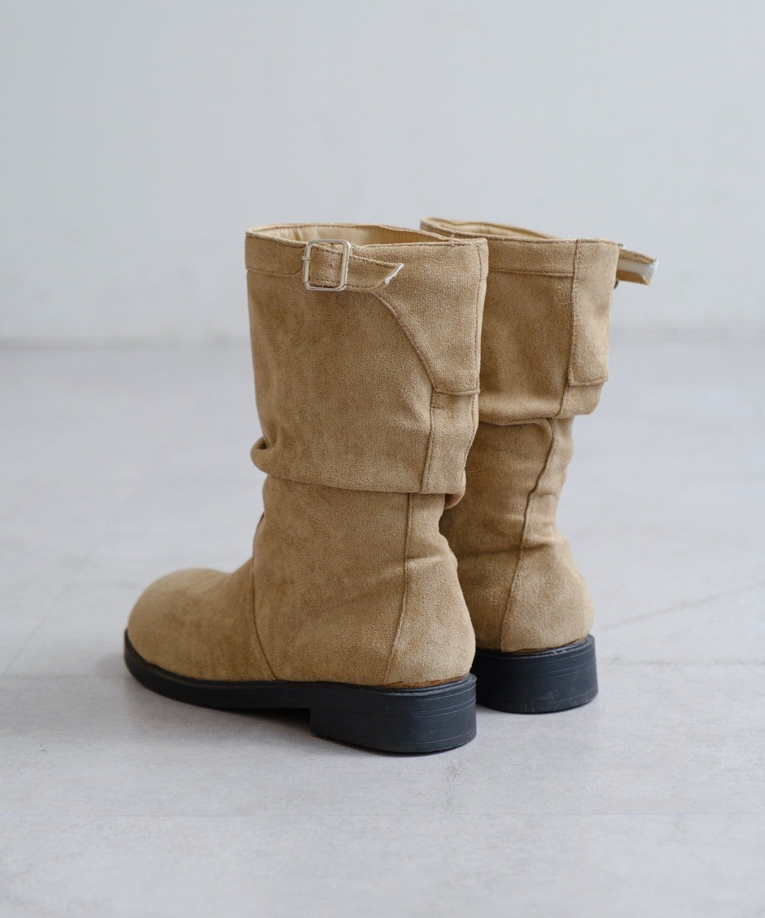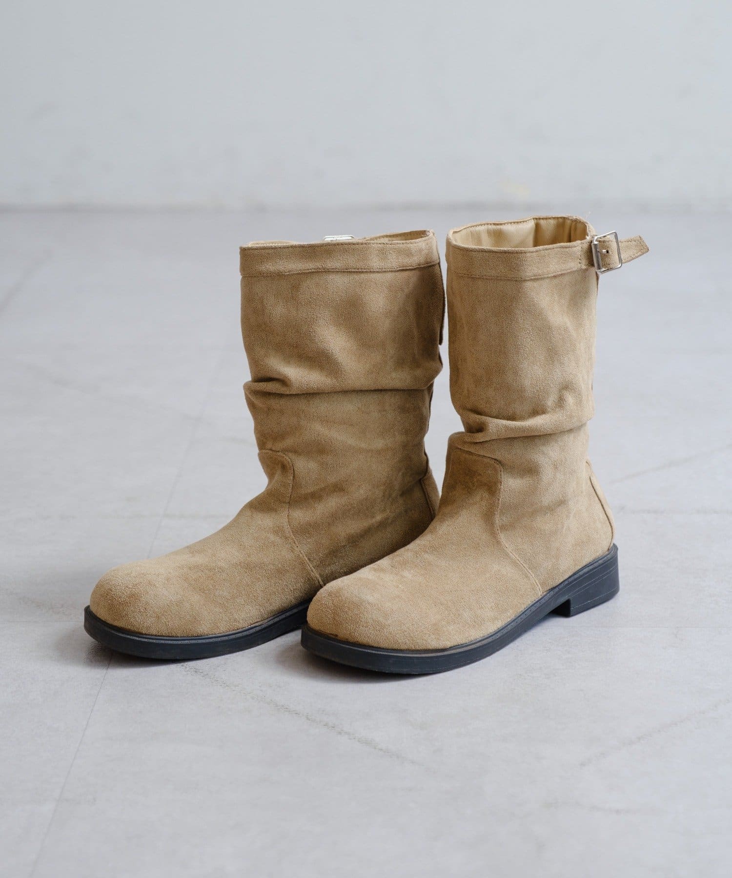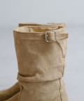 柔らかなスウェード調素材と、大人っぽいレザー調素材で仕上げたルーズエンジニアブーツ。