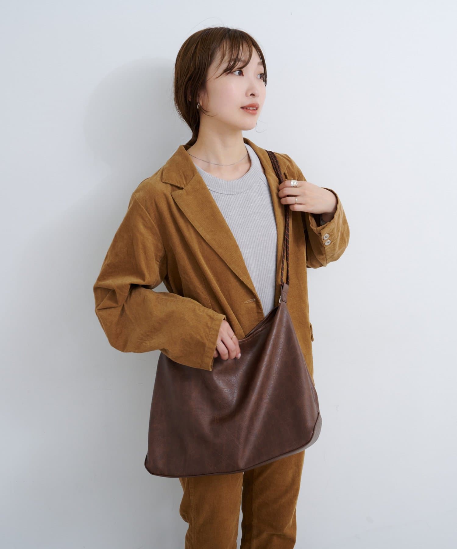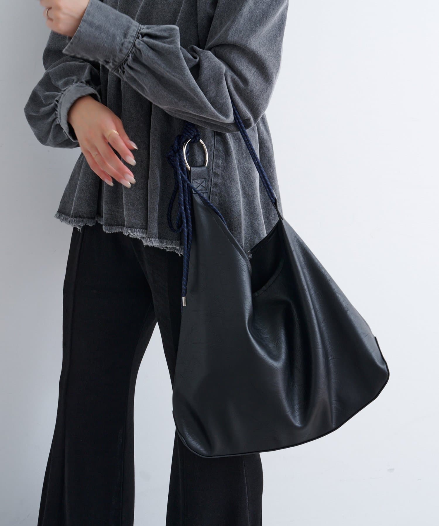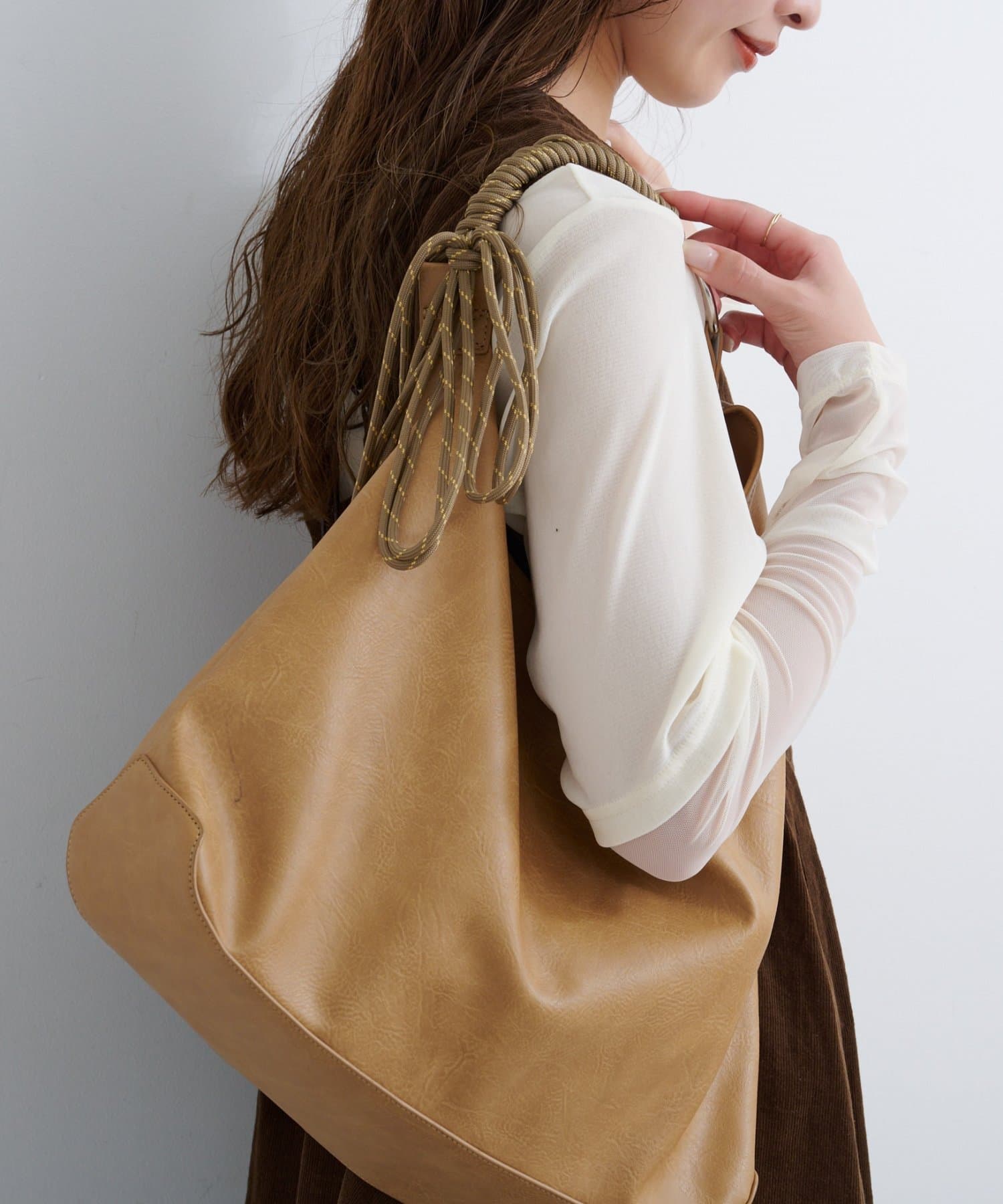 丸みを帯びたシルエットが柔らかさを演出し、肩掛けしやすいロープ風の持ち手がスタイリングにこなれ感をプラス。