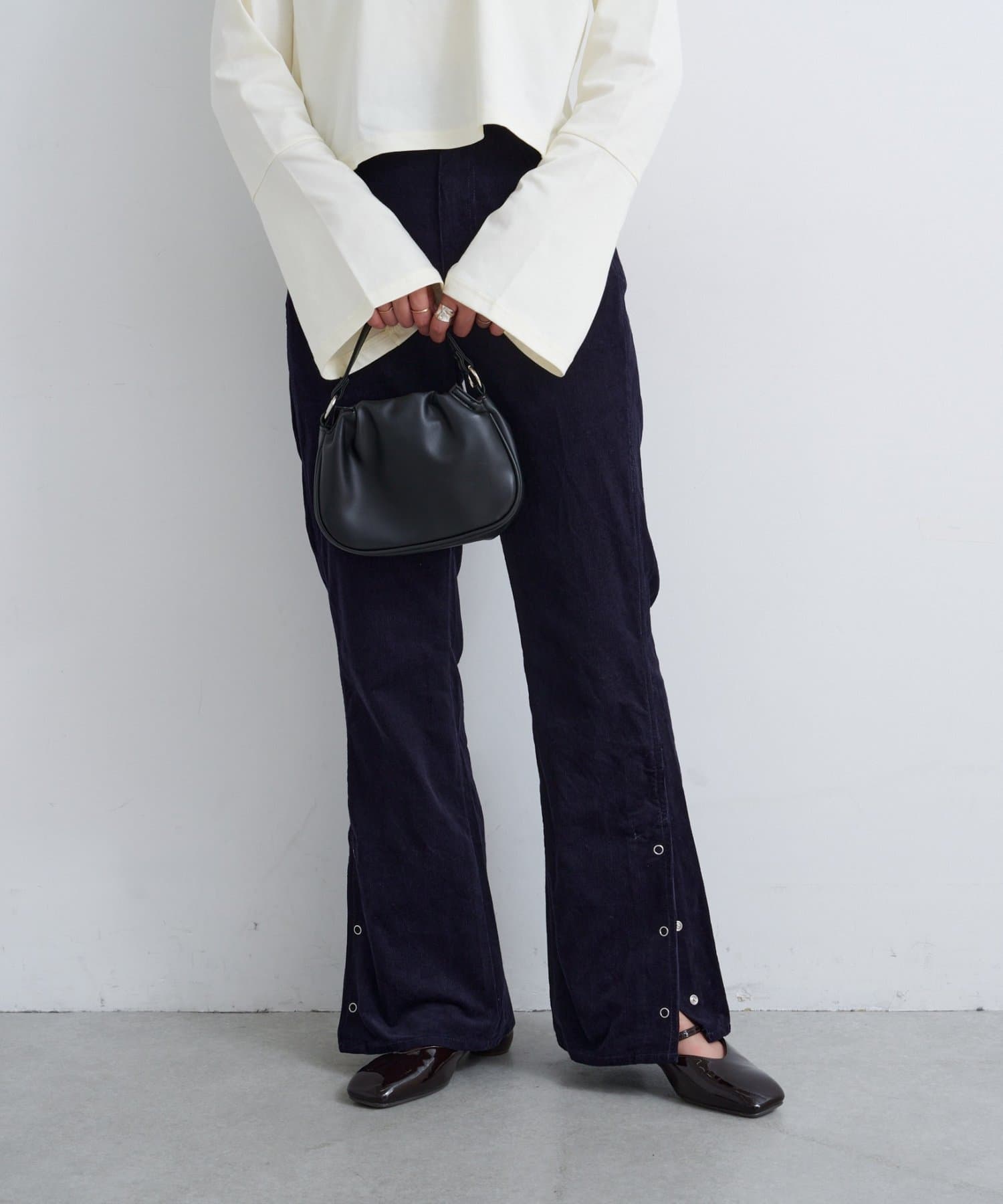 裾のスリット×スナップボタンデザインがアクセントになり、足元の抜け感と程よいモード感を演出。