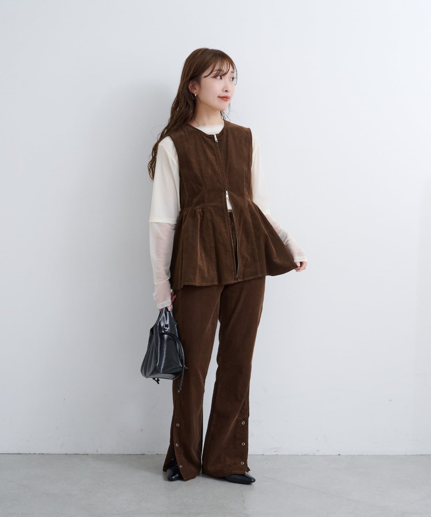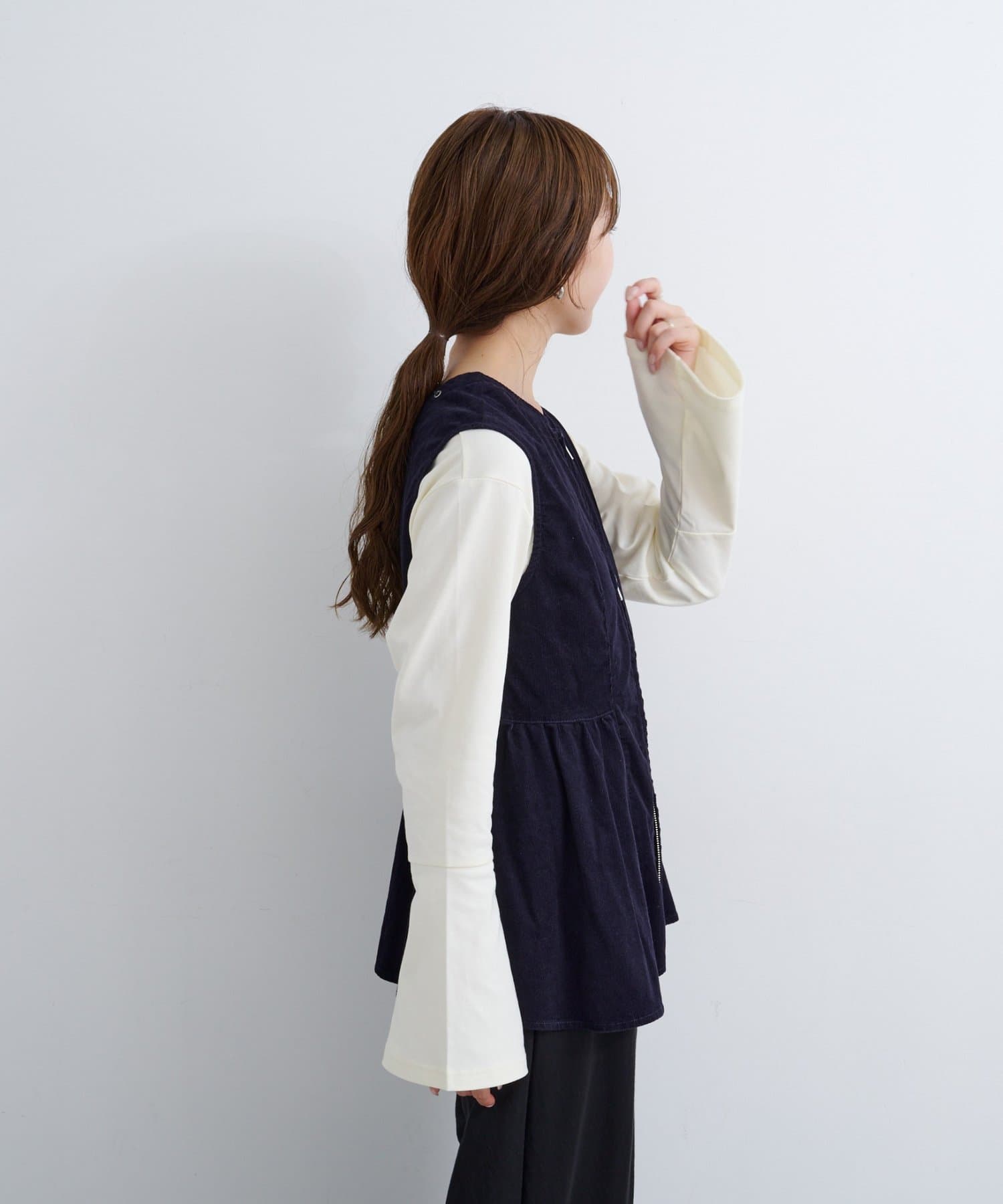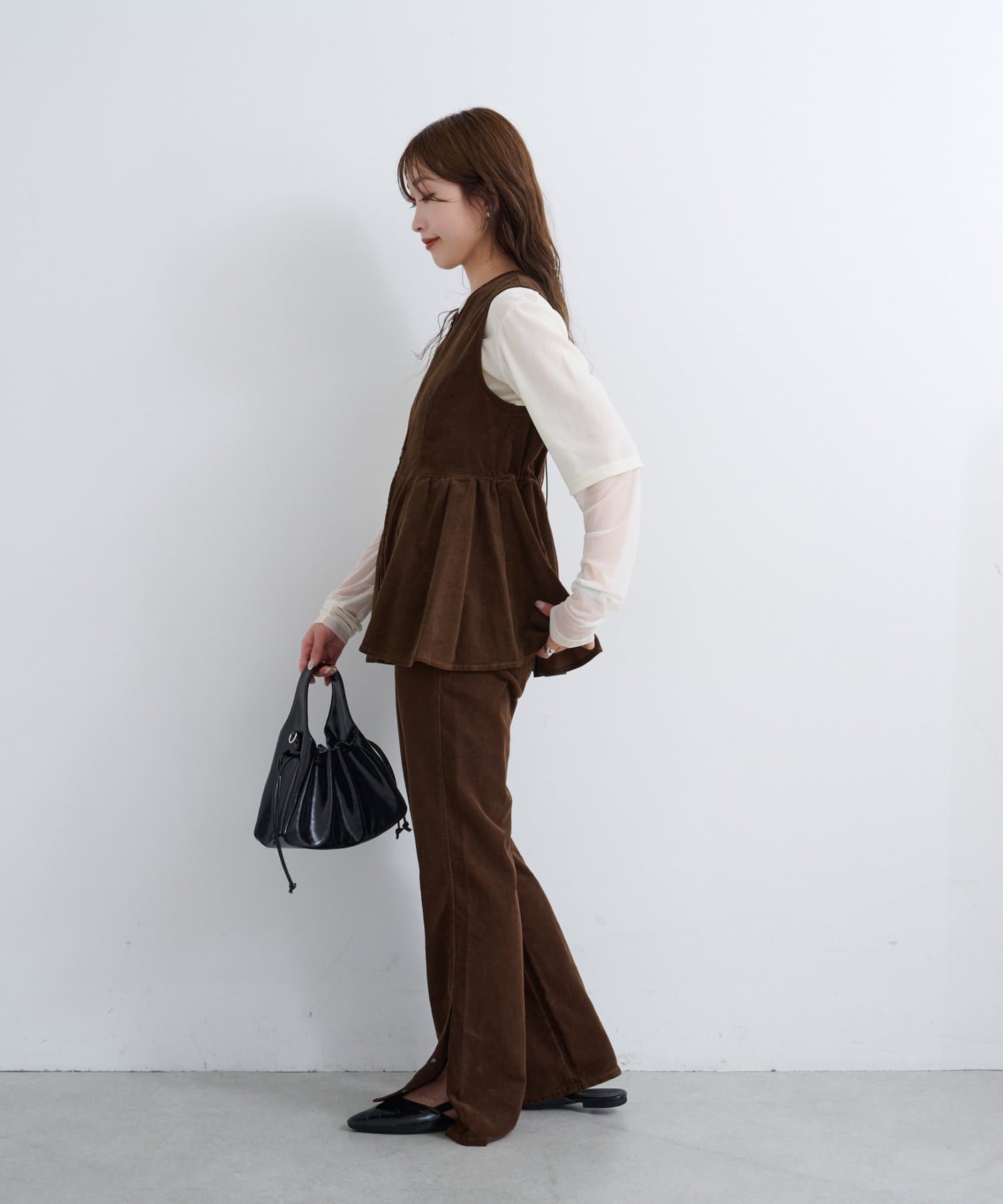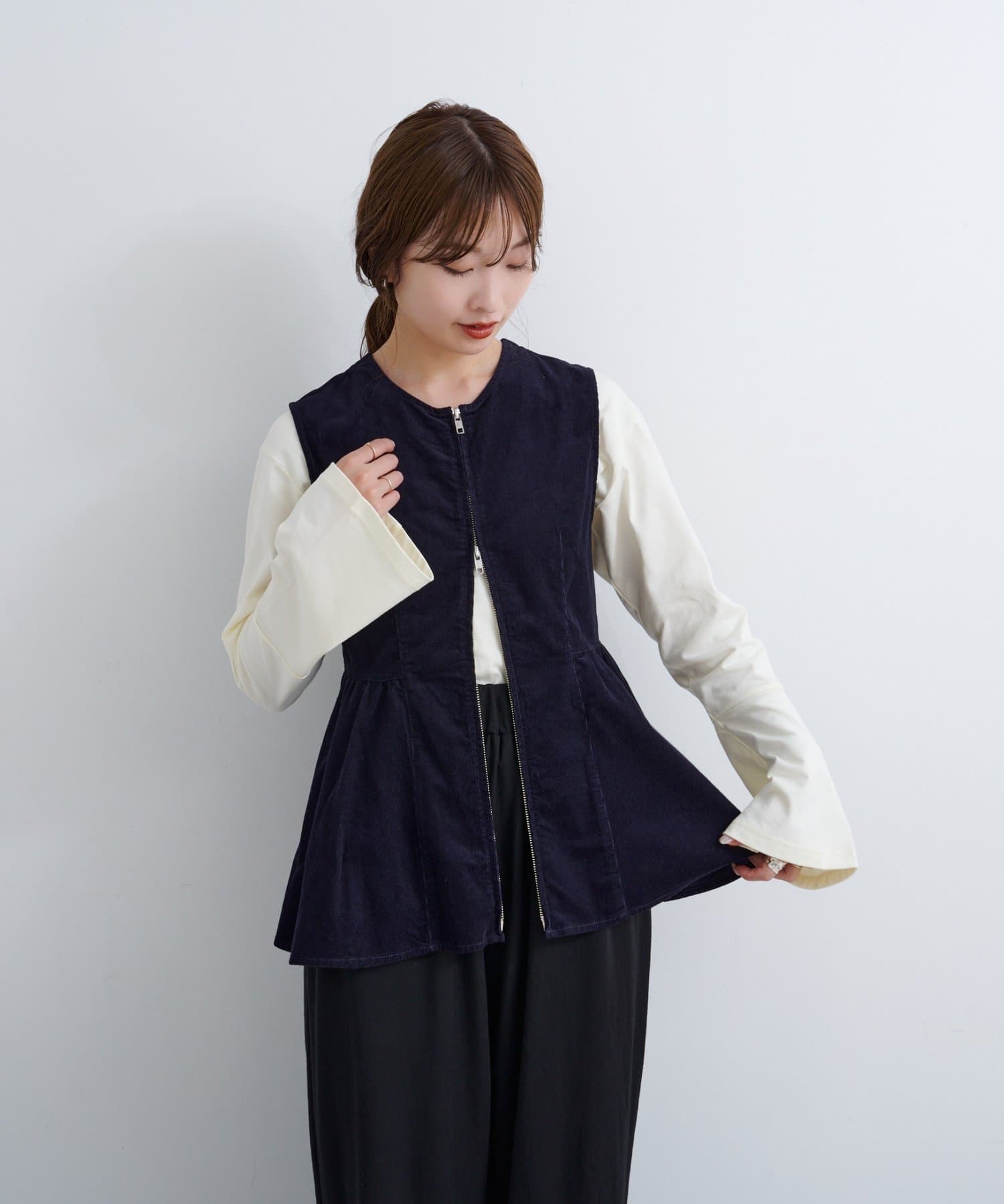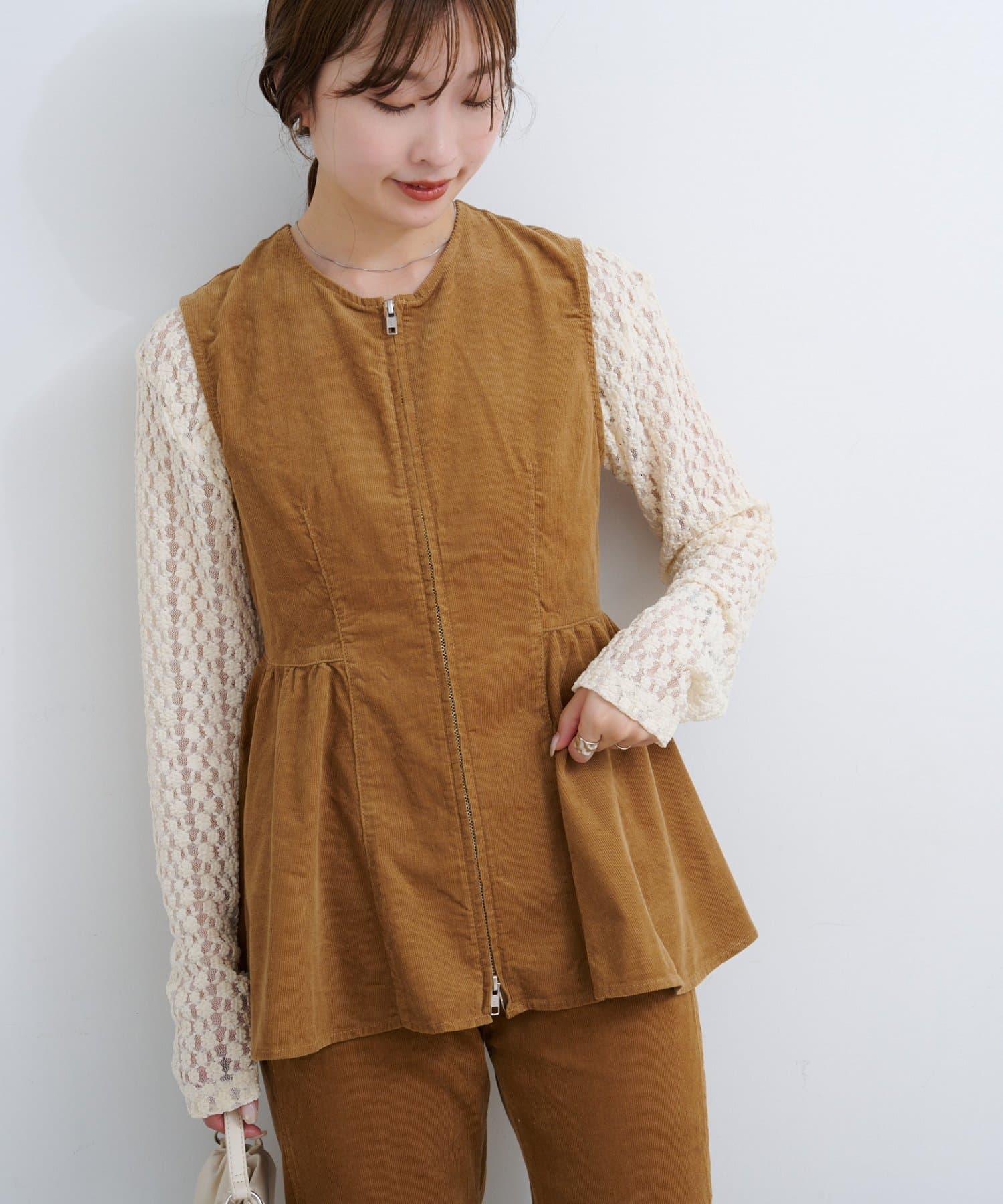 前後で魅せる、大人可愛い万能コーデュロイビスチェ