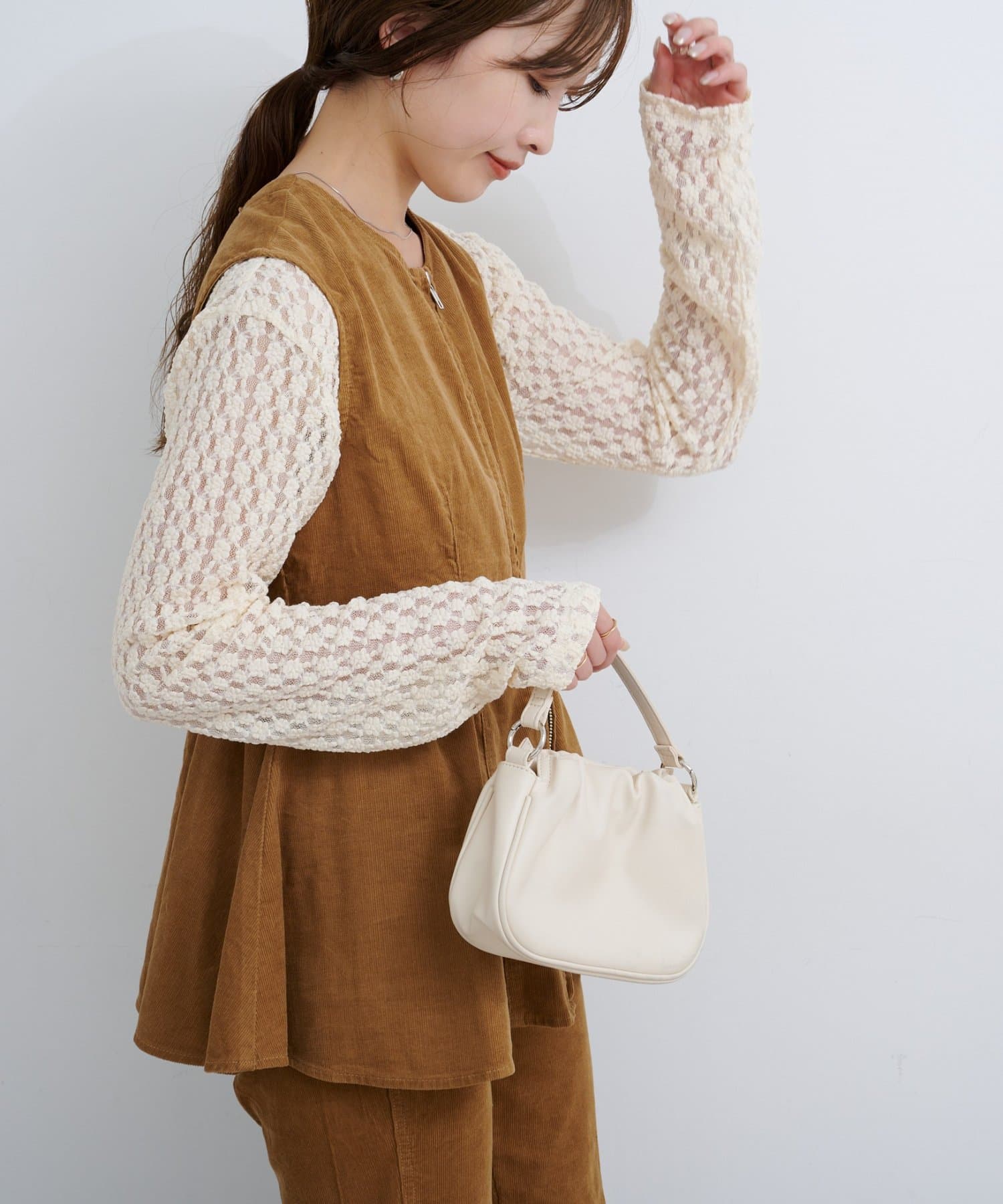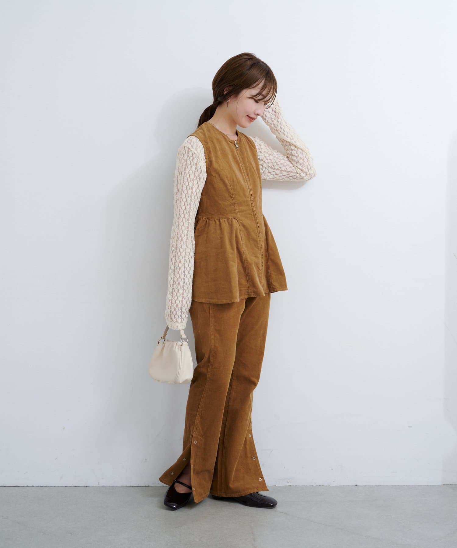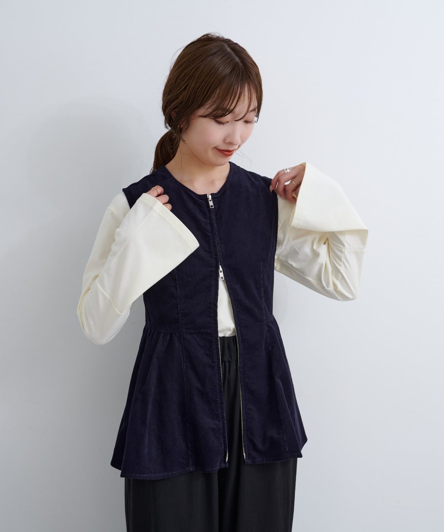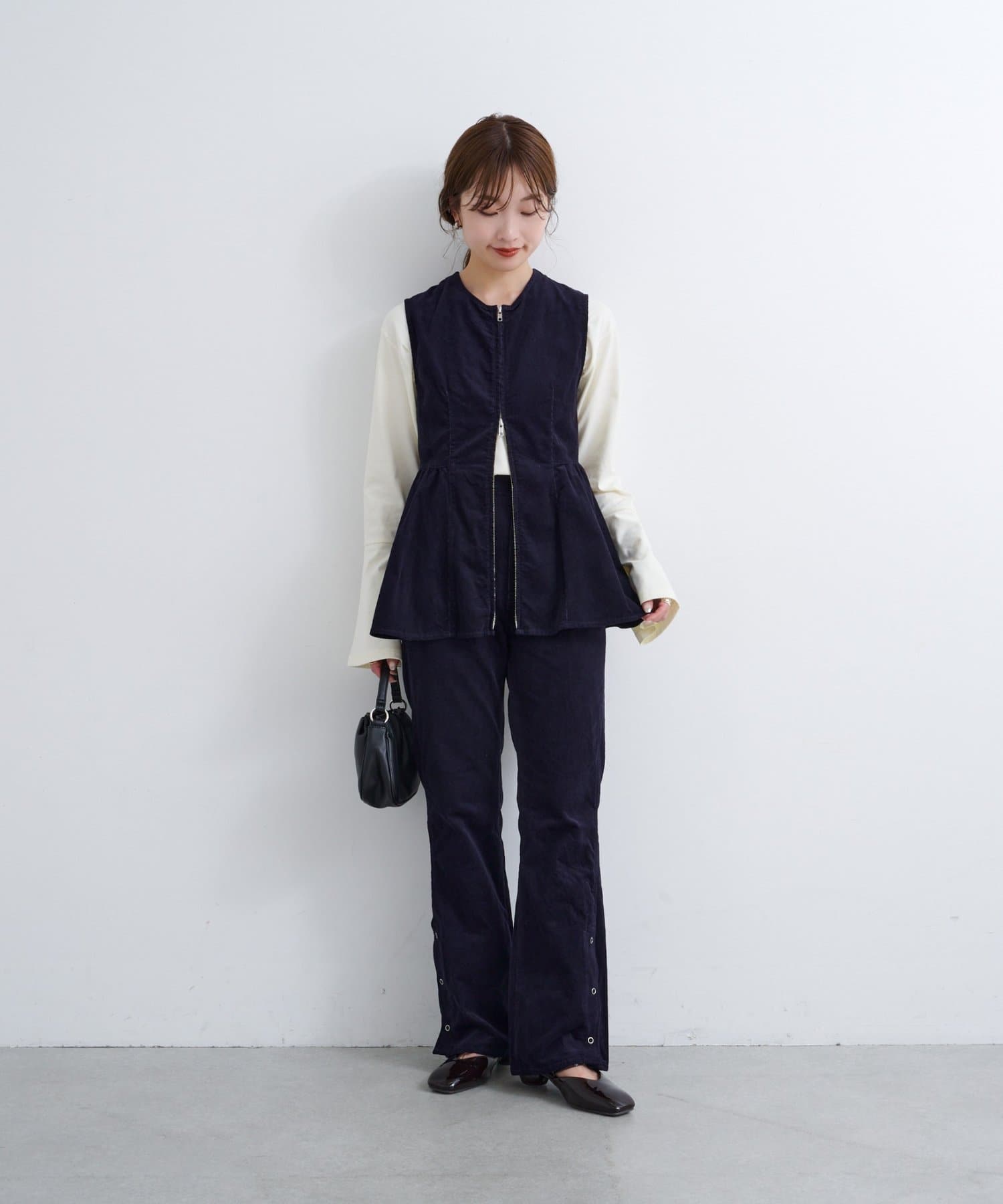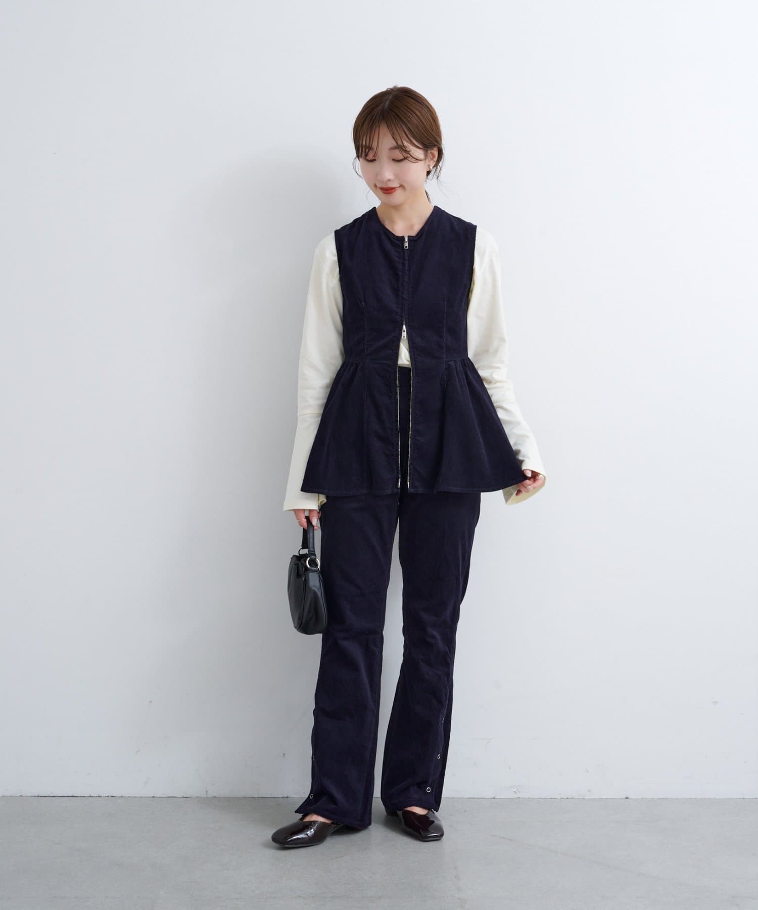 前後で魅せる、大人可愛い万能コーデュロイビスチェ