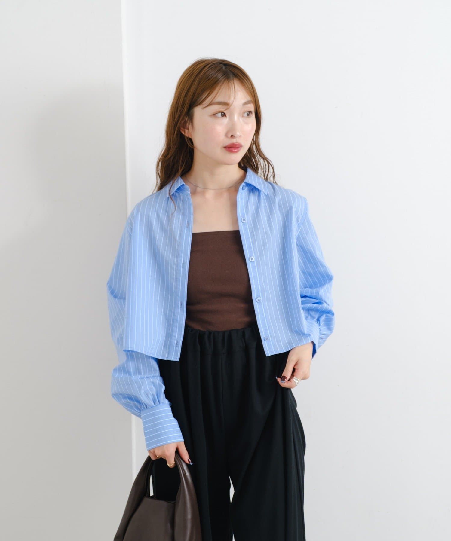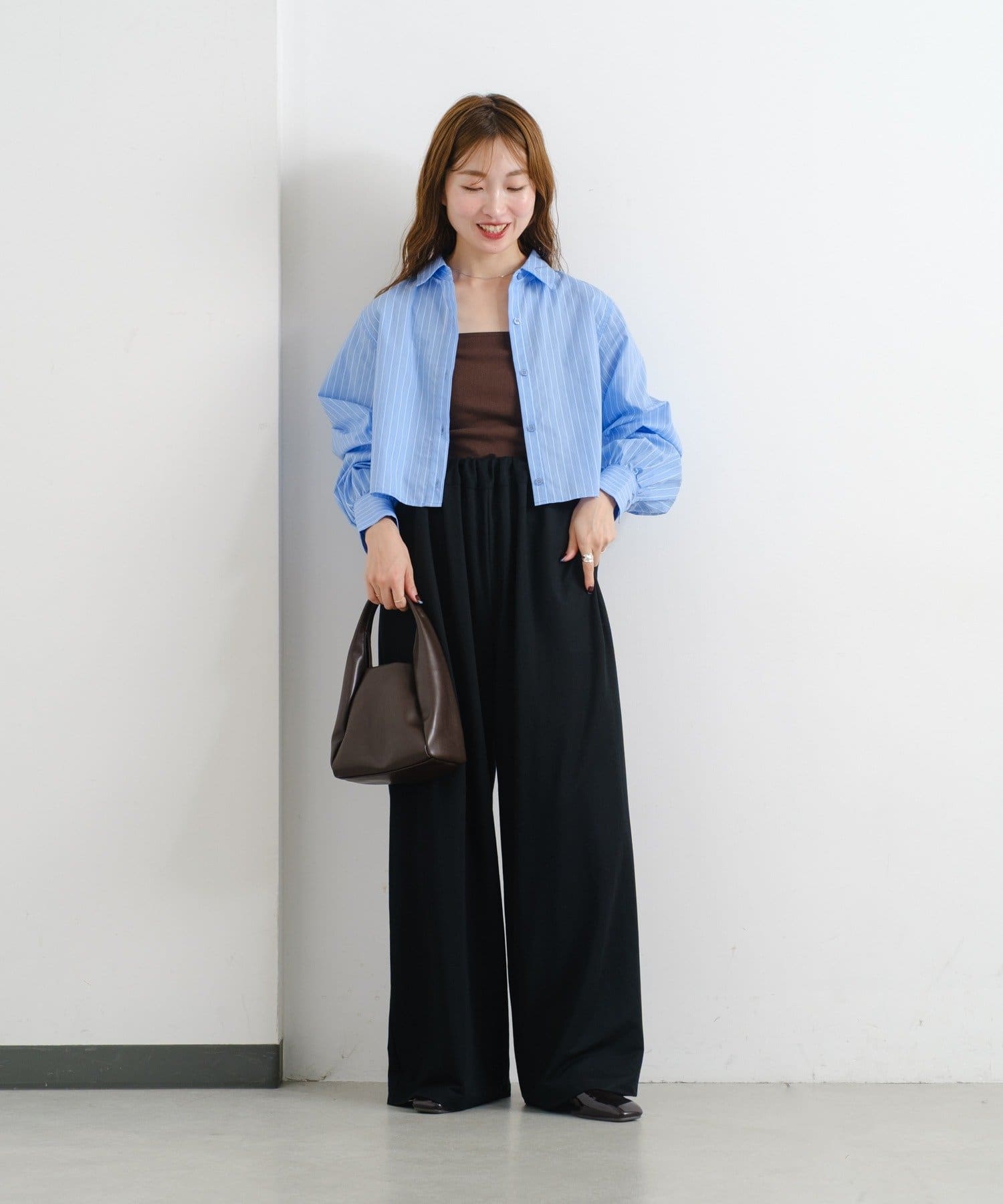 ショート丈は、ハイウエストパンツやスカートに合わせてスタイルアップ。