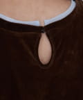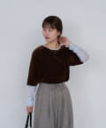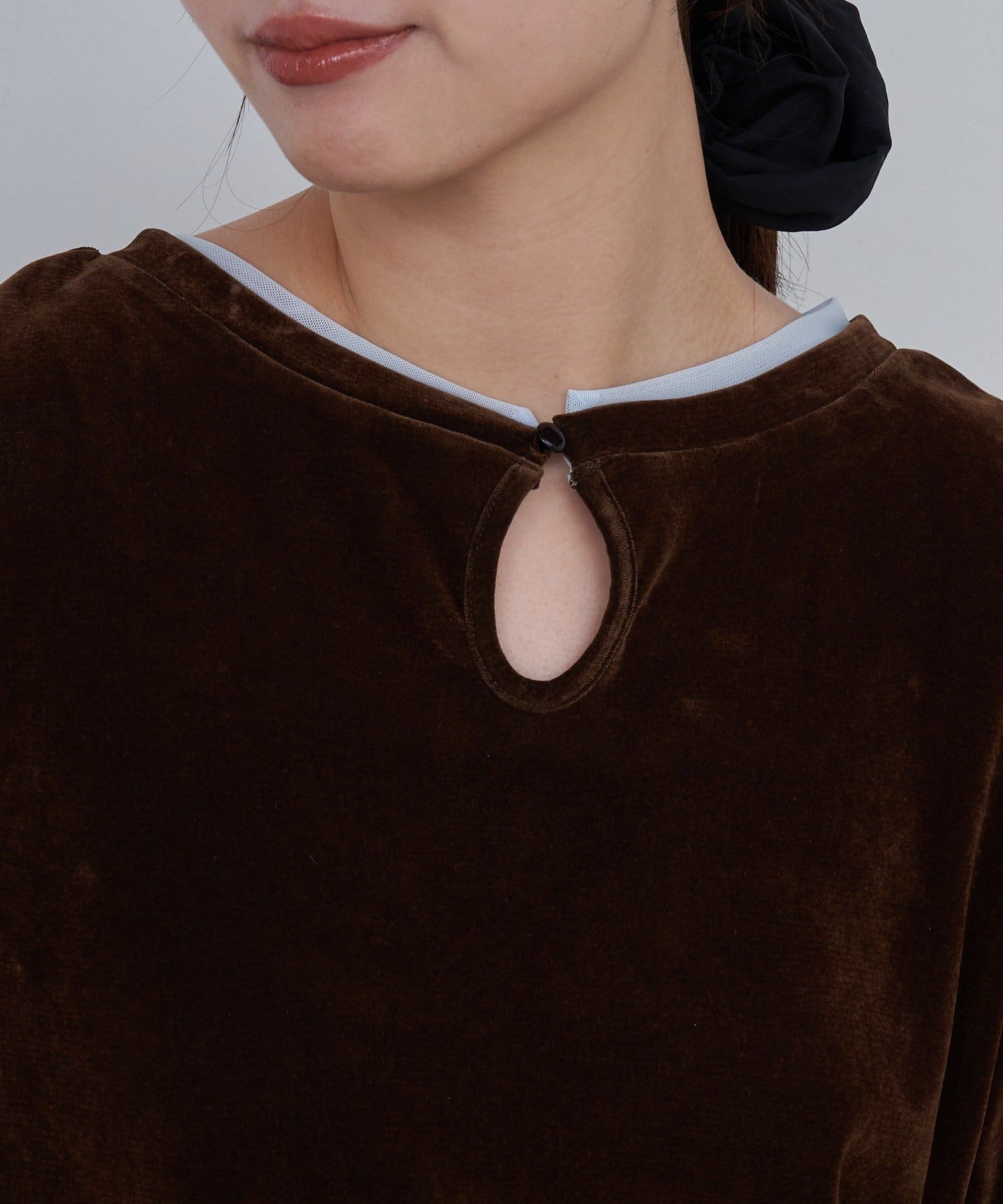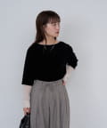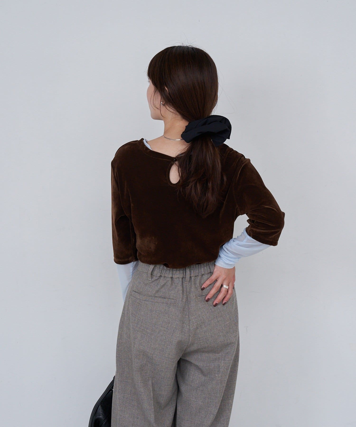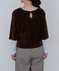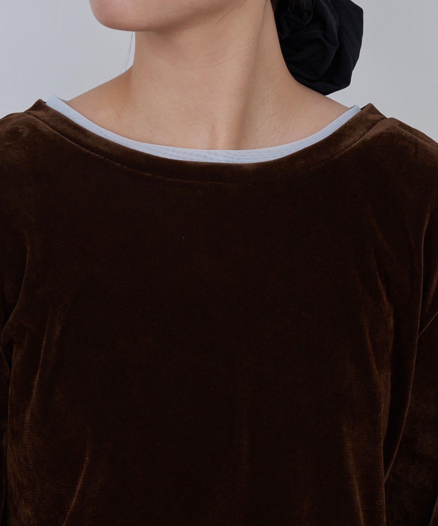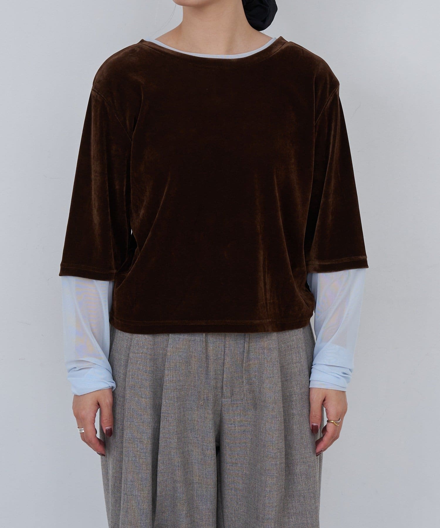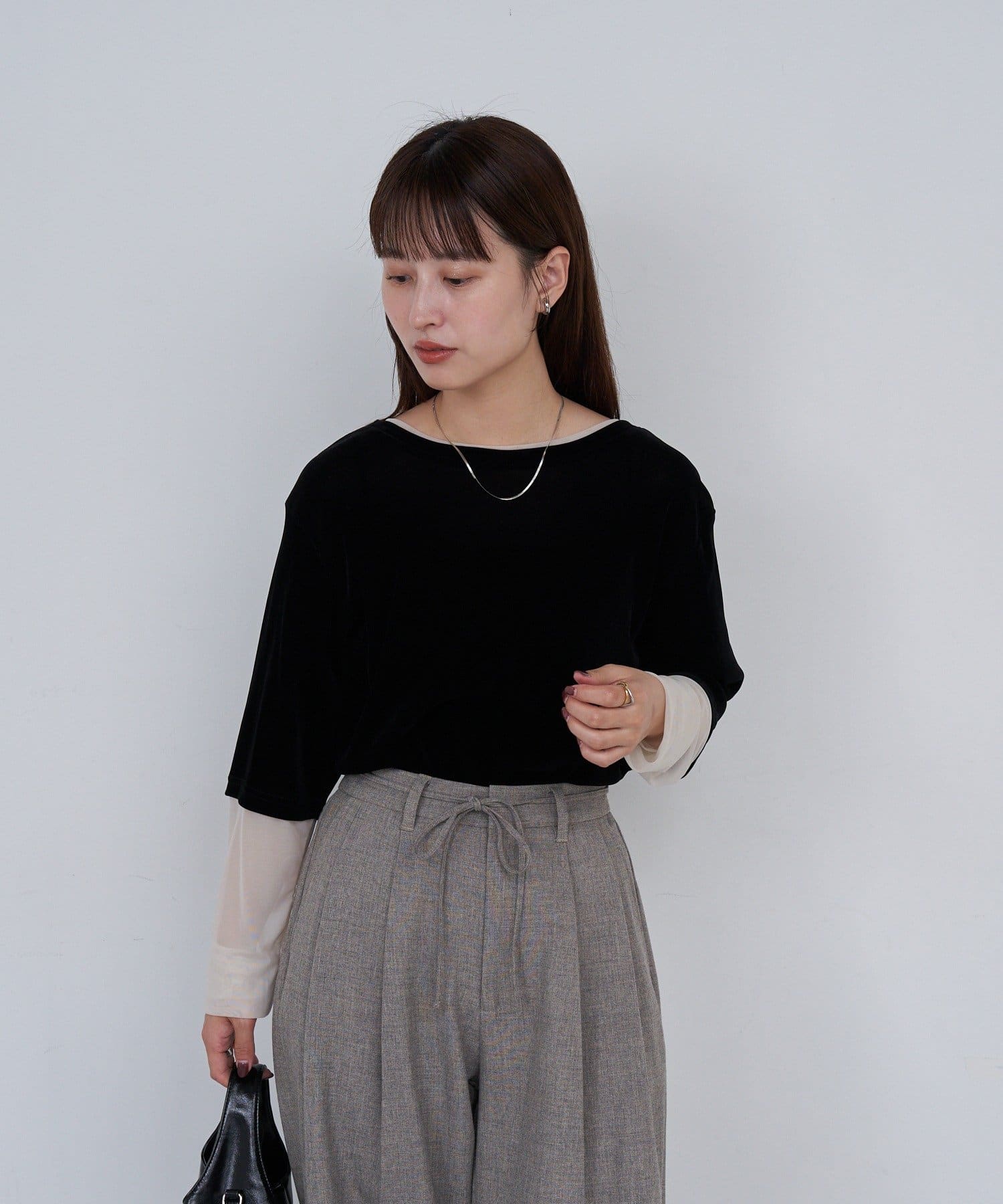 まるでレイヤードしているかのようなデザインが目を引く、ベロア素材のトップス。
