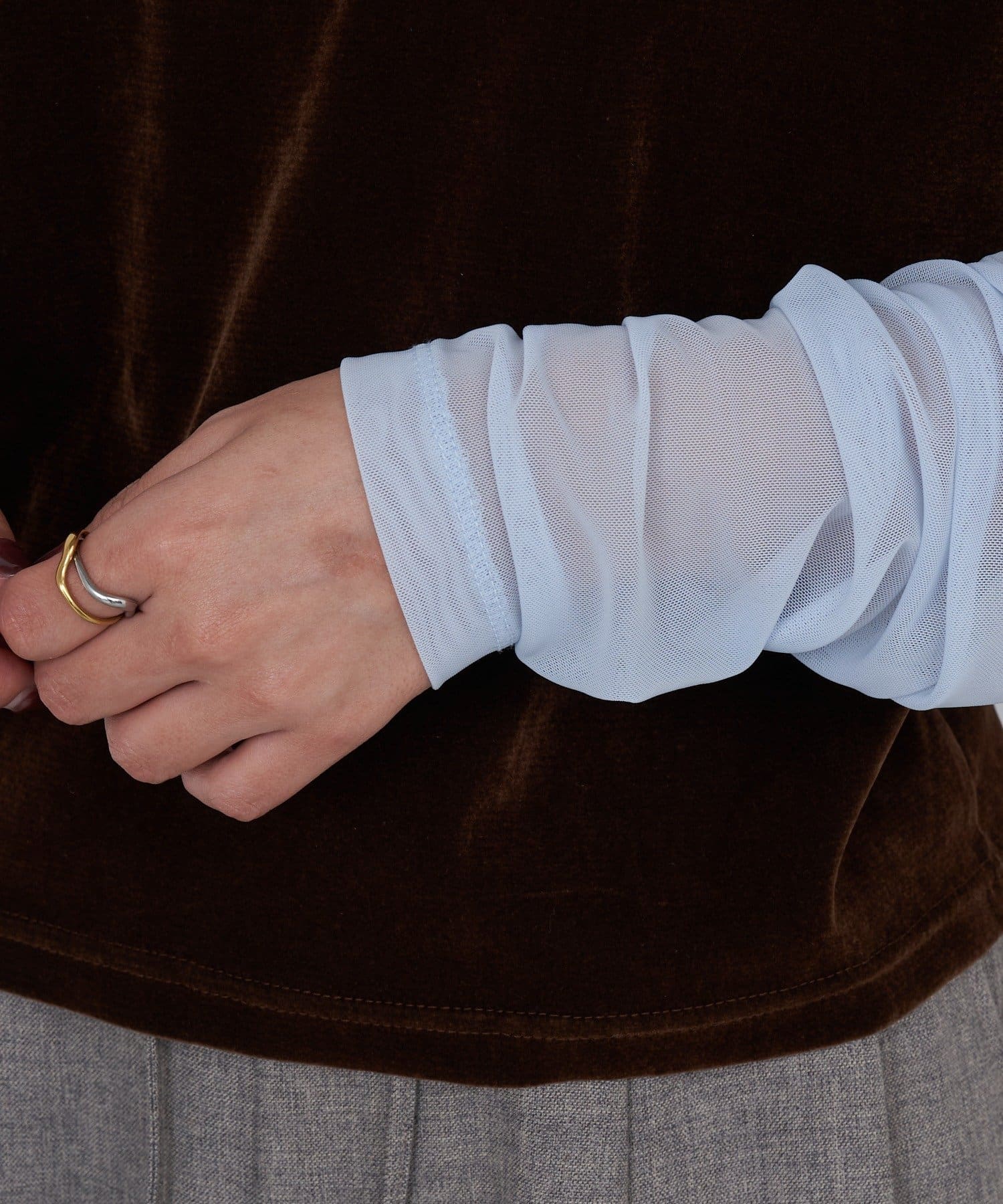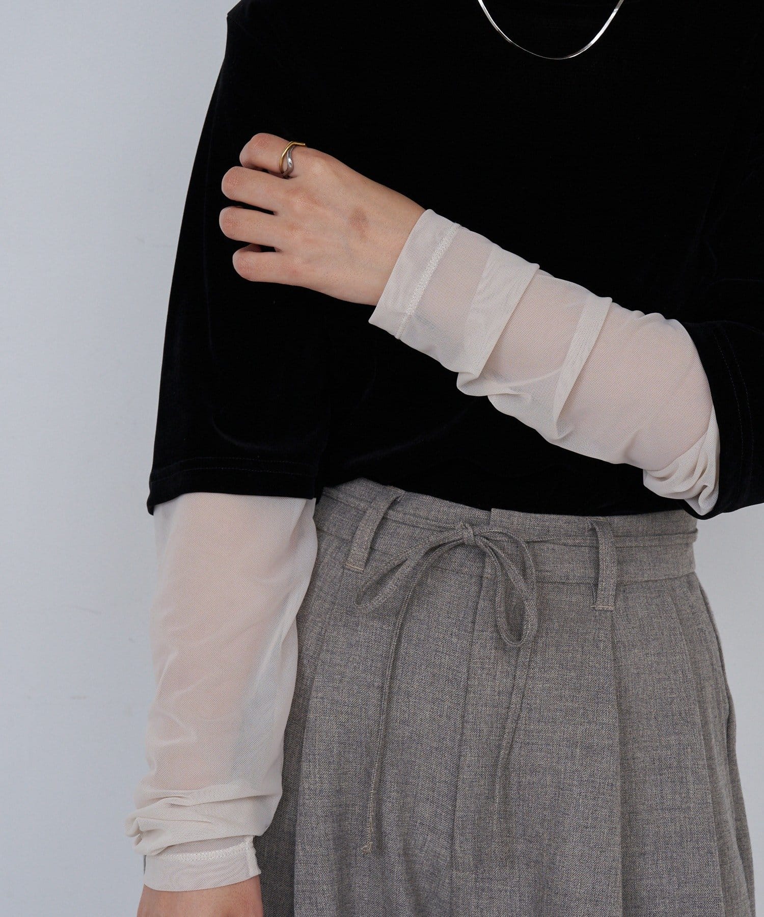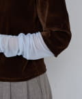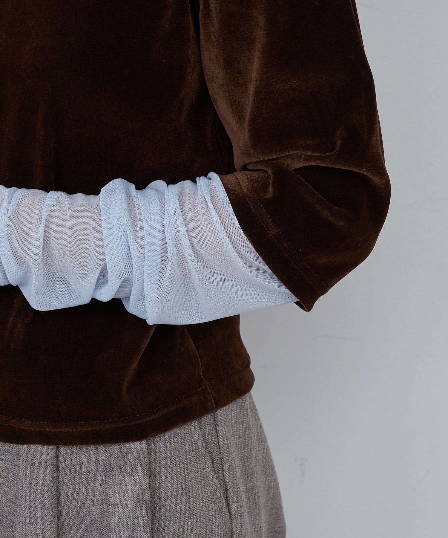 光沢のあるなめらかなベロア素材をベースに、袖と首元には透け感のあるシアー生地をドッキング。
