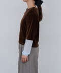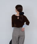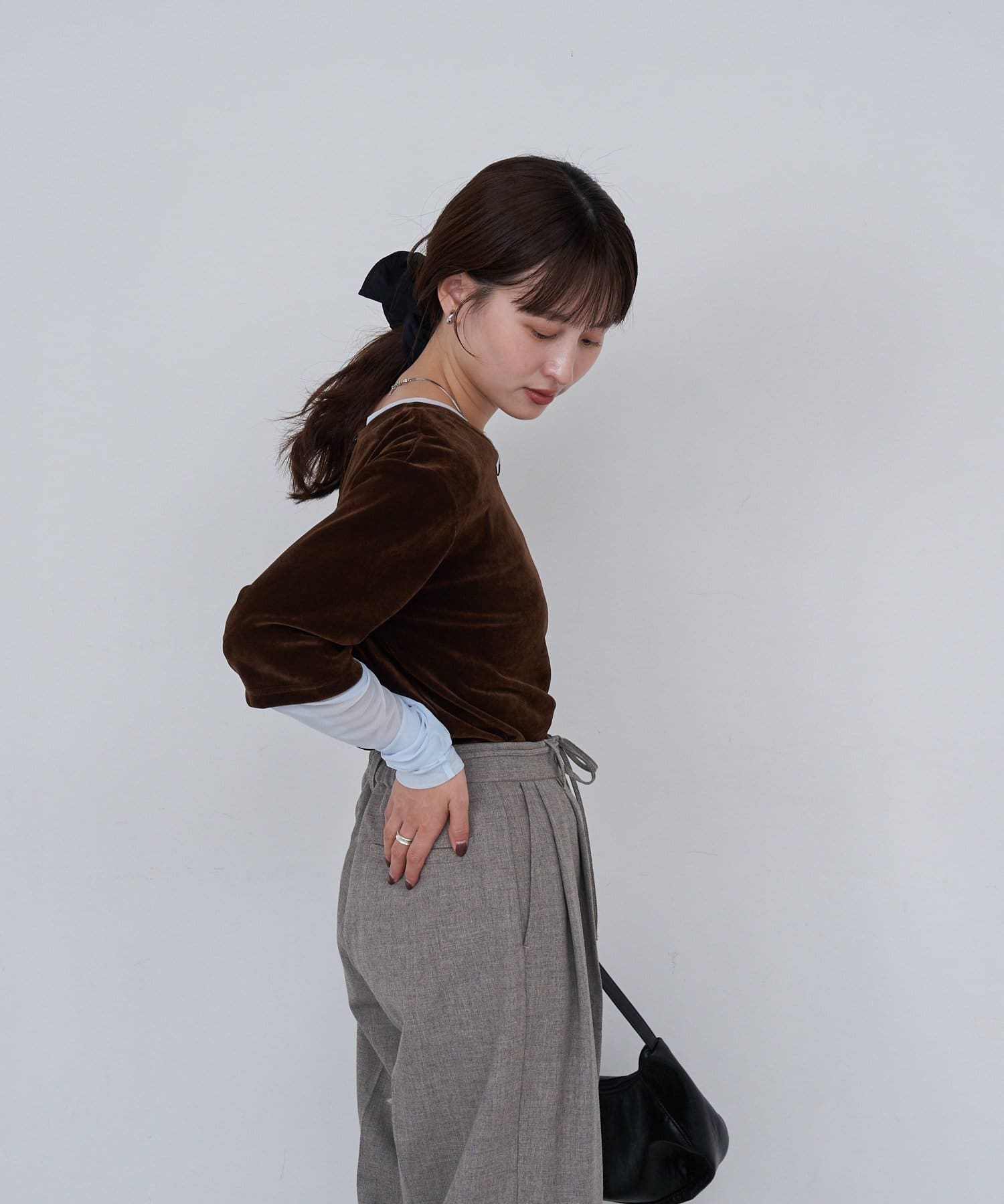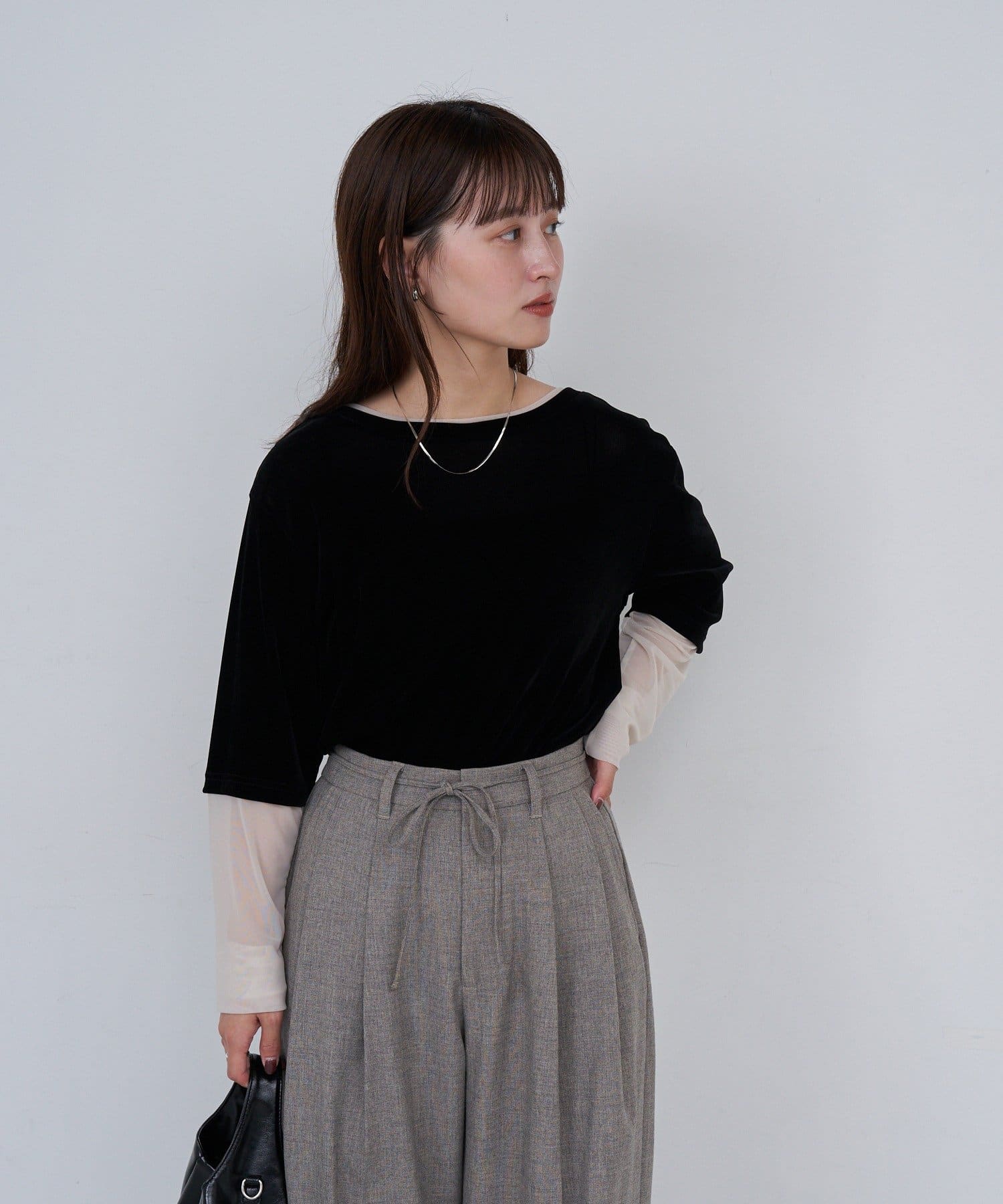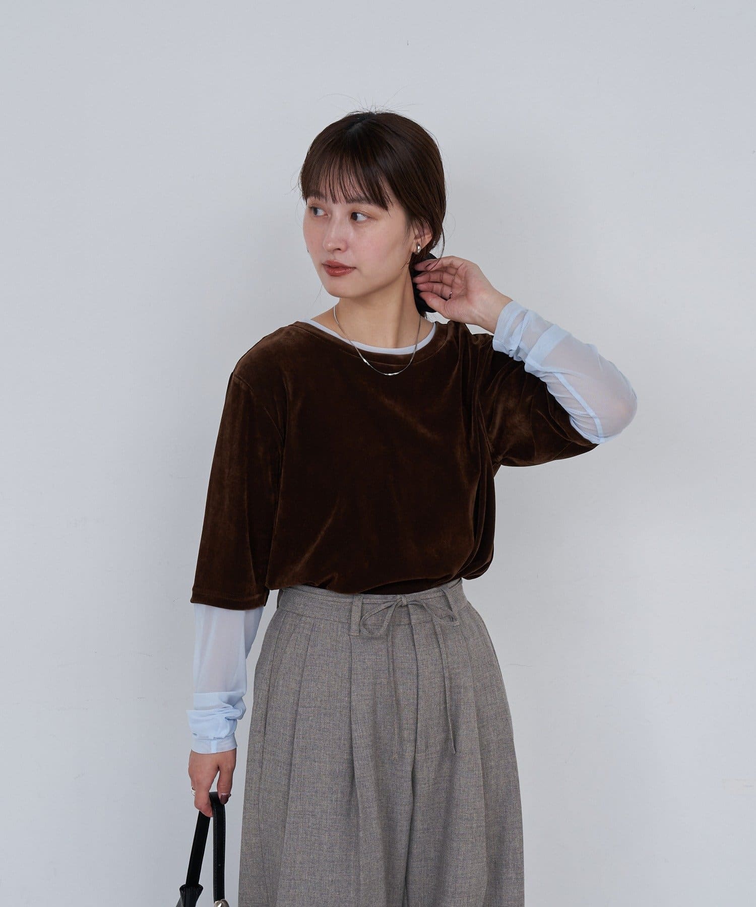 光沢のあるなめらかなベロア素材をベースに、袖と首元には透け感のあるシアー生地をドッキング。