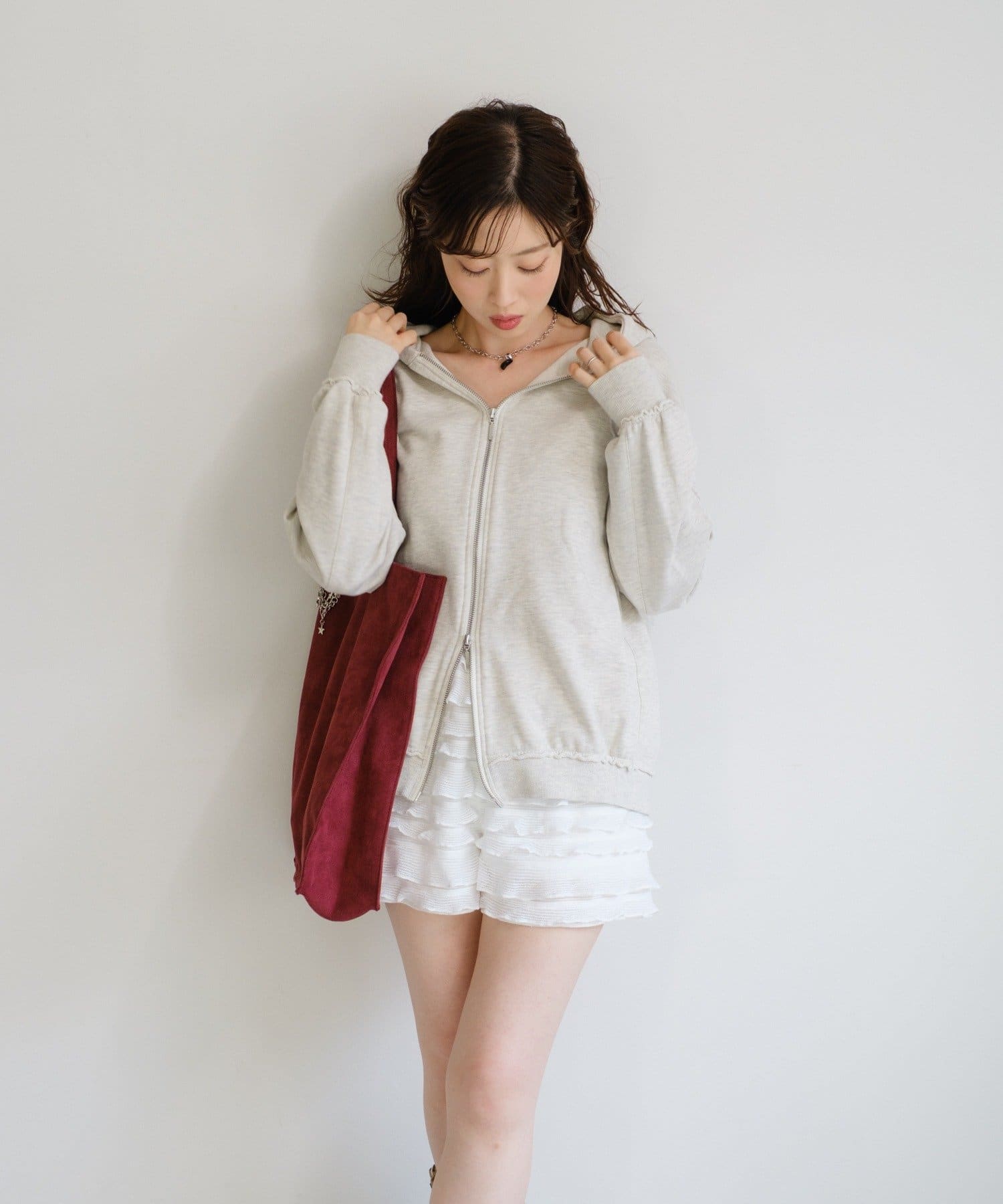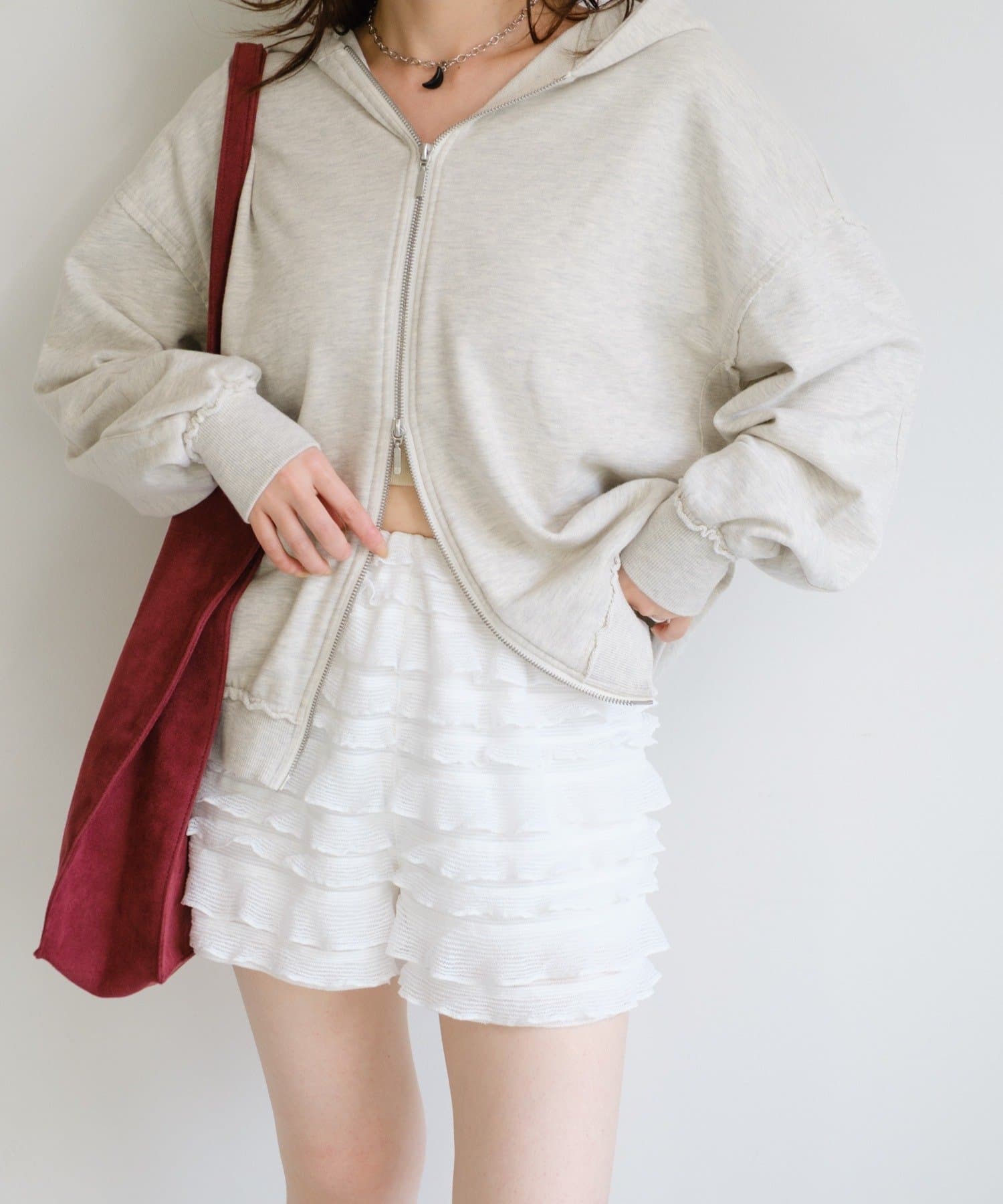 スウェットやパーカーと合わせて甘辛MIXスタイルに。