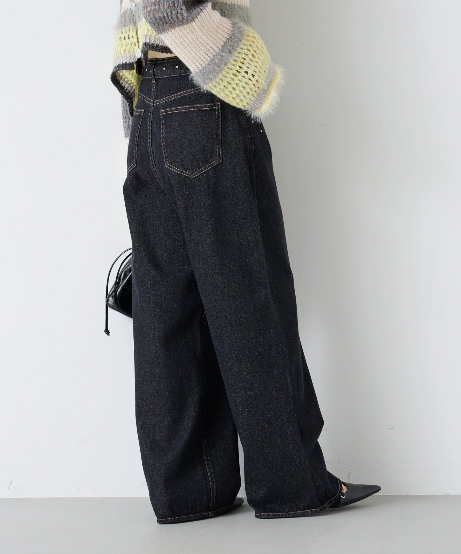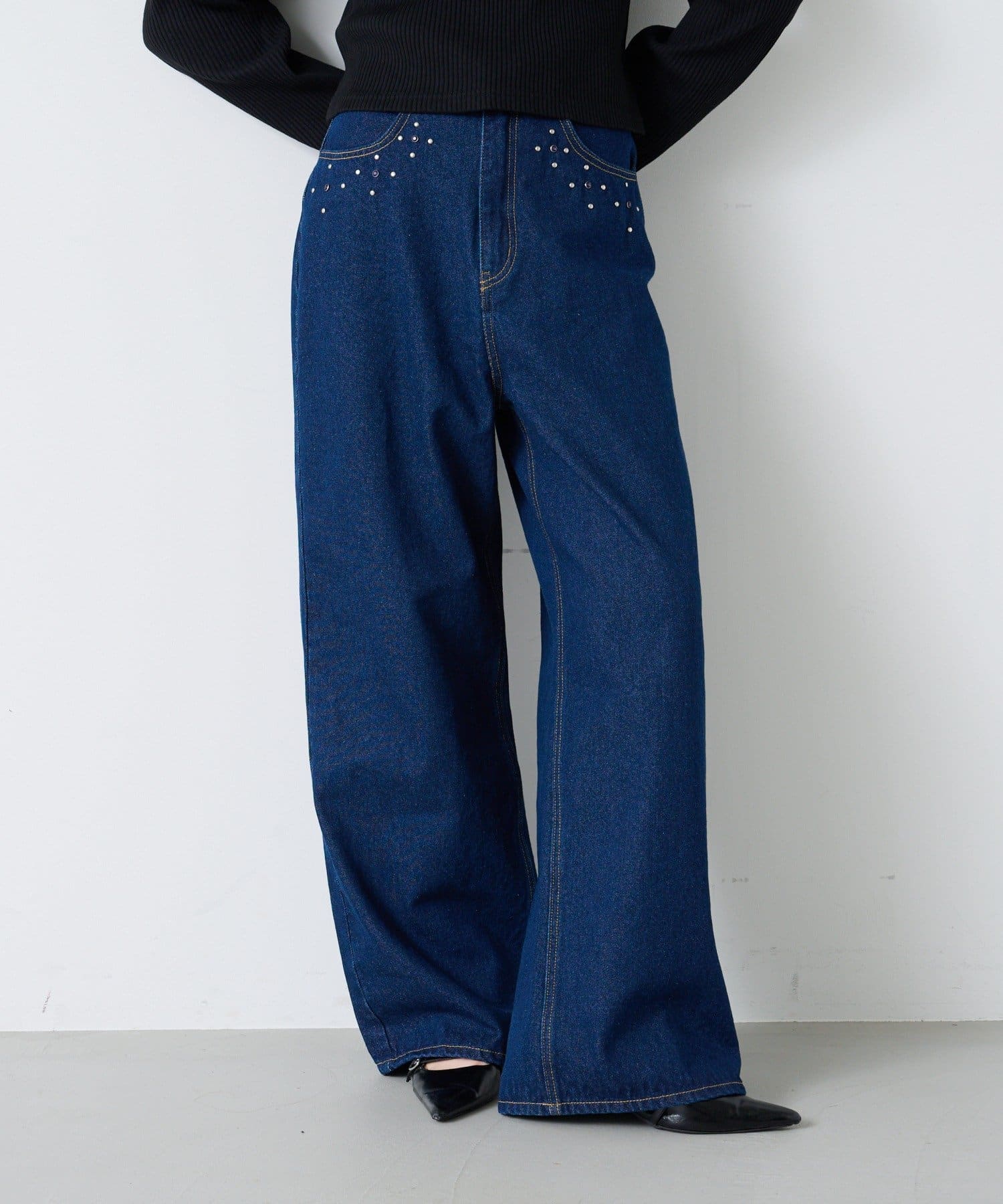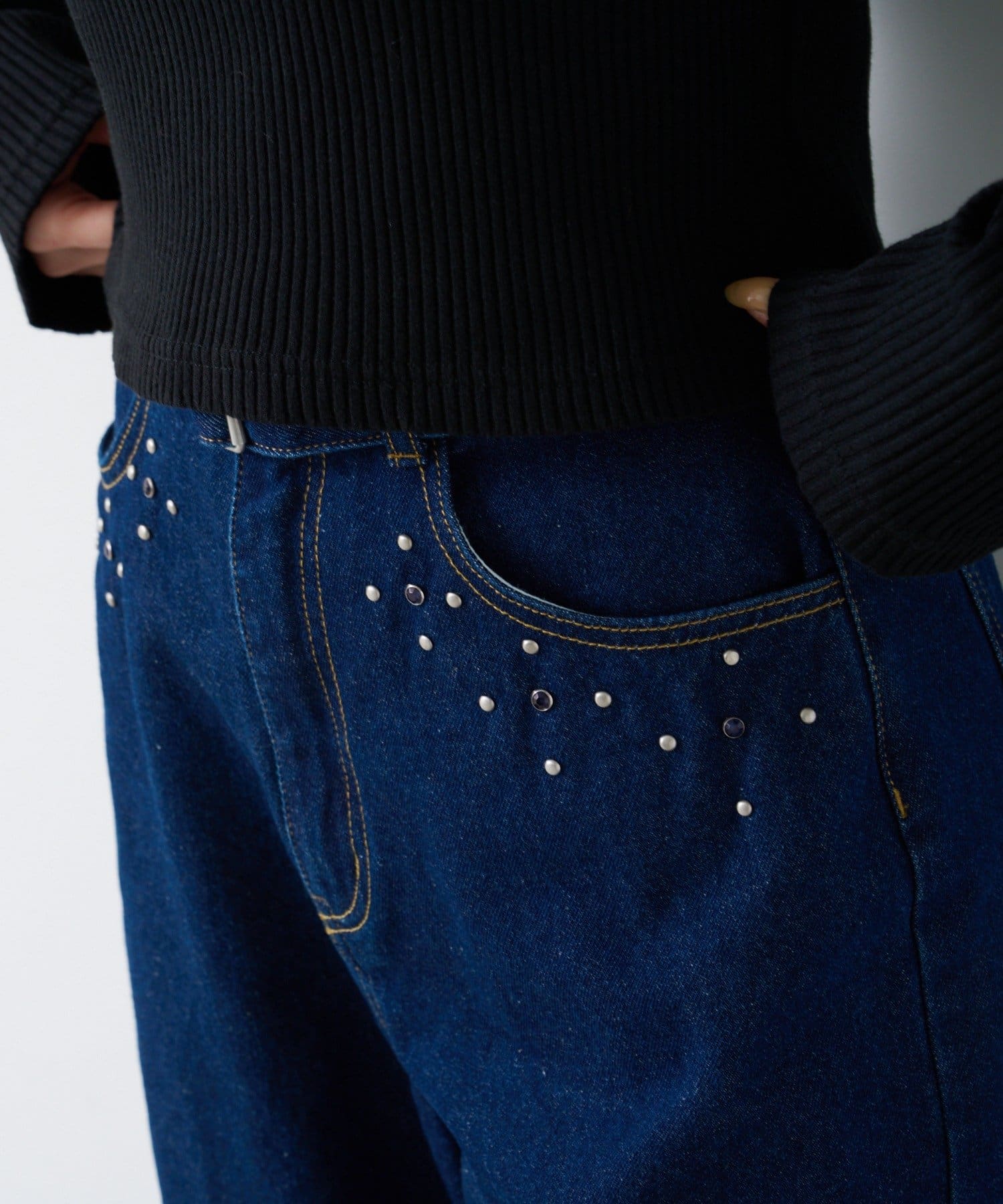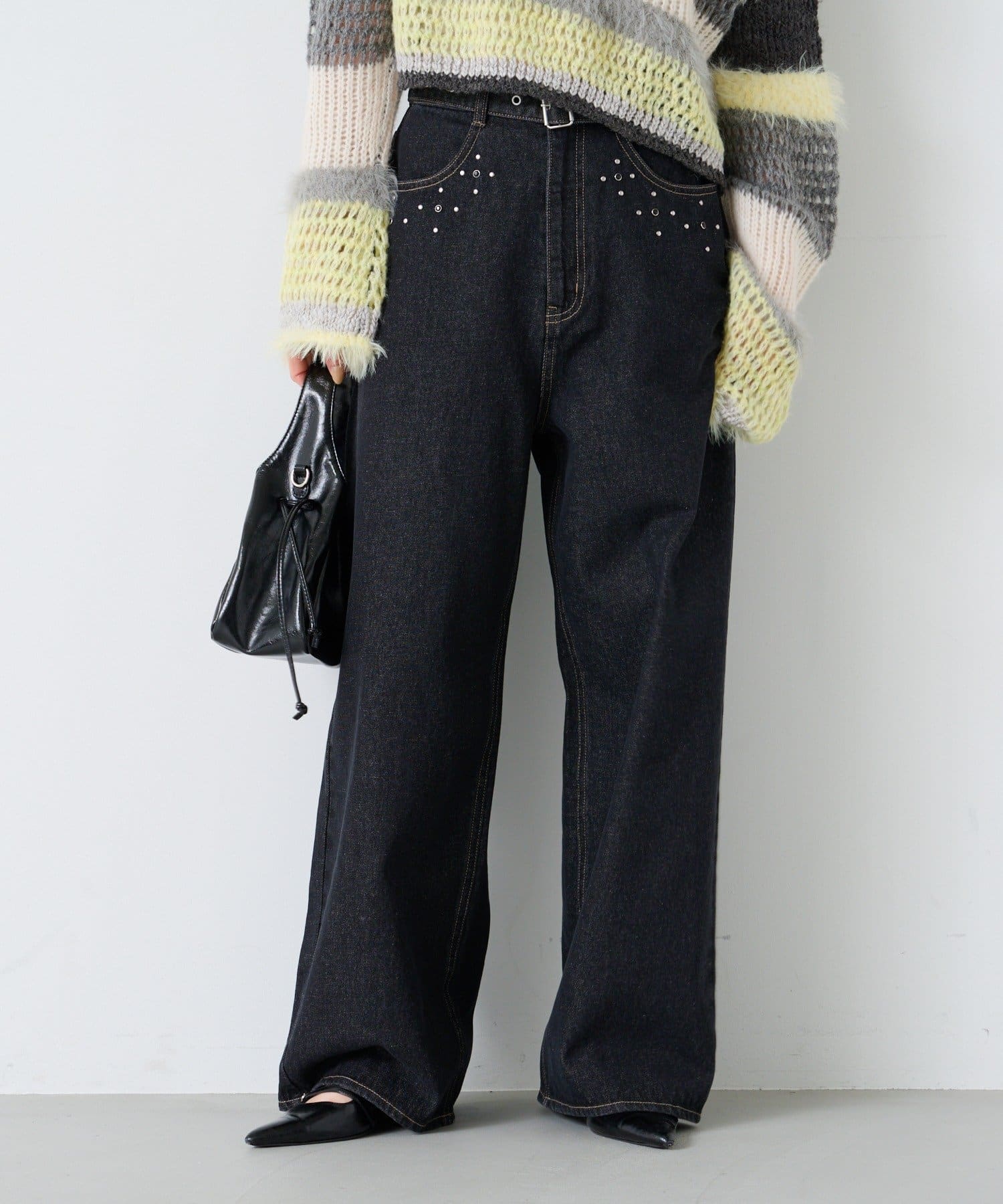 ウエスト周りにビジューをあしらったデニムパンツ。