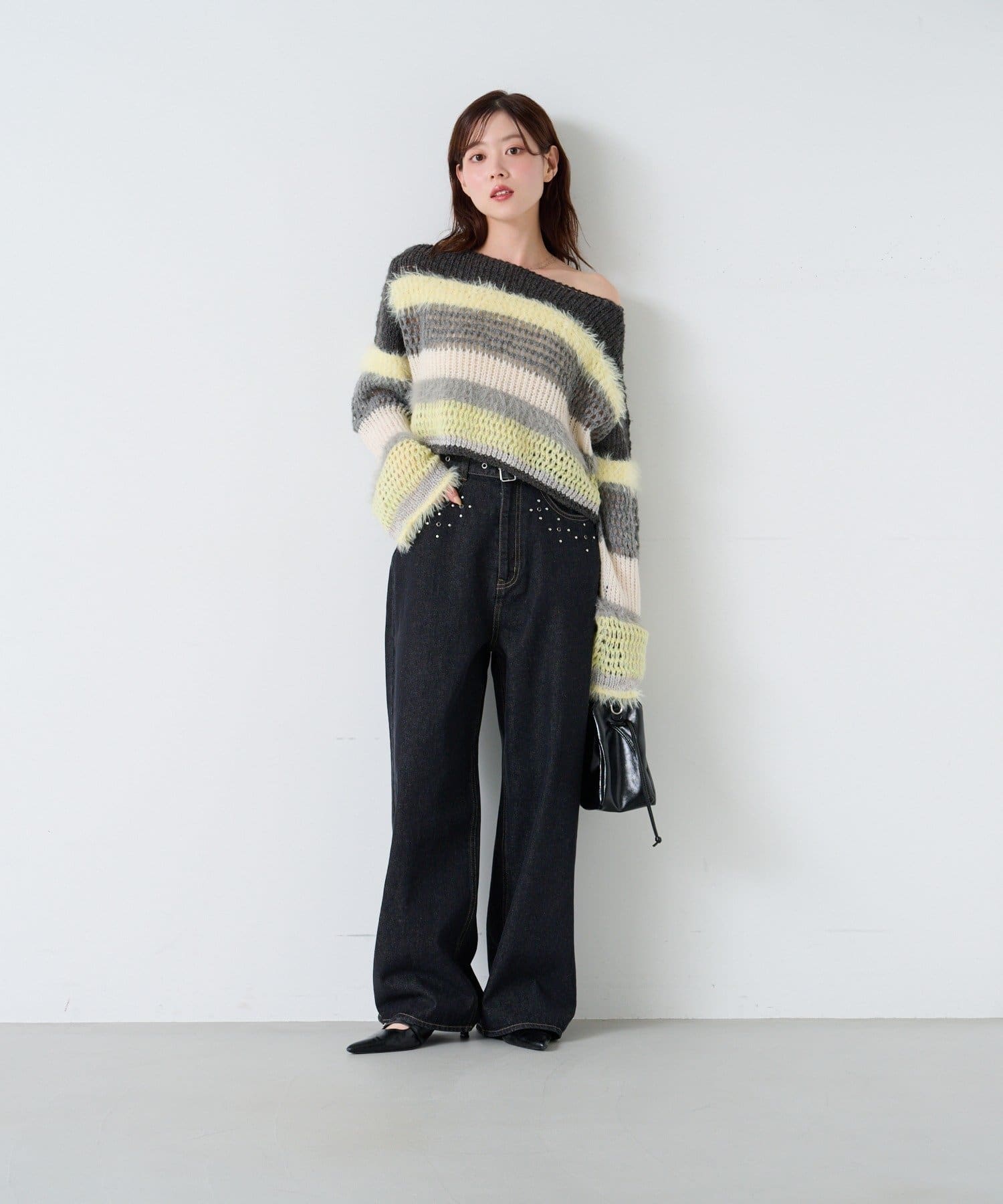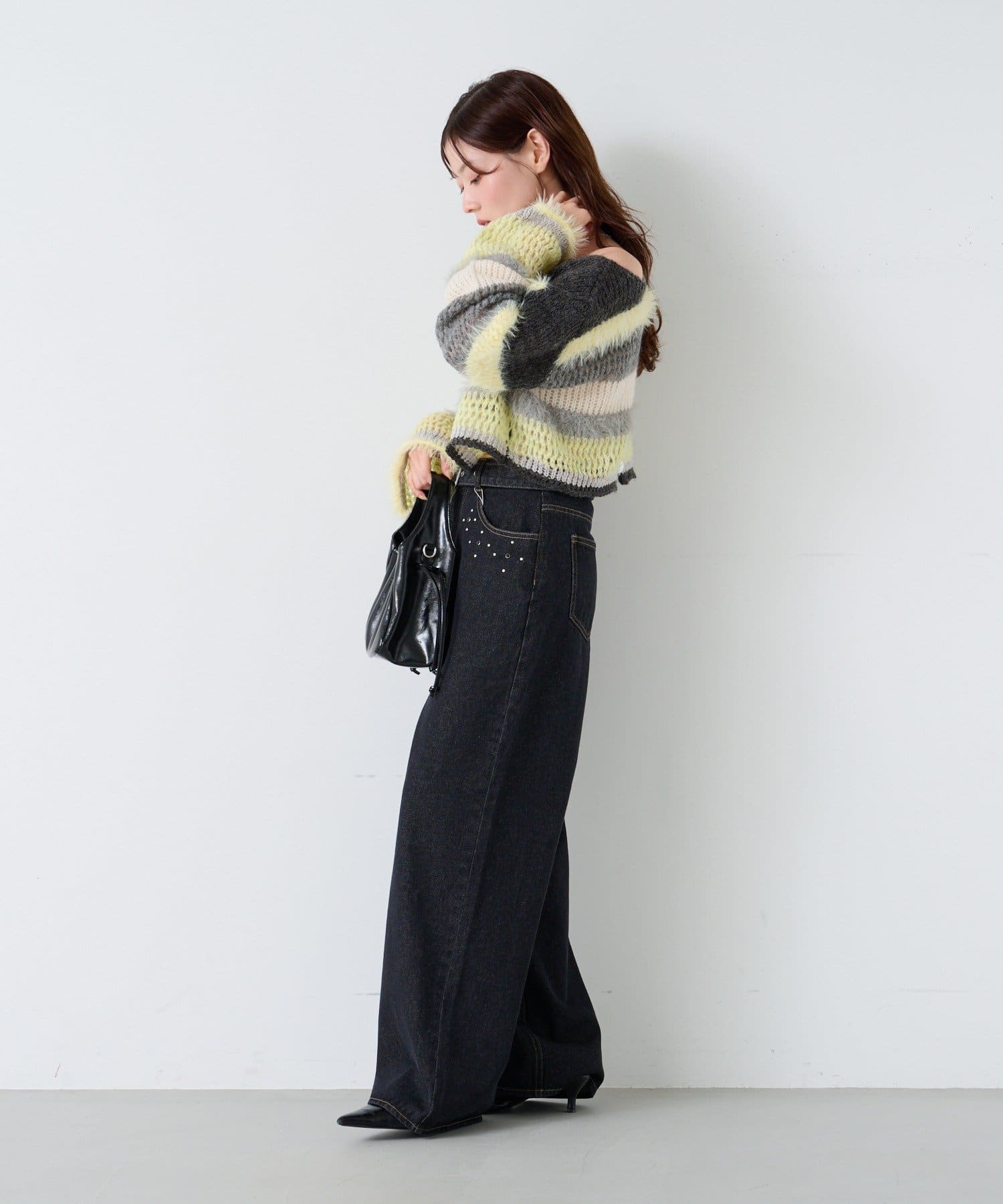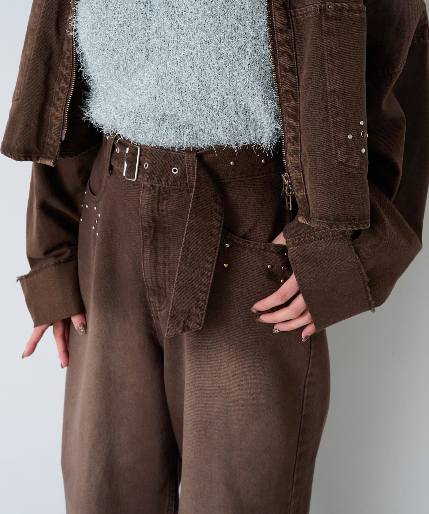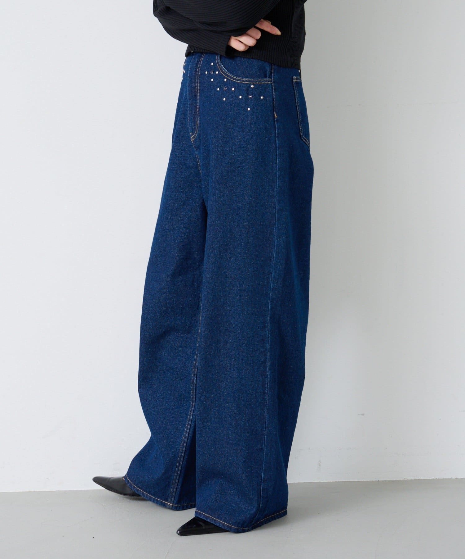 ウエスト周りにビジューをあしらったデニムパンツ。