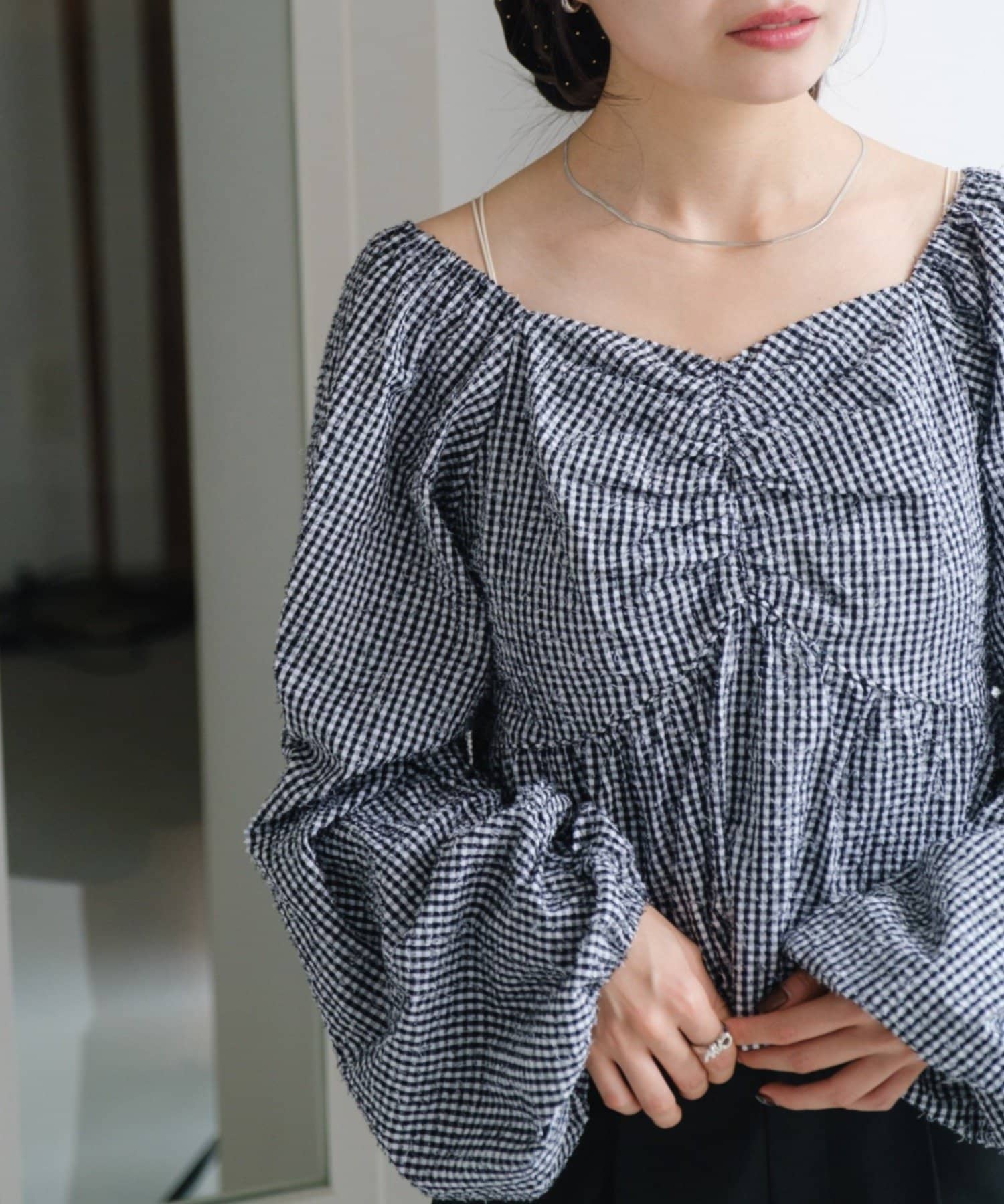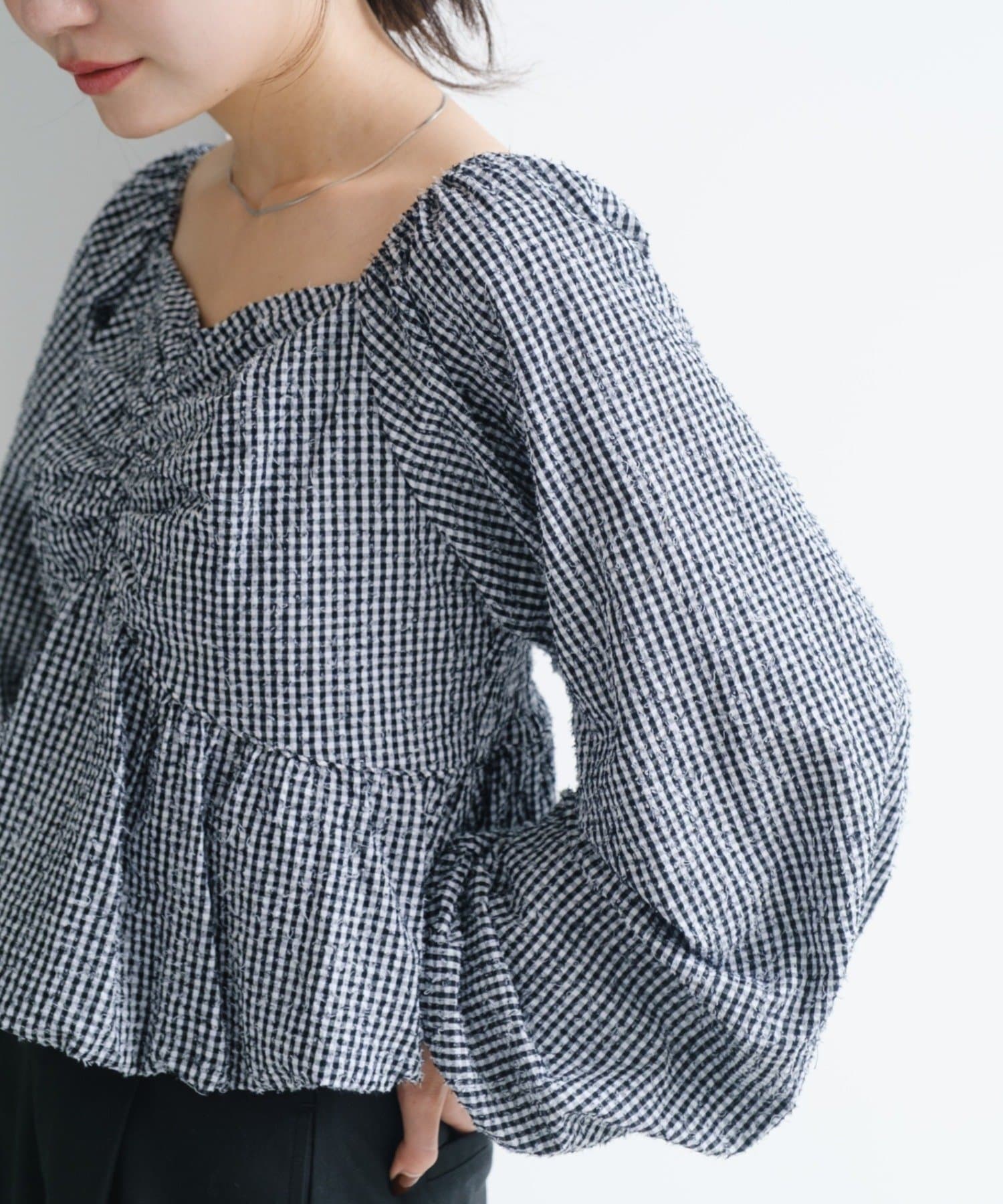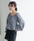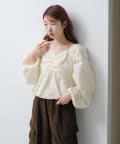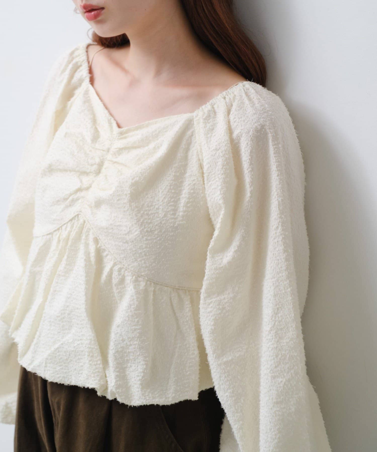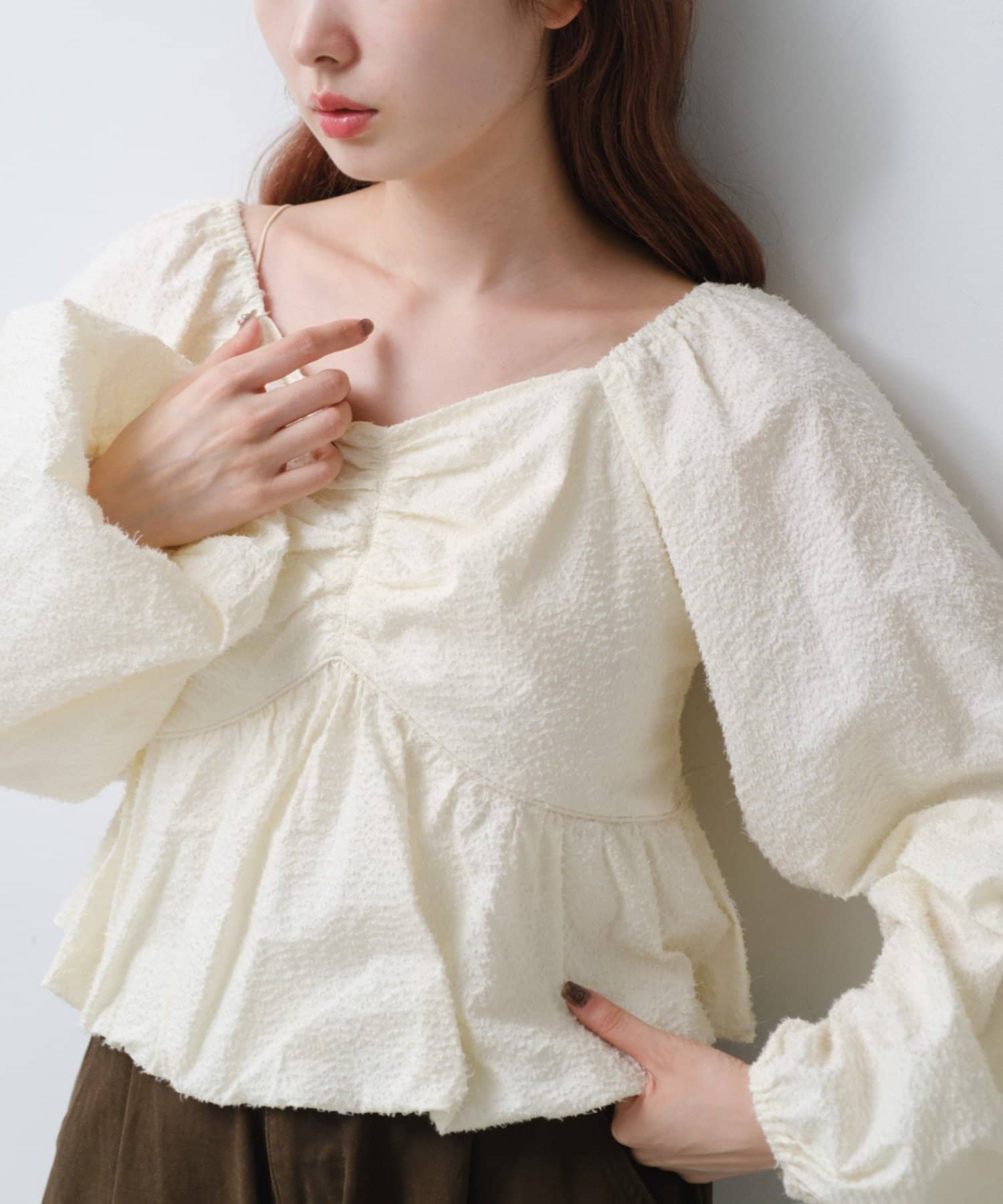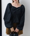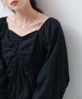 袖ボリュームが目を惹き、胸元には細やかなギャザーを寄せ、立体感のあるデザインに。