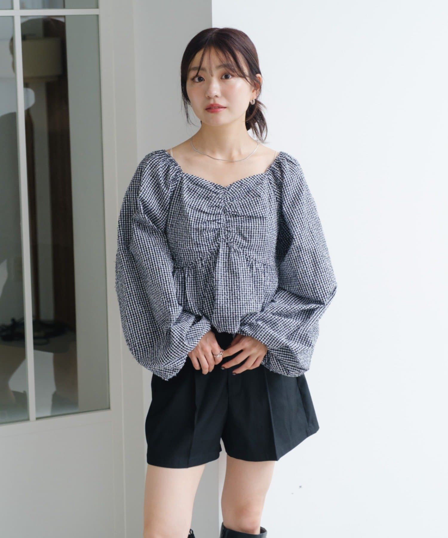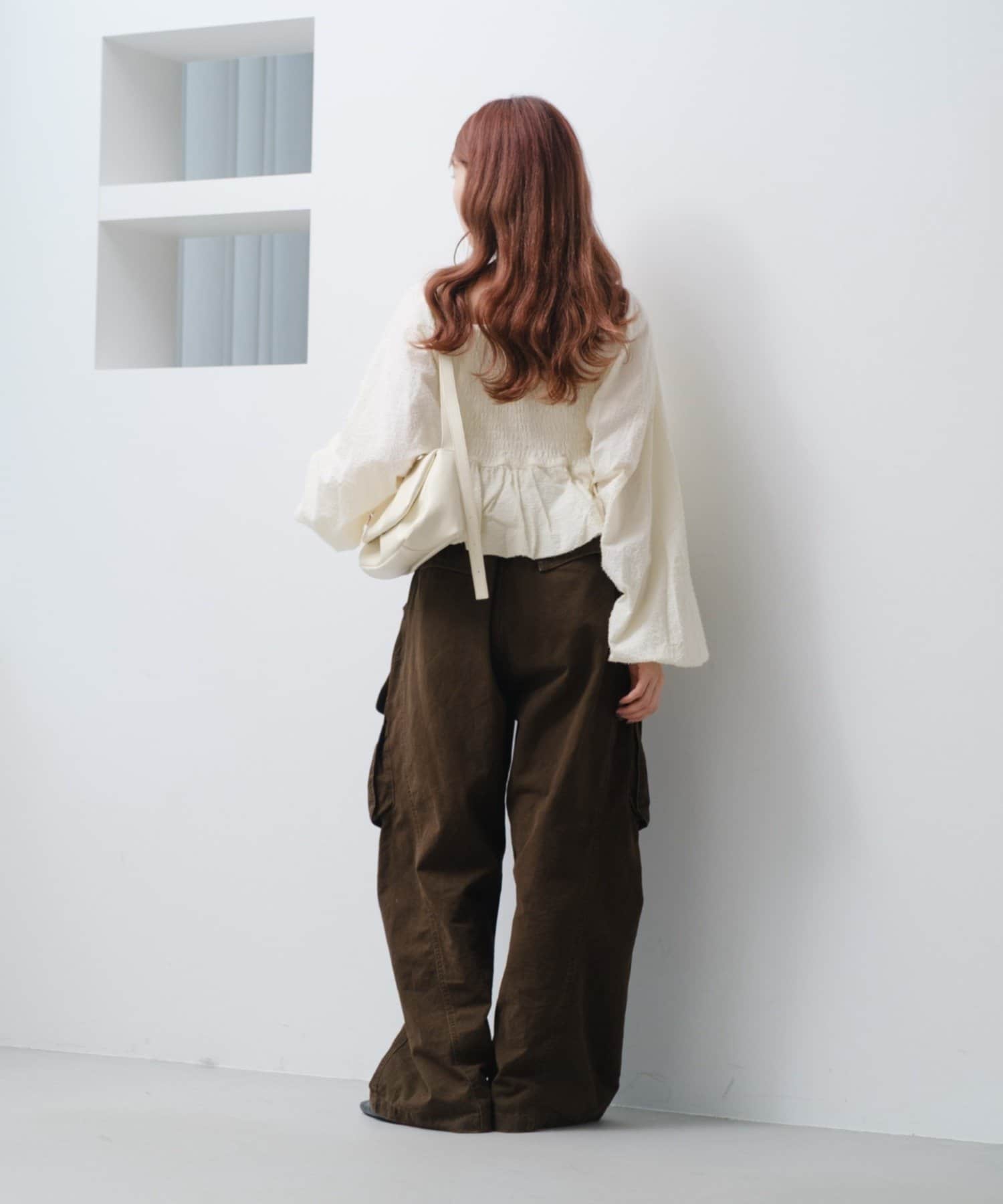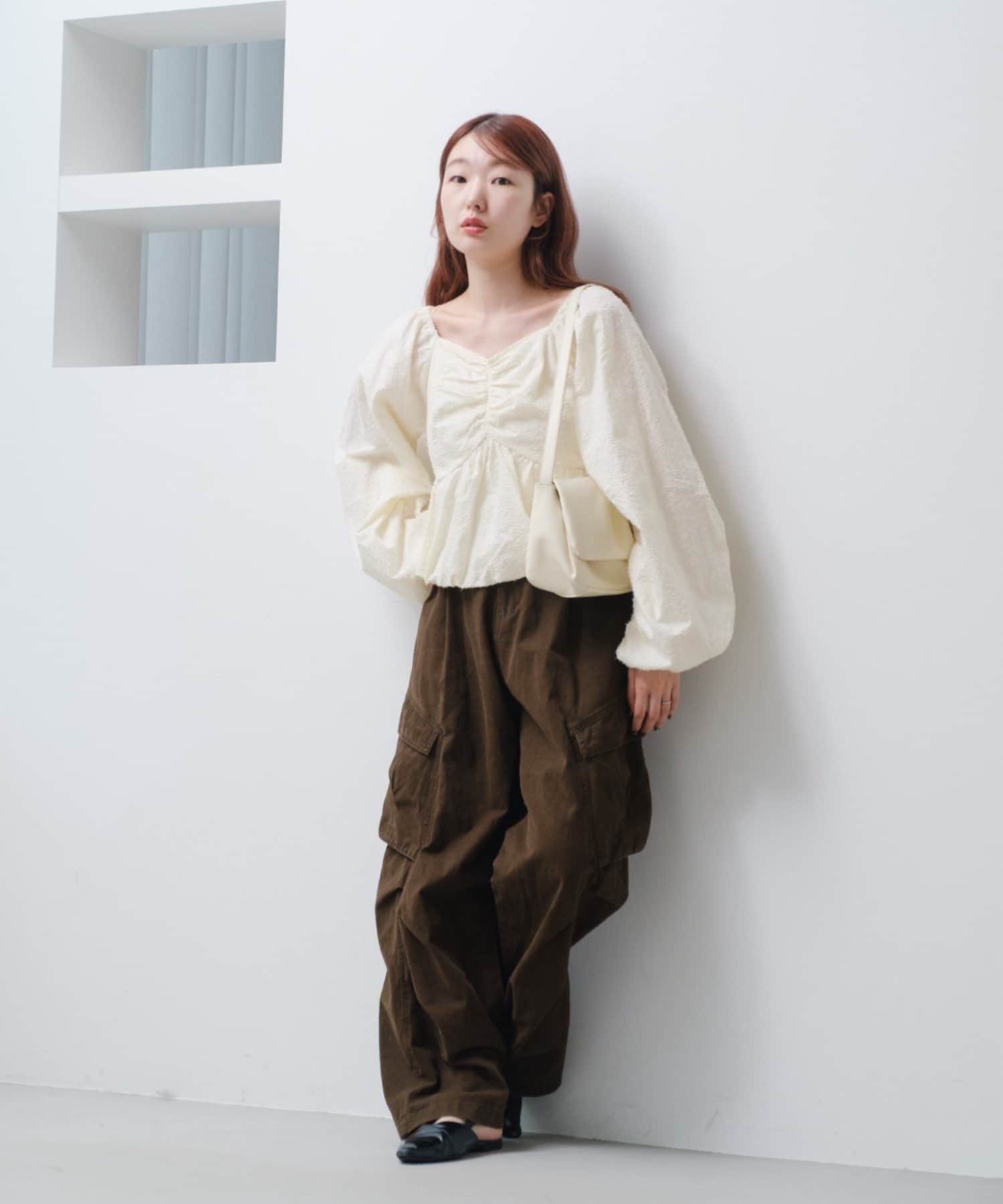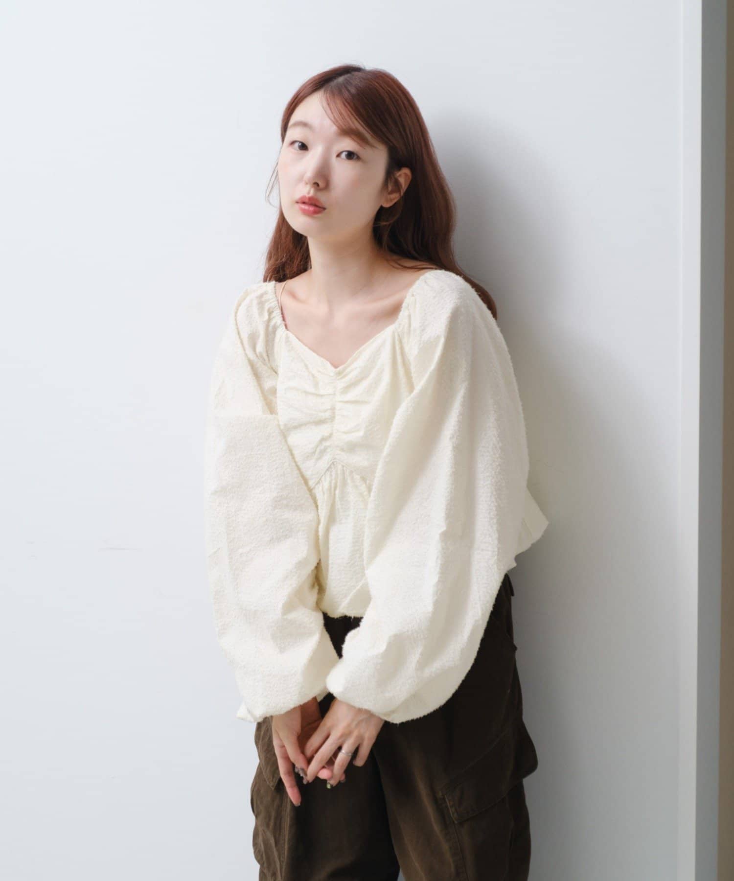 袖ボリュームが目を惹き、胸元には細やかなギャザーを寄せ、立体感のあるデザインに。