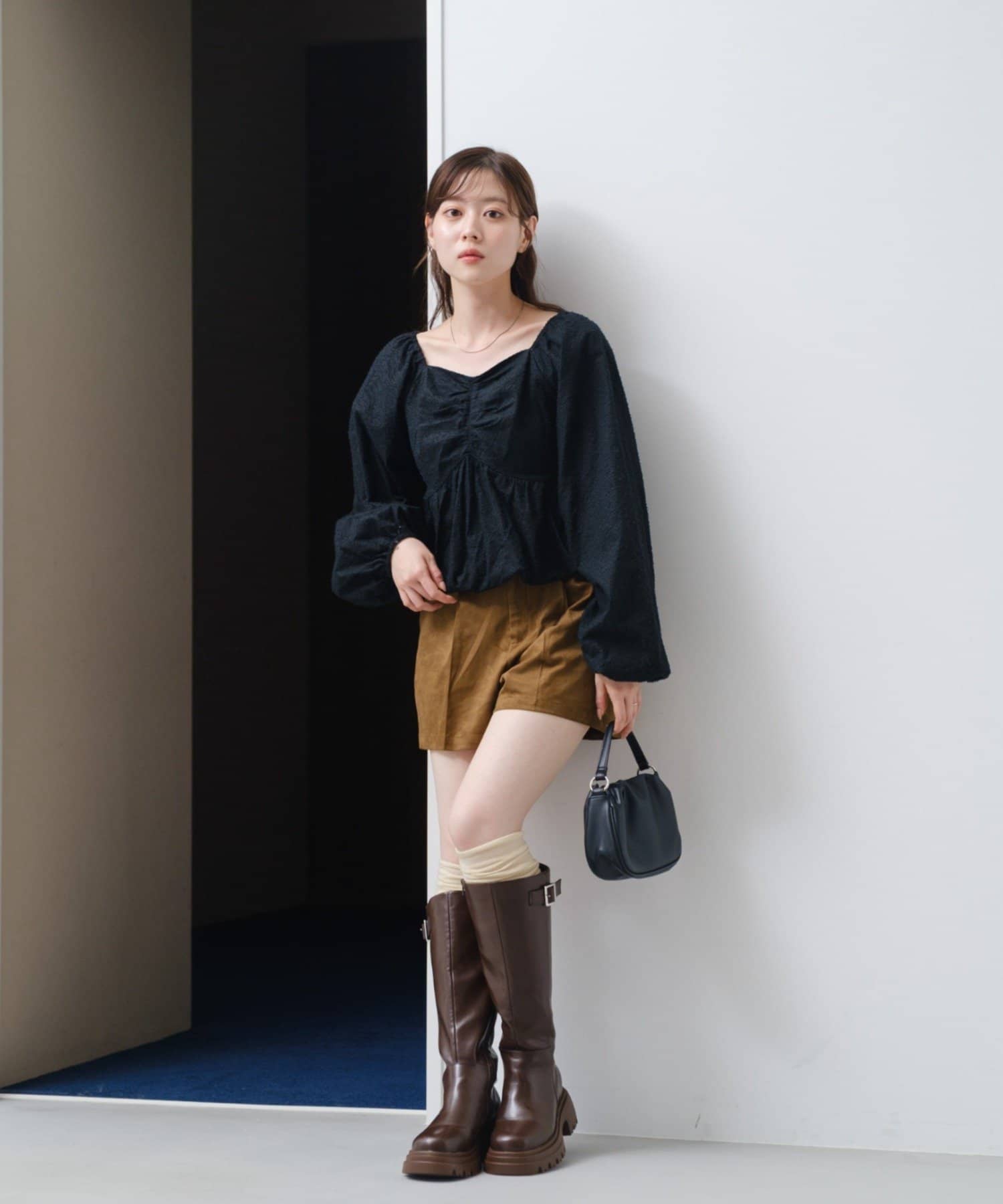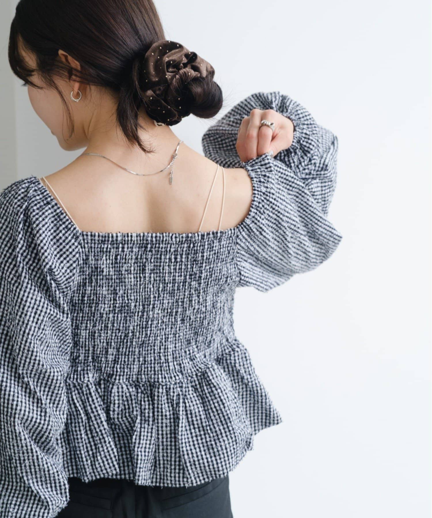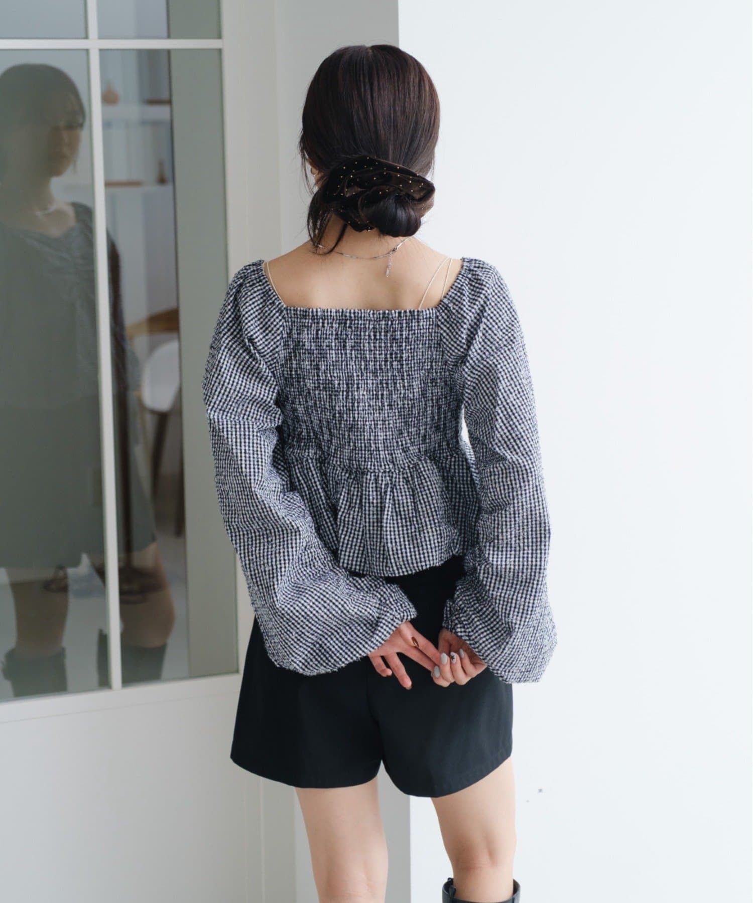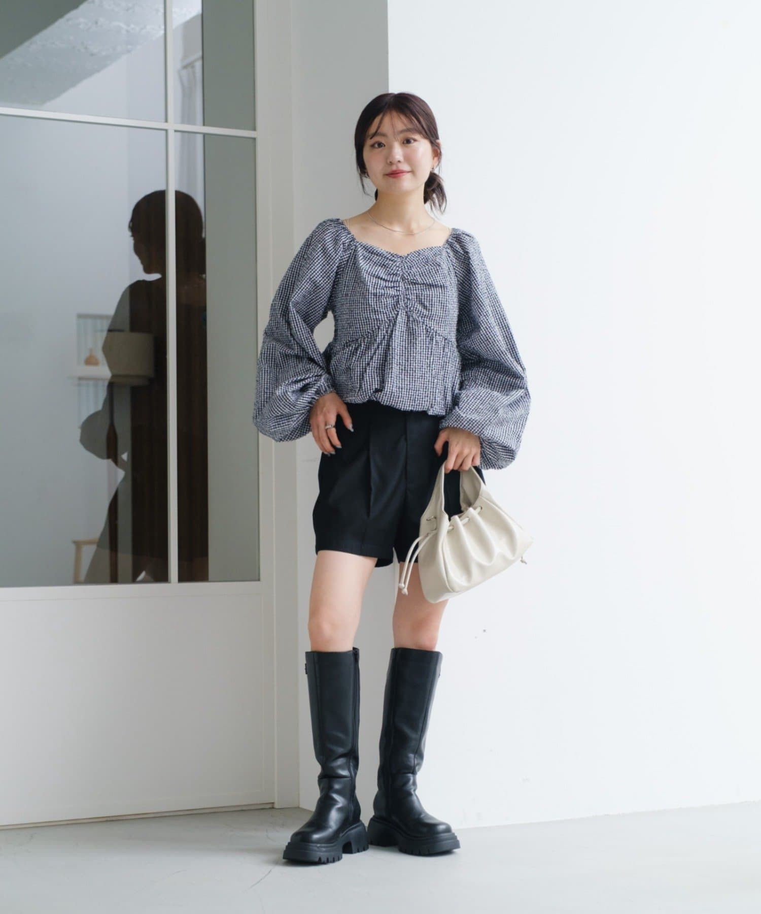 袖ボリュームが目を惹き、胸元には細やかなギャザーを寄せ、立体感のあるデザインに。