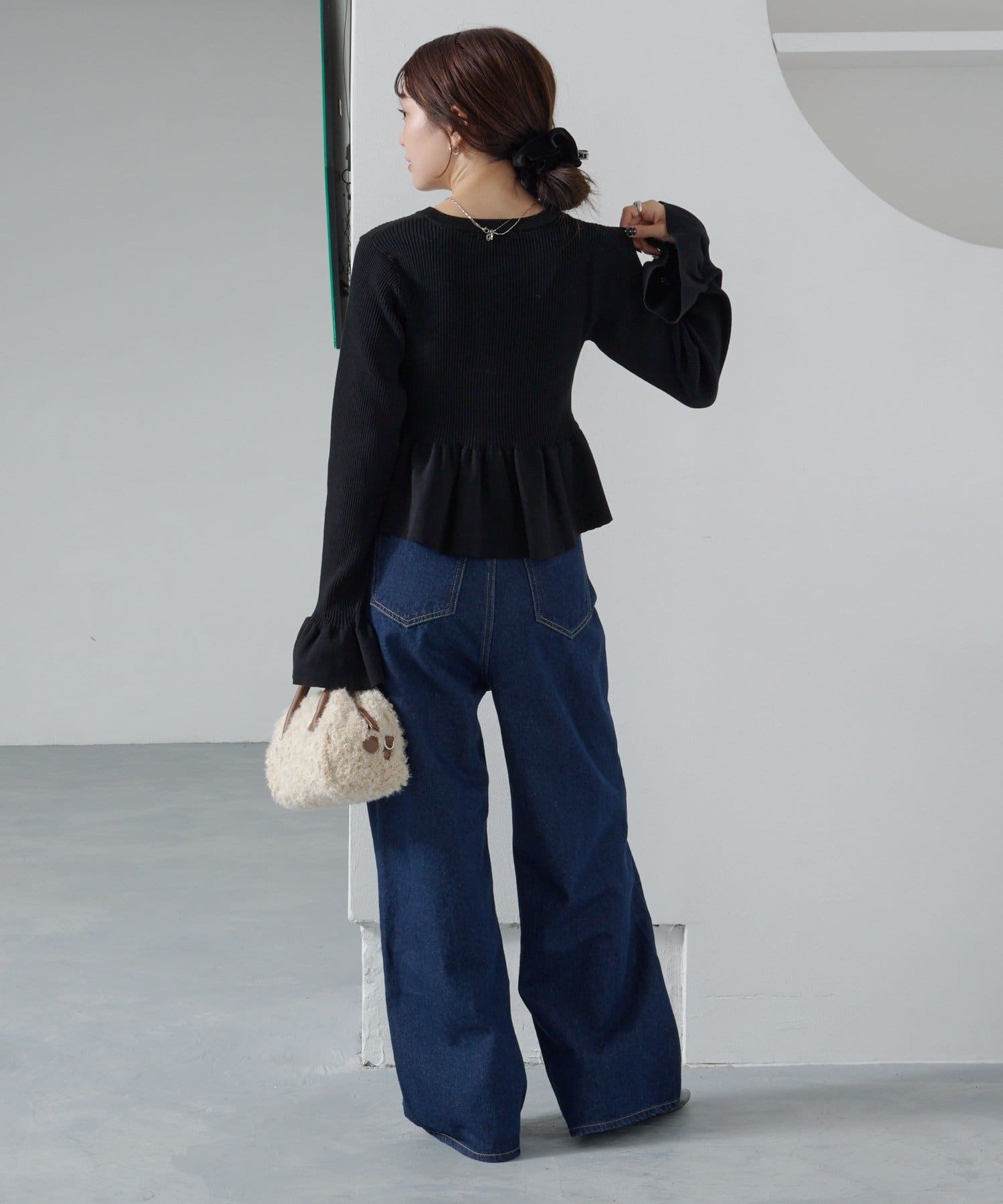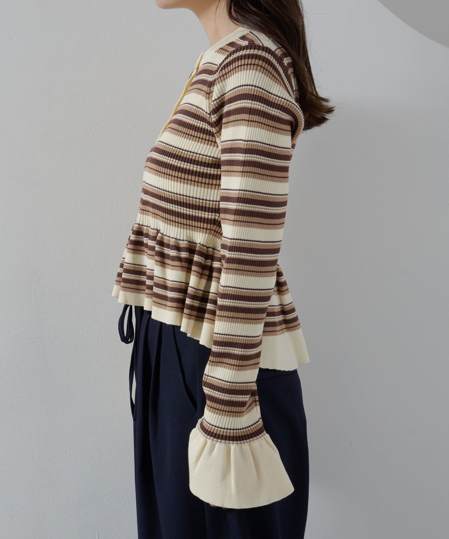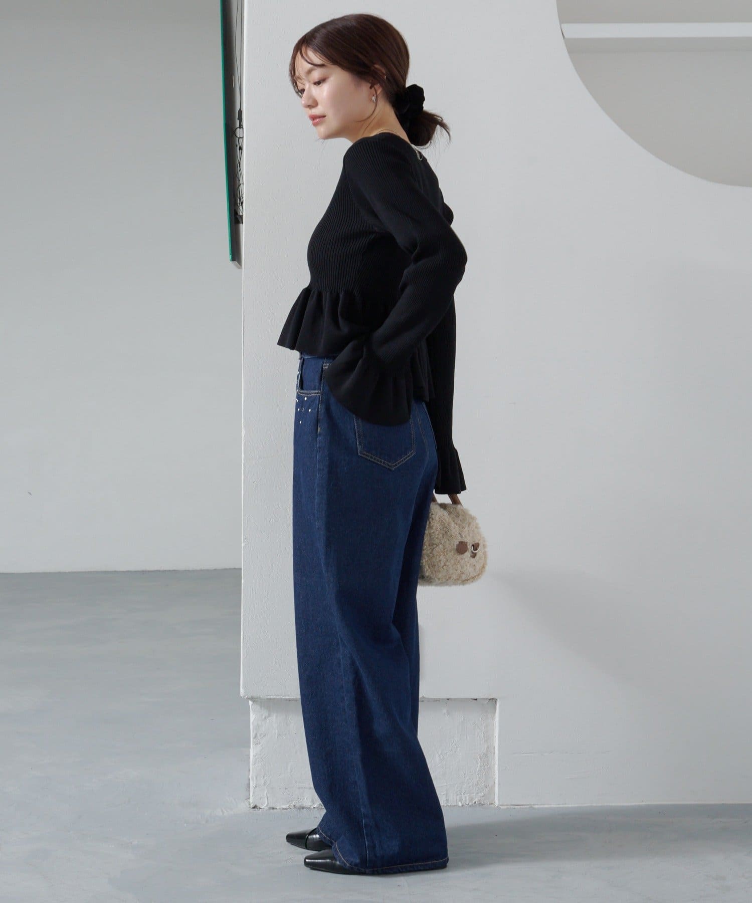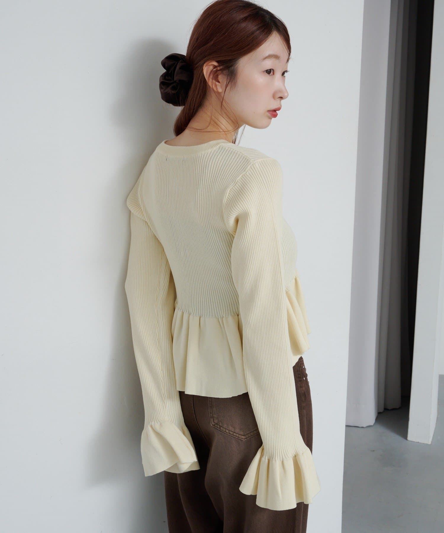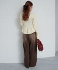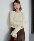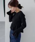 裾と袖口に施されたペプラム風のフリルが、シンプルながらもフェミニンな印象をプラス。