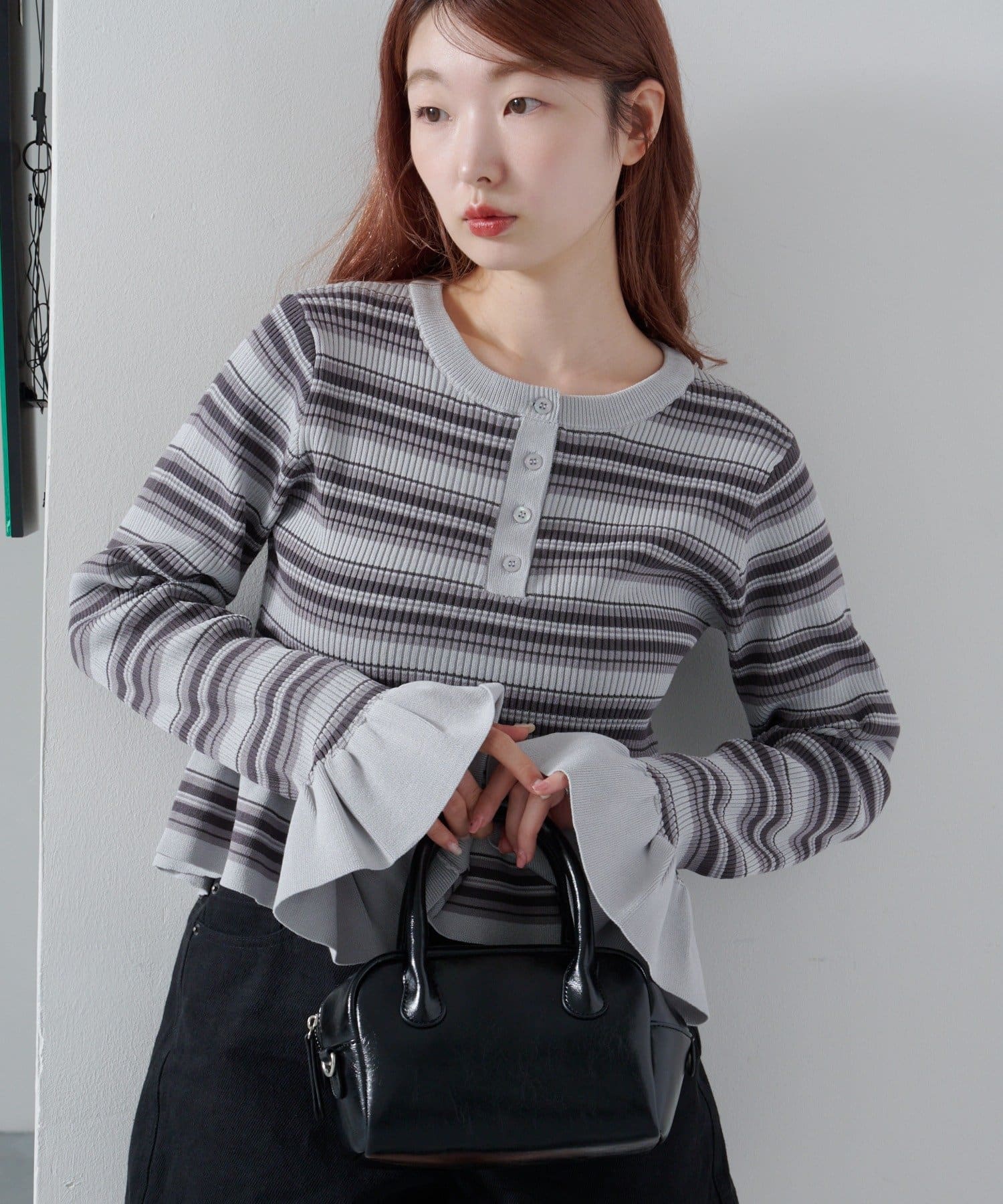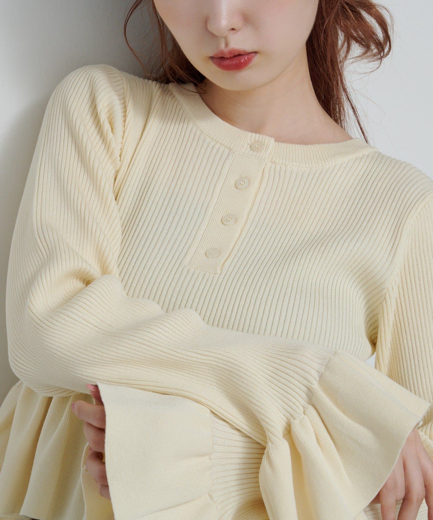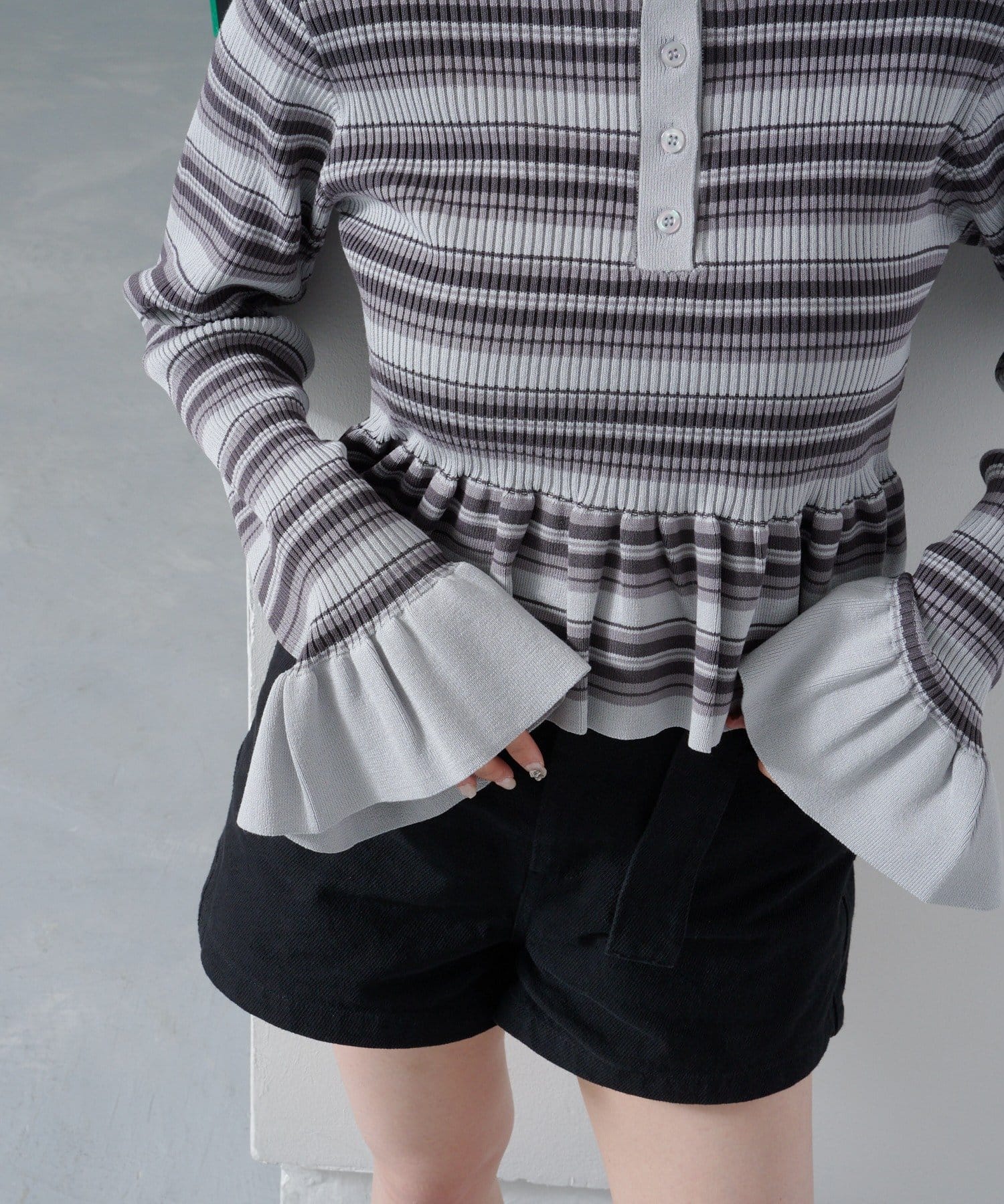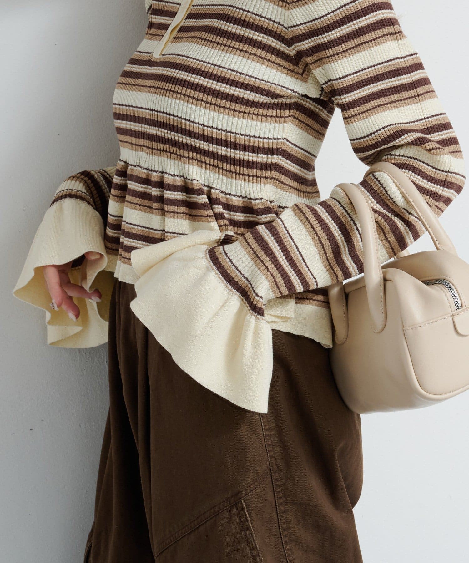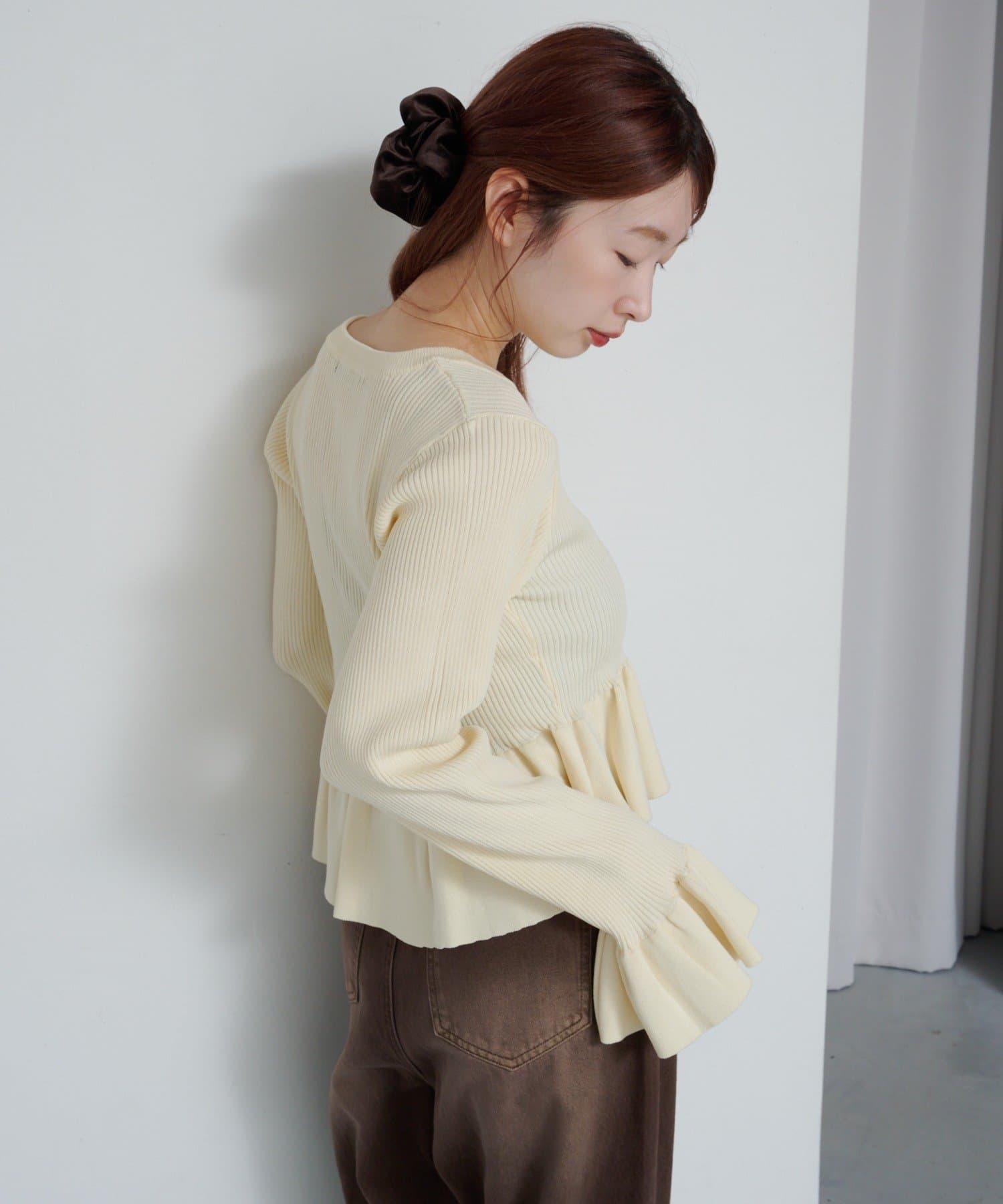 裾と袖口に施されたペプラム風のフリルが、シンプルながらもフェミニンな印象をプラス。