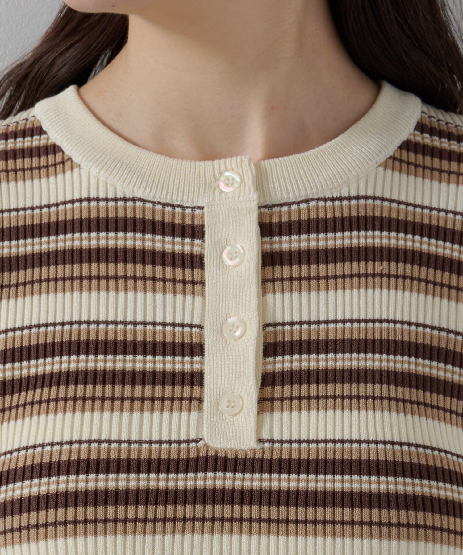 前立てのボタンがアクセントになったヘンリーネックニット。